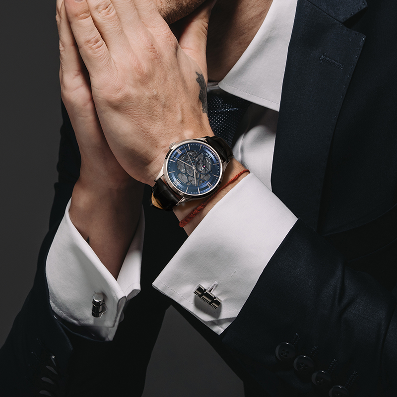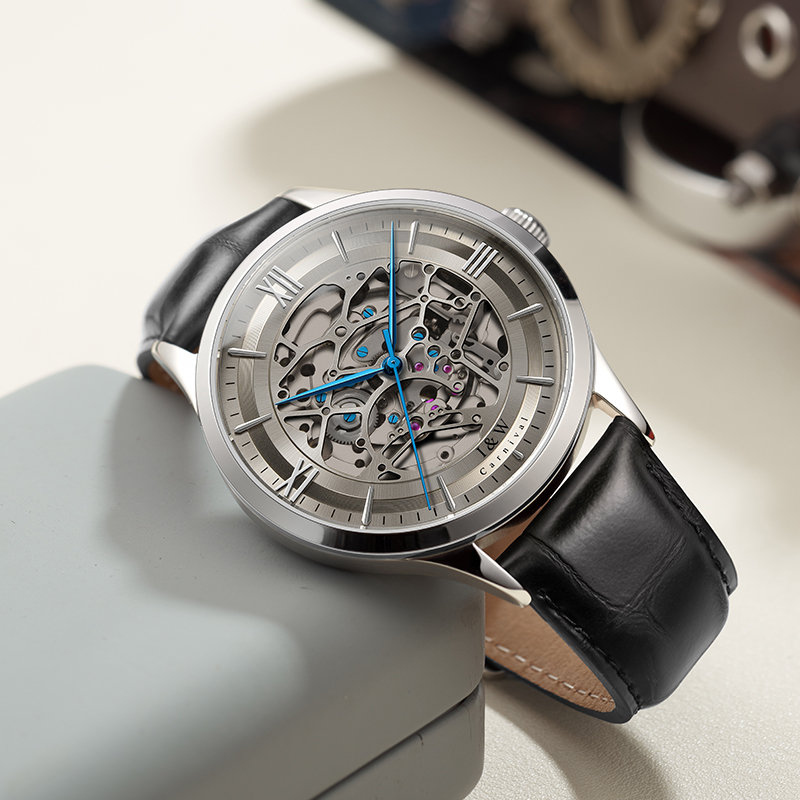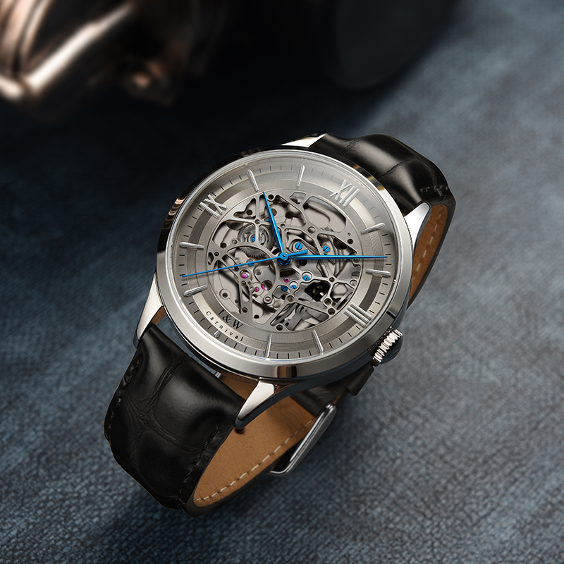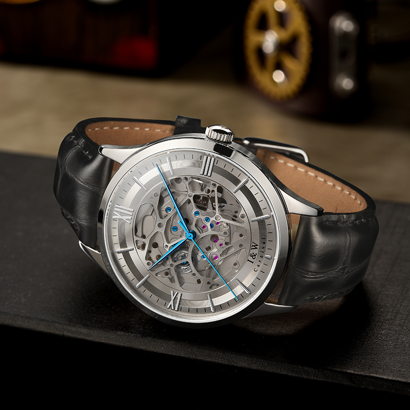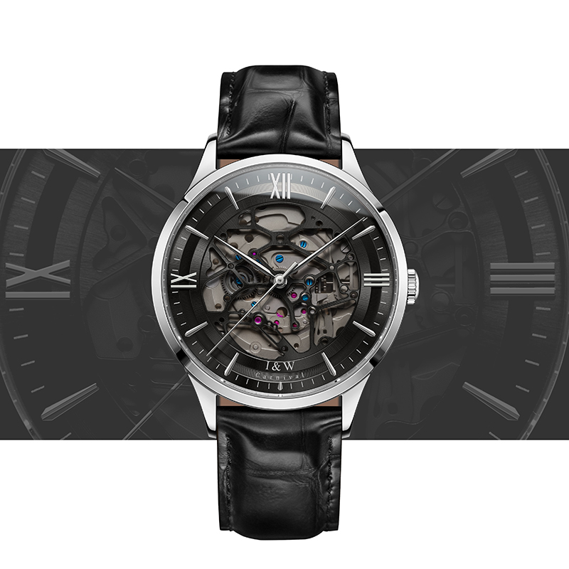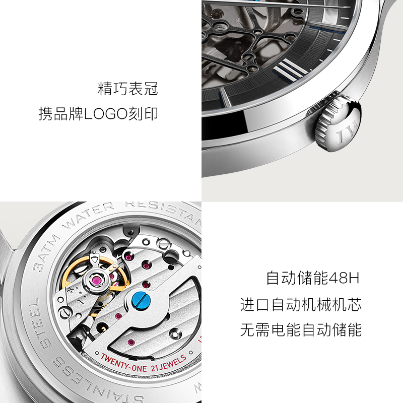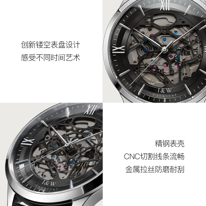 商品名称:I&W男士手表男表双面镂空机械表牛皮表带 爱沃驰 本色皮带蓝面