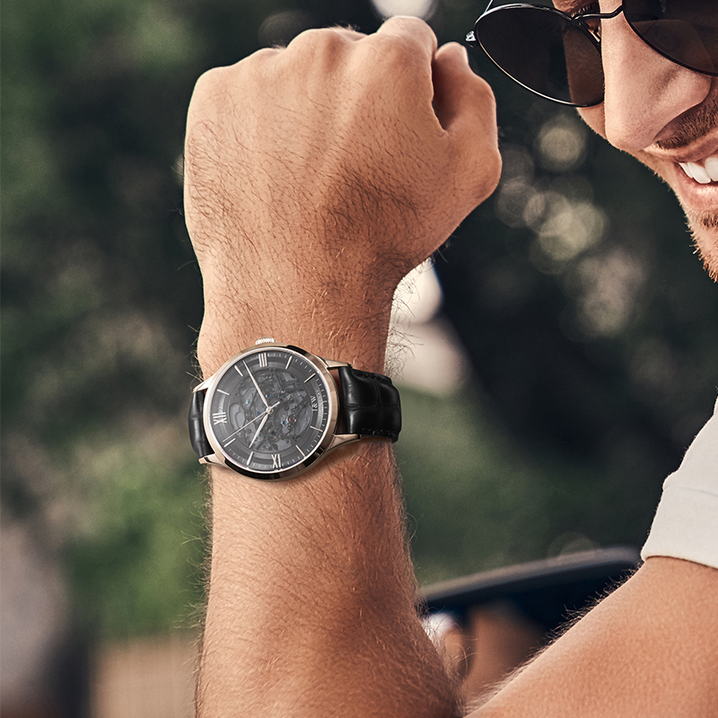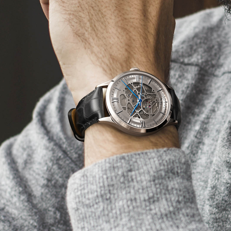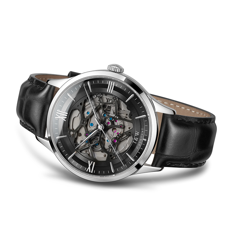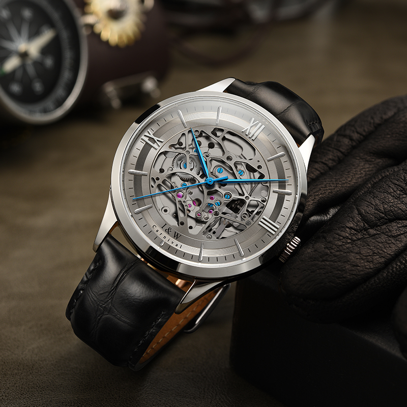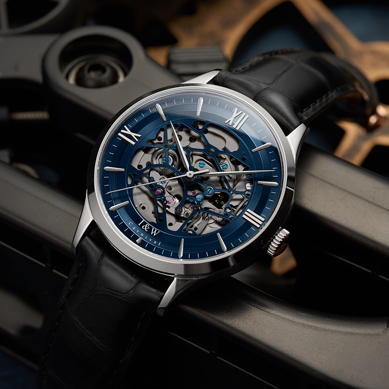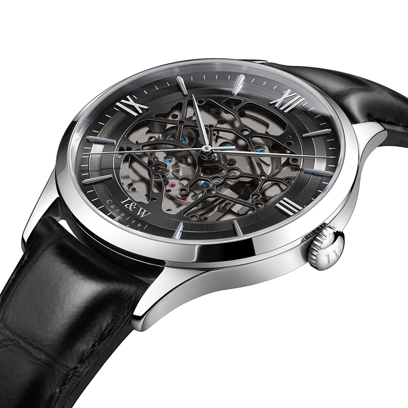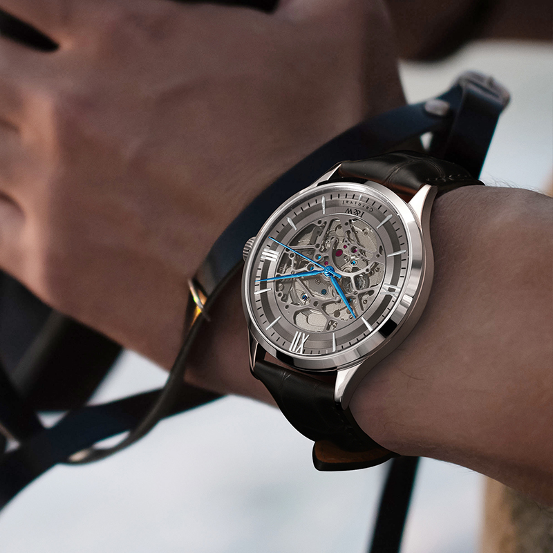 I&W男士手表男表双面镂空机械表牛皮表带 爱沃驰 本色皮带蓝面
