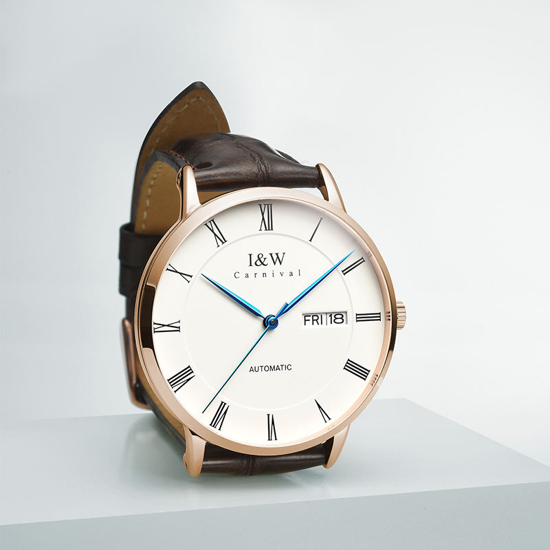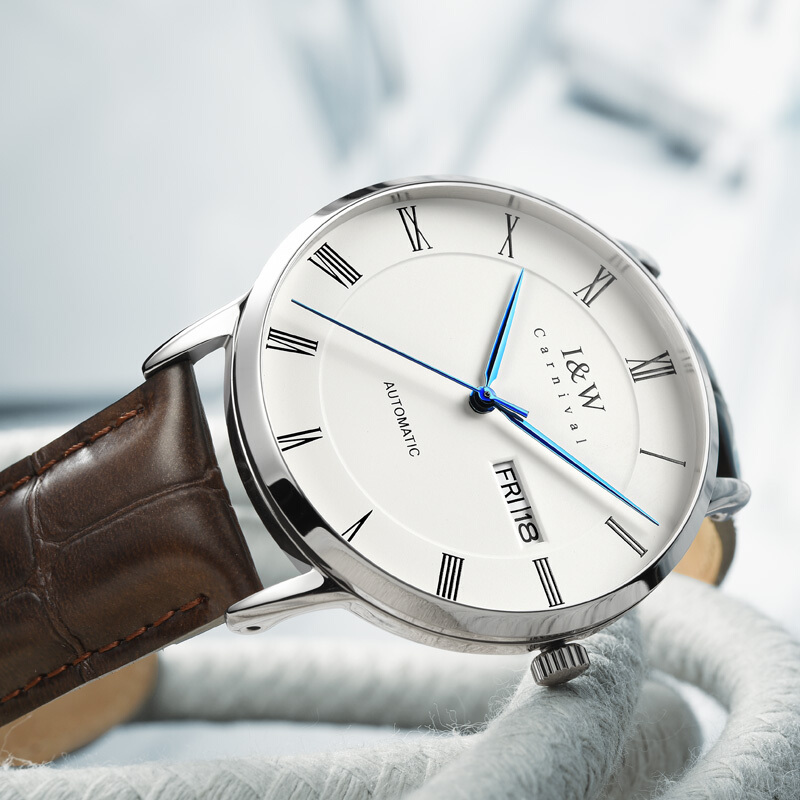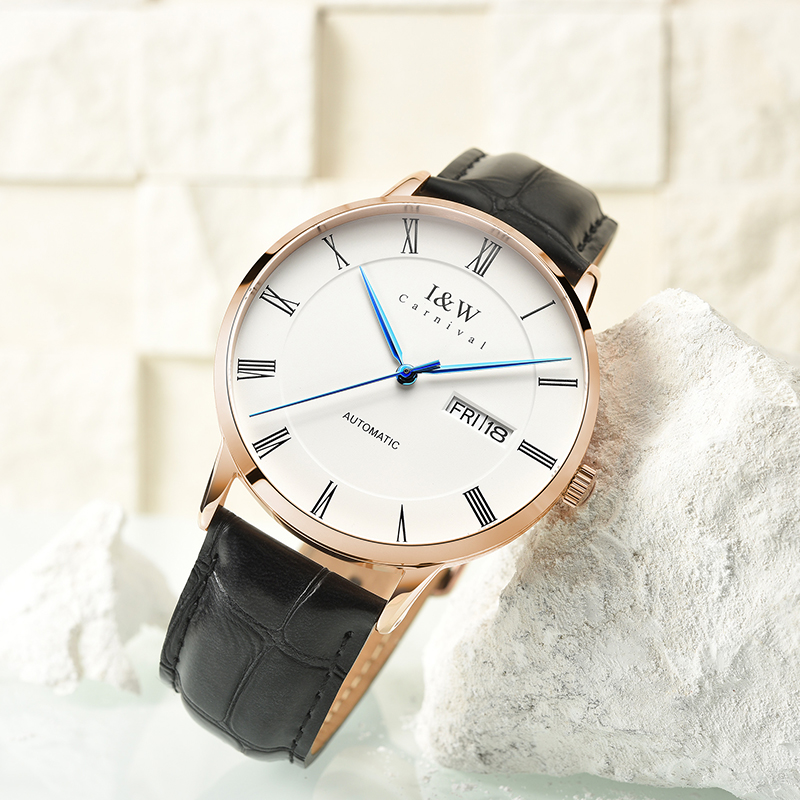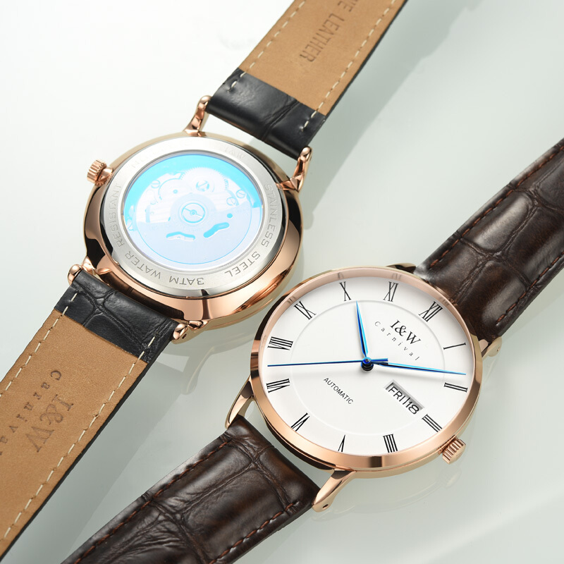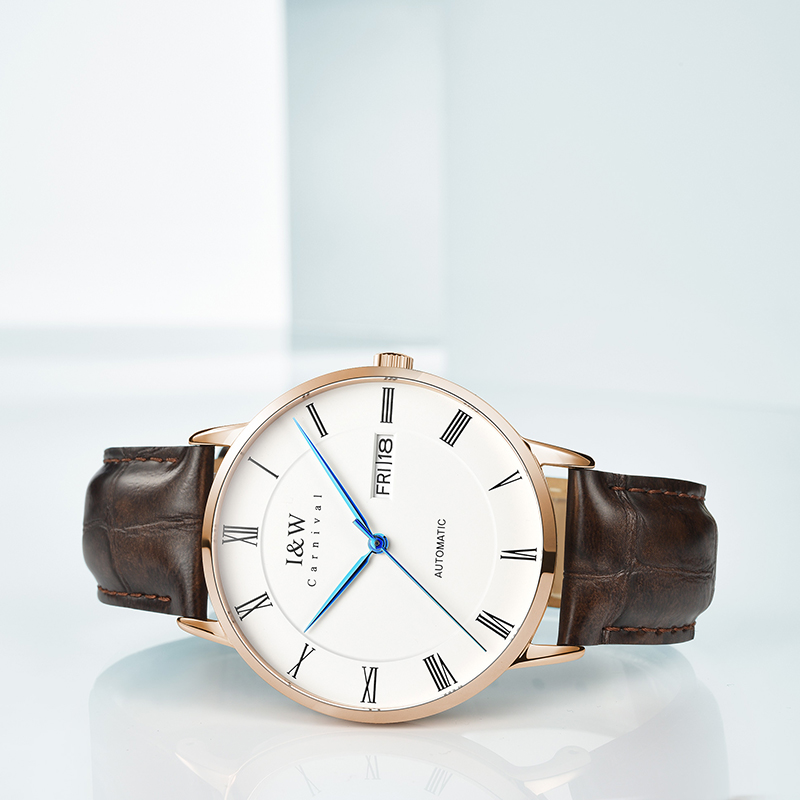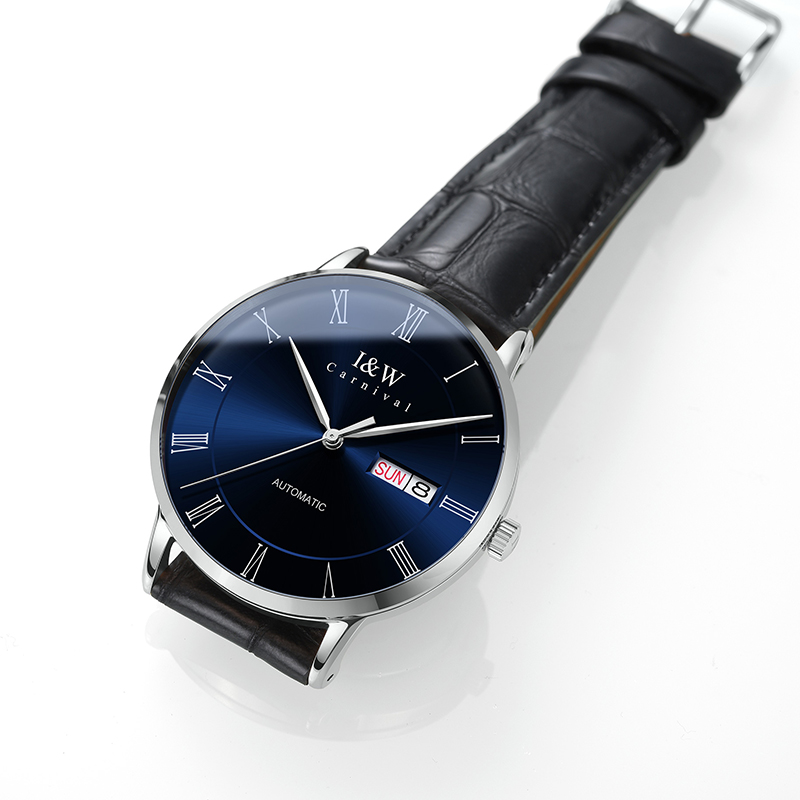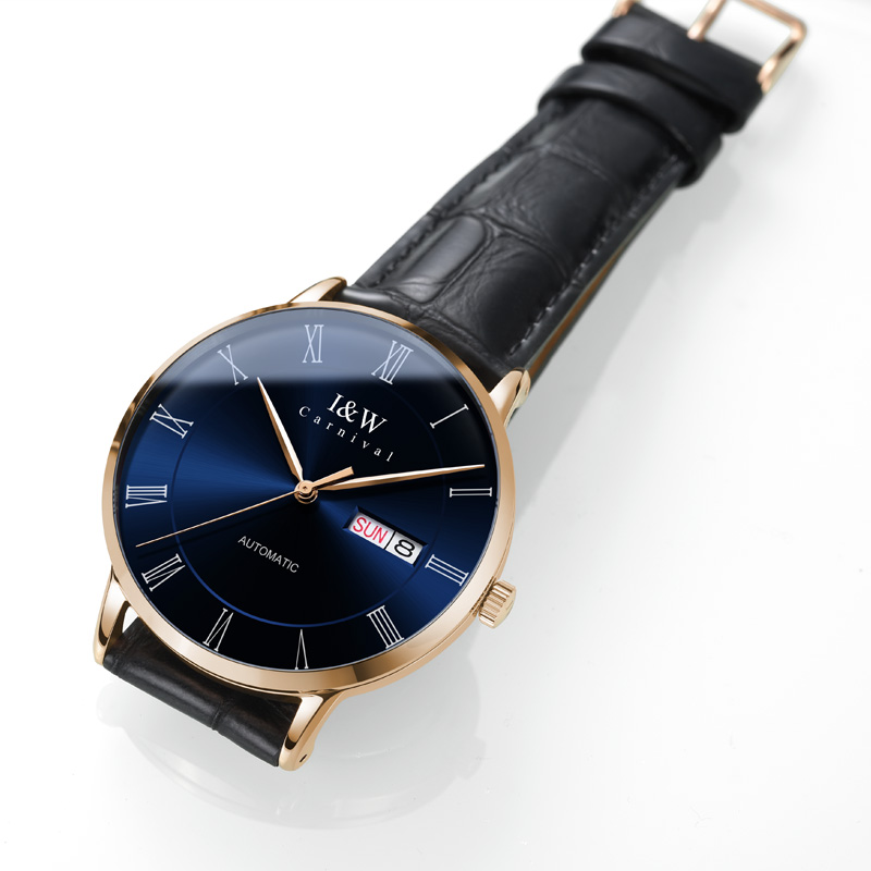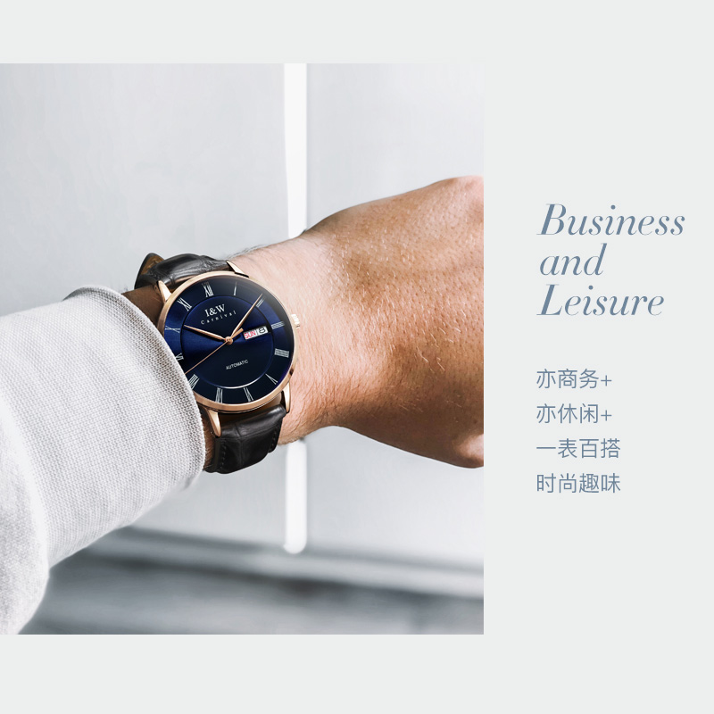 商品名称:I&W手表男士机械表全自动超薄进口机芯时尚简约商务罗马蓝宝石玻璃防水腕表 玫瑰金深蓝面 多色可选