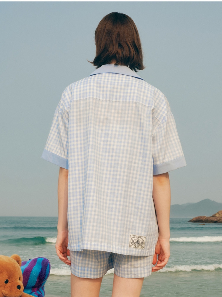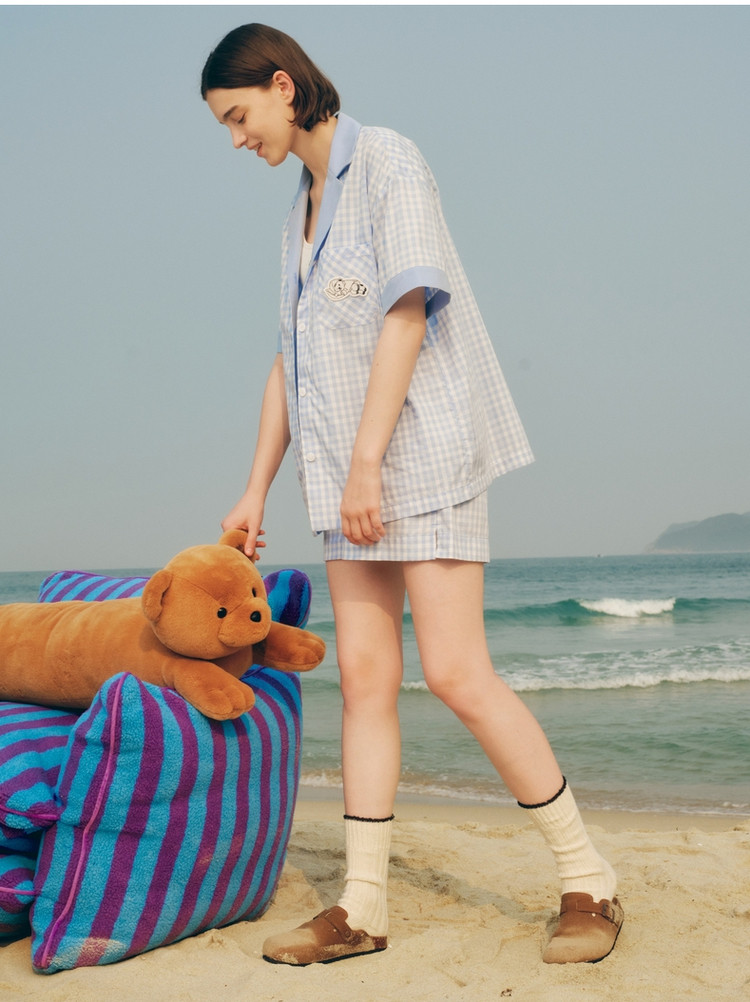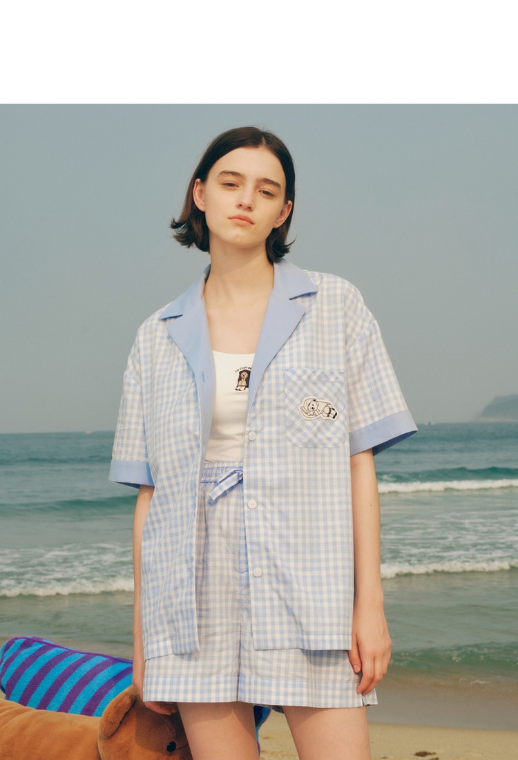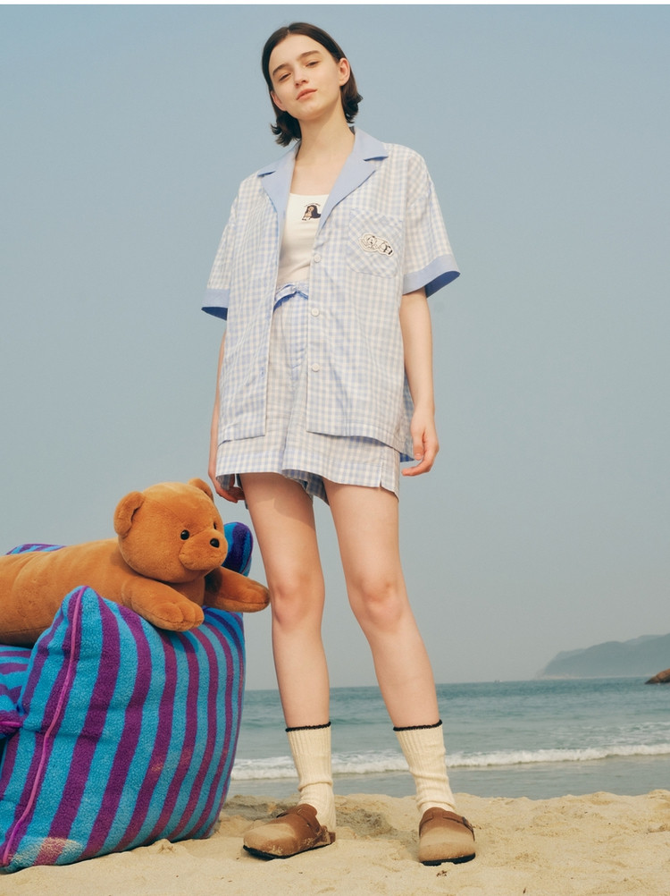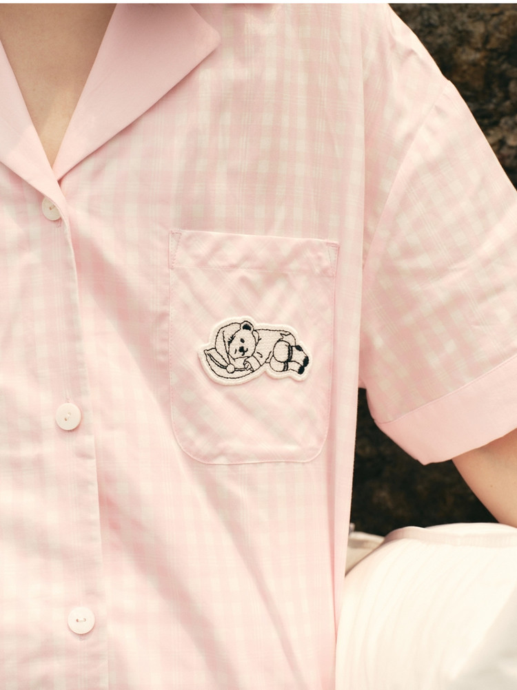 小熊抑菌功能性格纹短套装睡衣莱赛尔家居服女夏 516033
