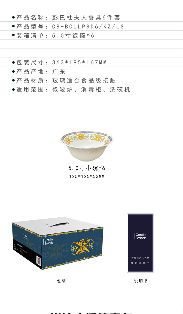 商品名称:康宁CB-BPBD6/KZ/LS冰萃玲珑 彭巴杜夫人餐具6件套 (5.0寸饭碗*6 125*1