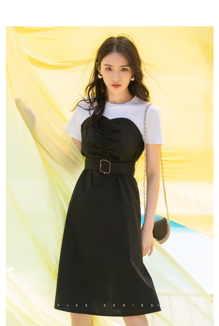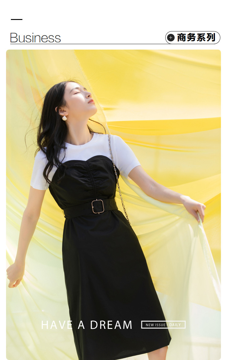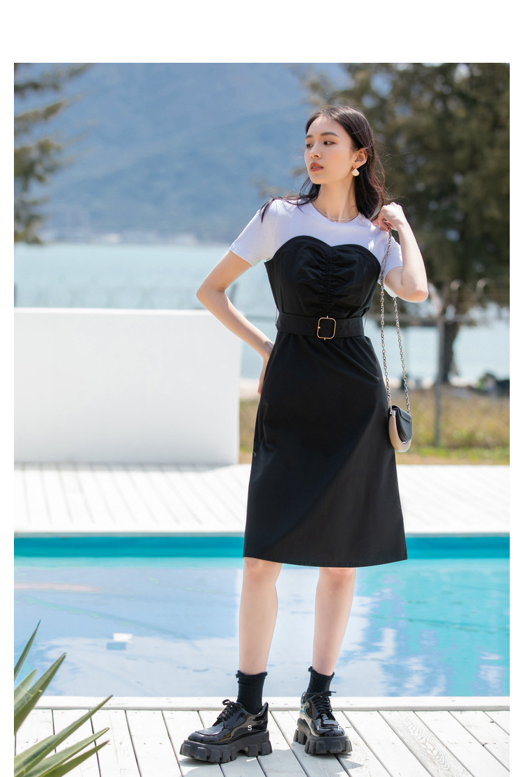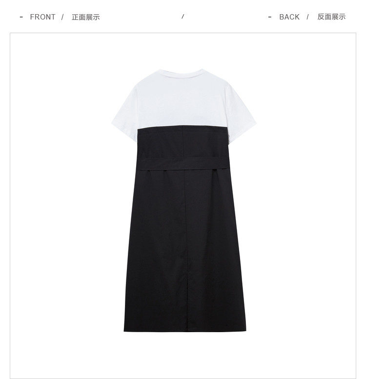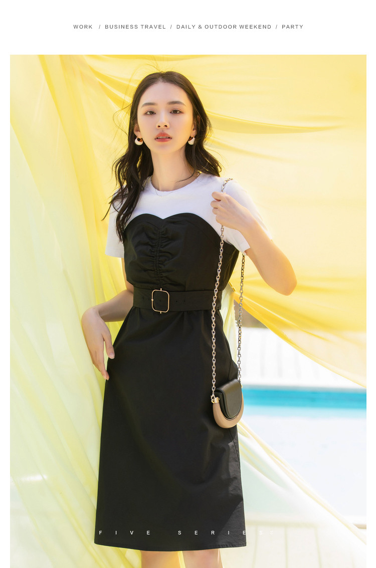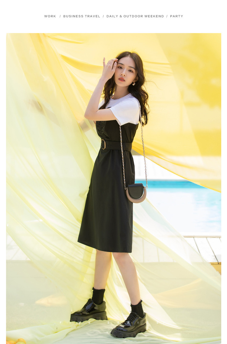 商品名称:拼接假两件连衣裙女夏款休闲设计感潮流中长裙撞色收腰圆领裙子女 157123