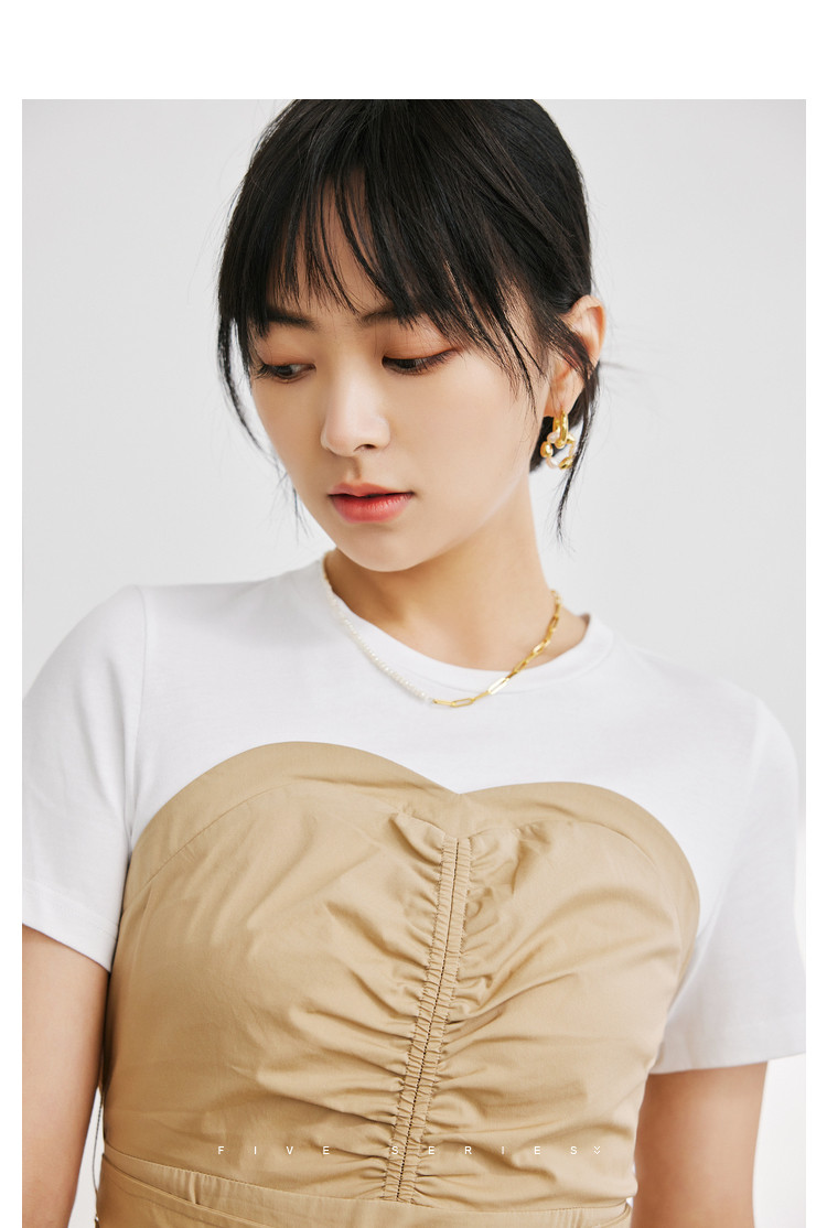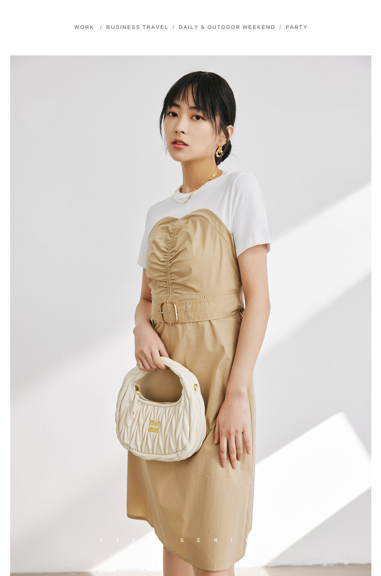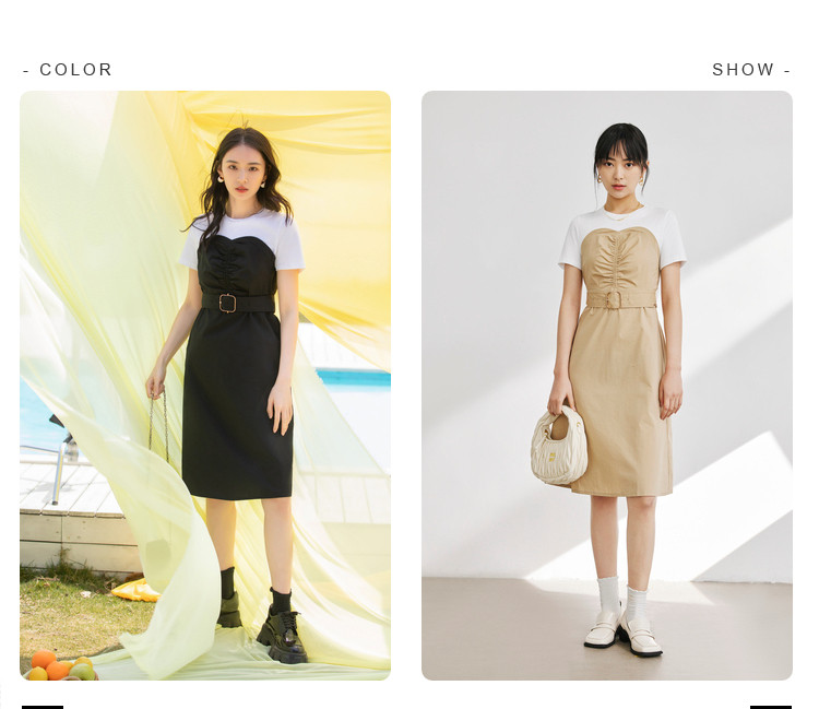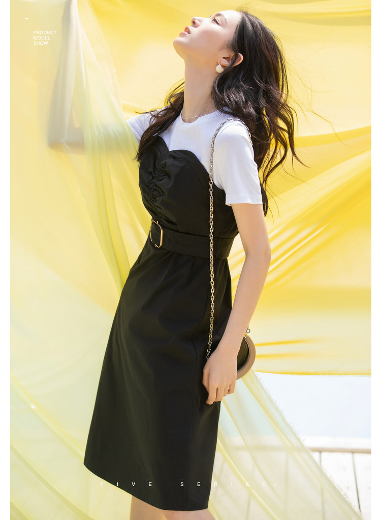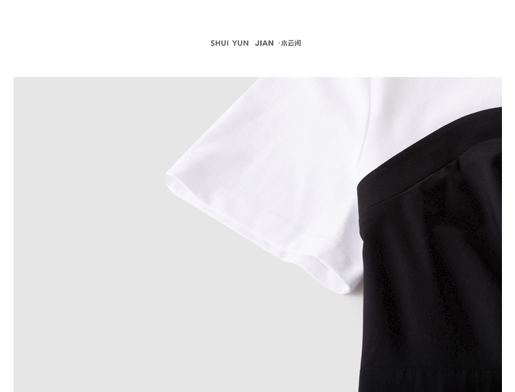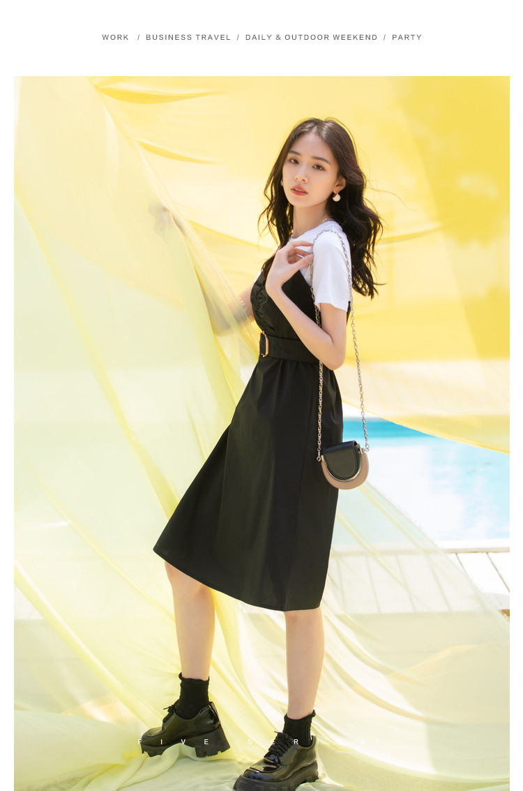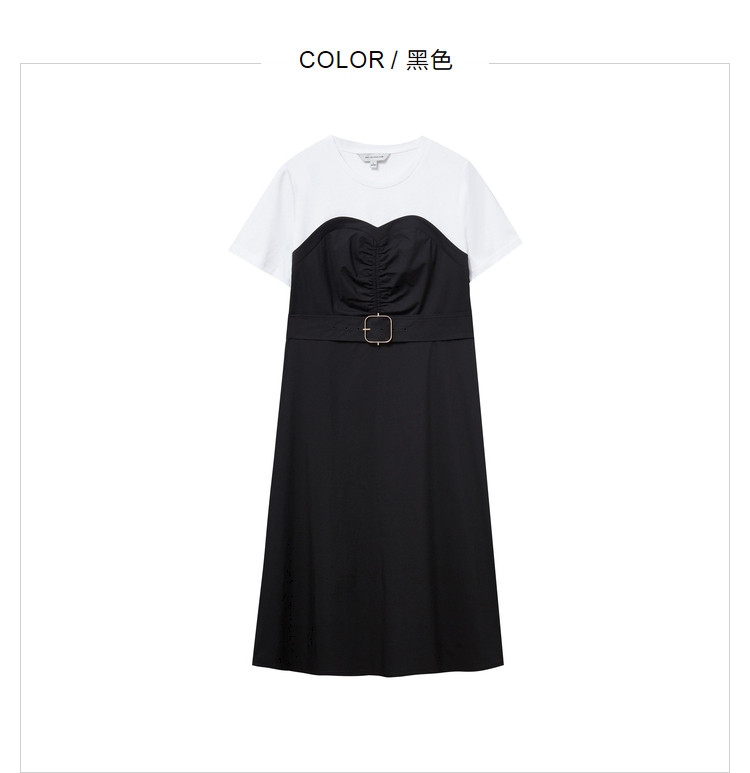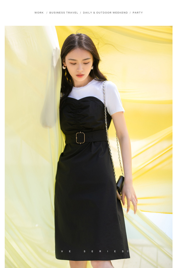 商品名称:拼接假两件连衣裙女夏款休闲设计感潮流中长裙撞色收腰圆领裙子女 157123