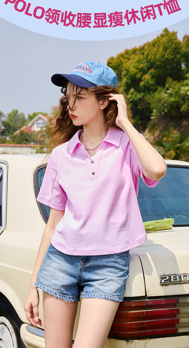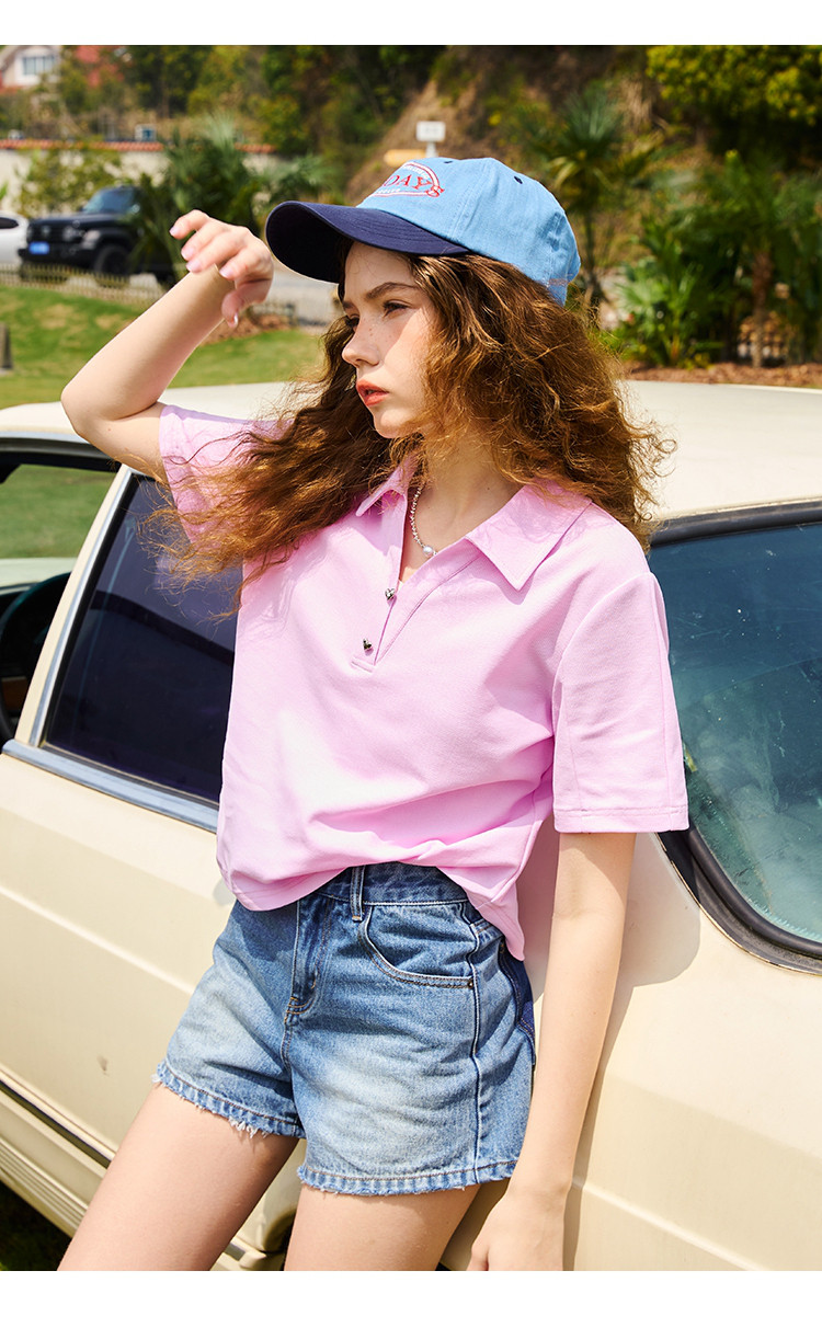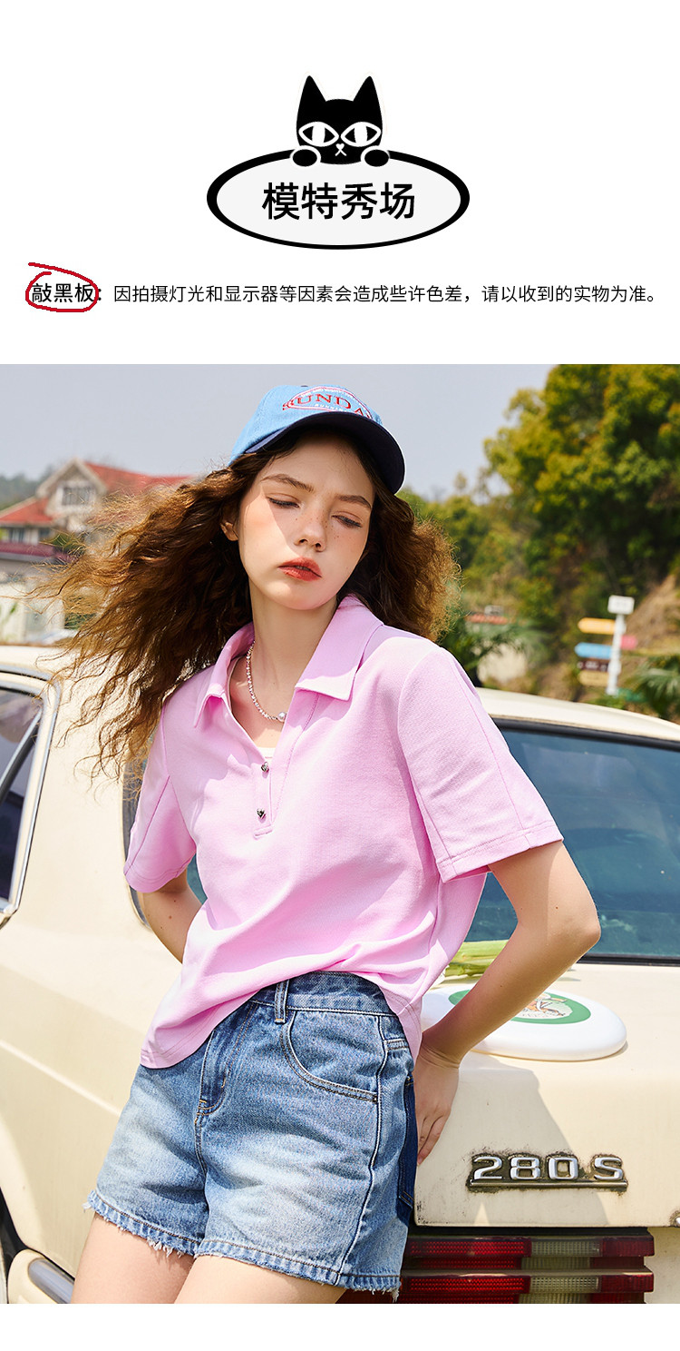 商品名称:夏季复古POLO领显瘦大码休闲百搭女式T恤 591261