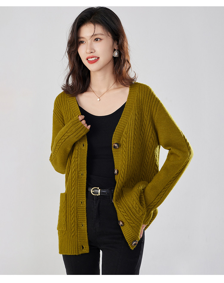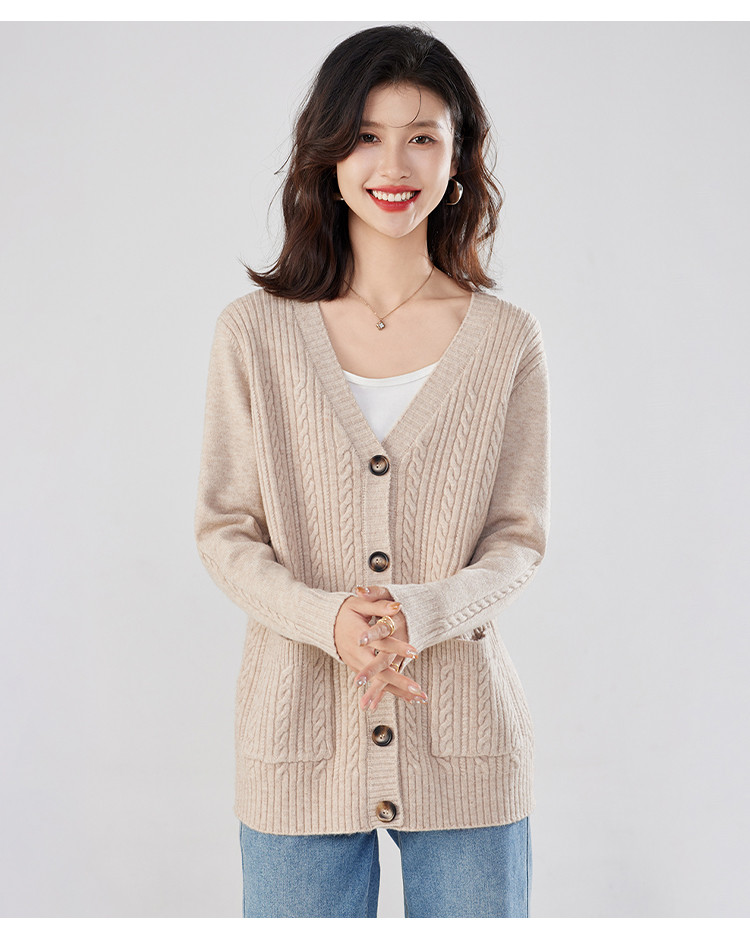 【气质V领中长款】基础通勤百搭针织开衫外套女复古扭花毛衣外套 717151