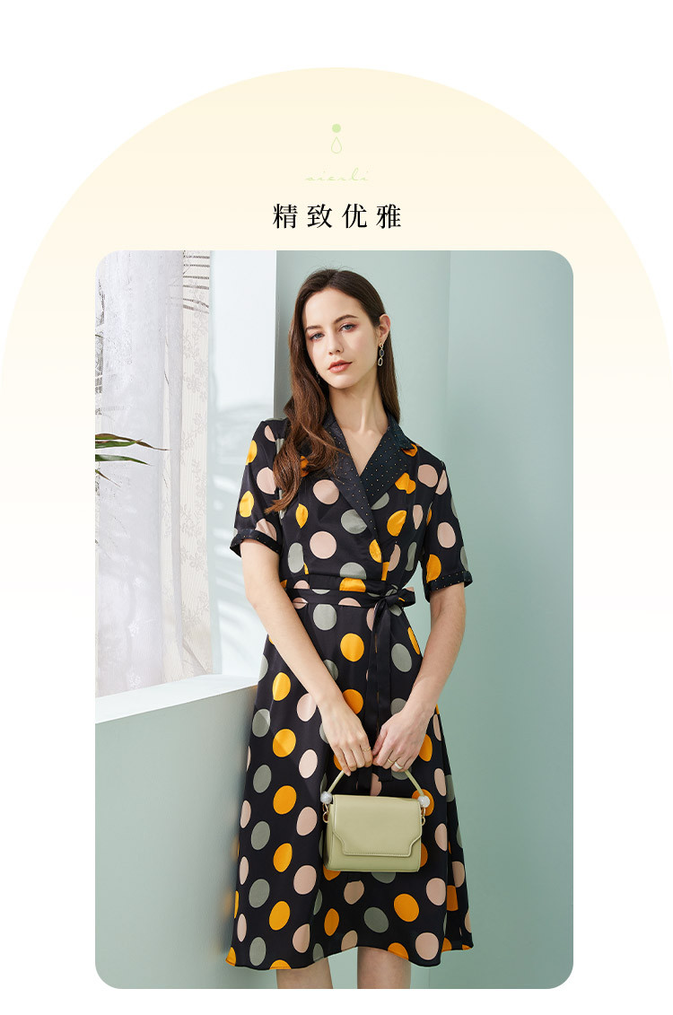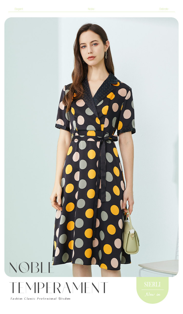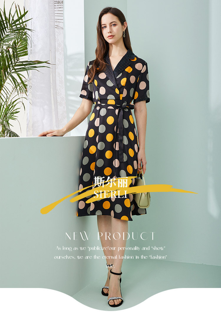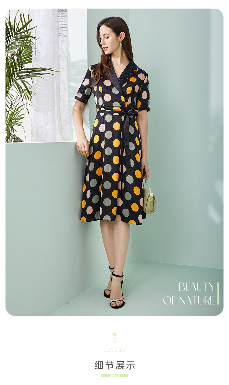 商品名称:商场同款秋季彩色不规则波点印花撞色烫钻西装领连衣裙 963551