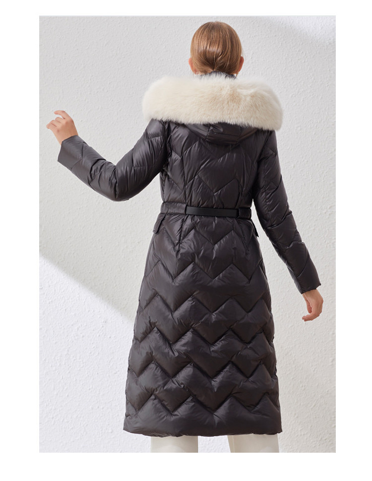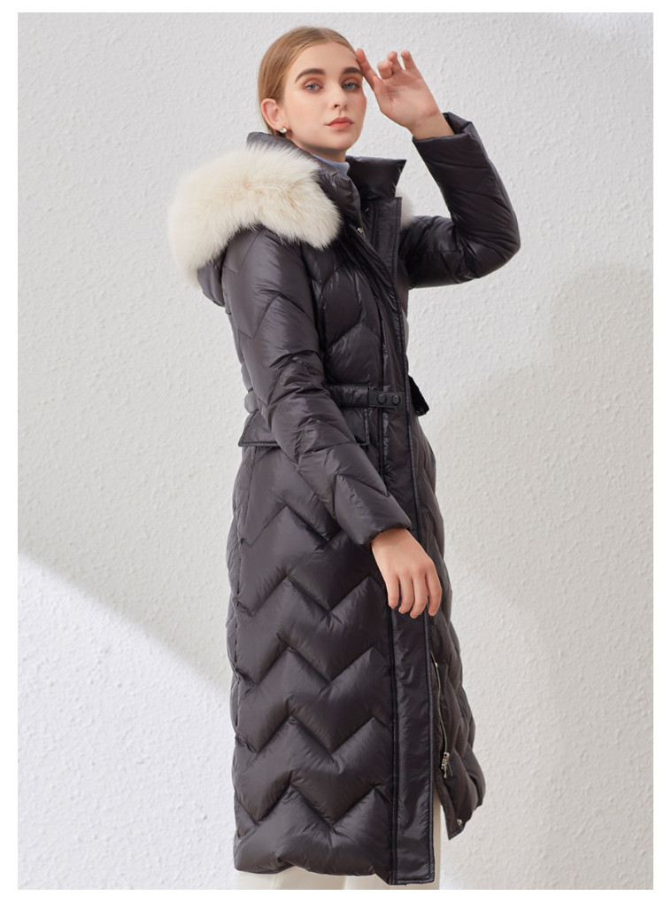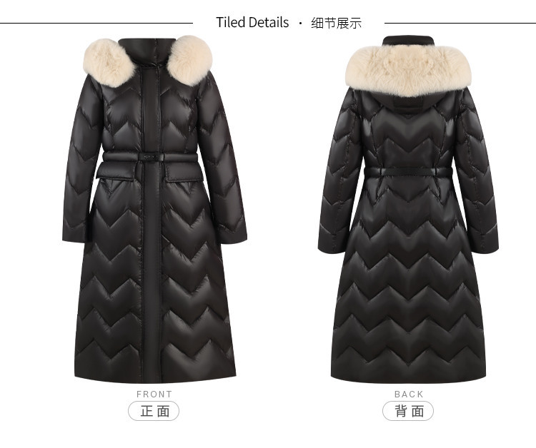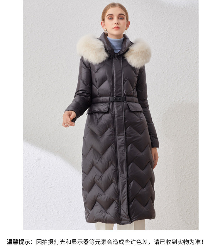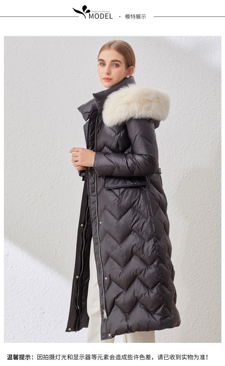 商品名称:【好物推荐】天然狐狸毛领翻盖口袋连帽保暖长款女修身显瘦羽绒服 109599