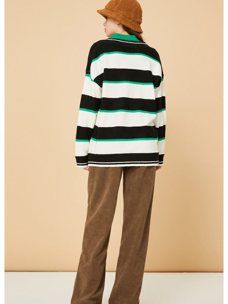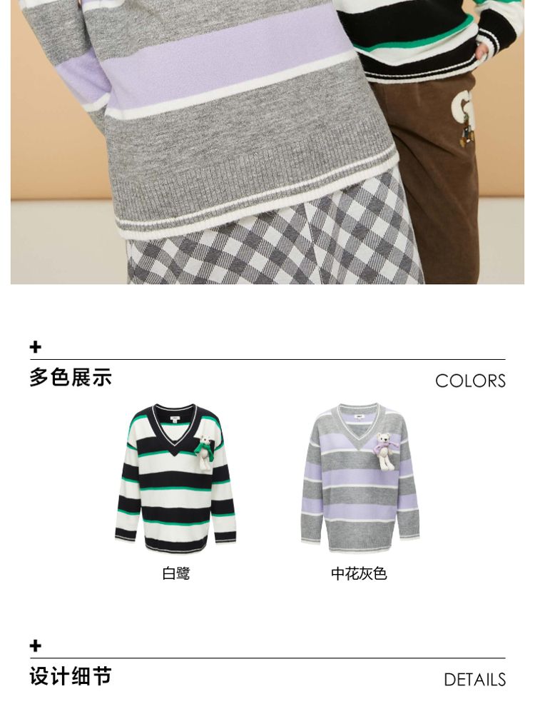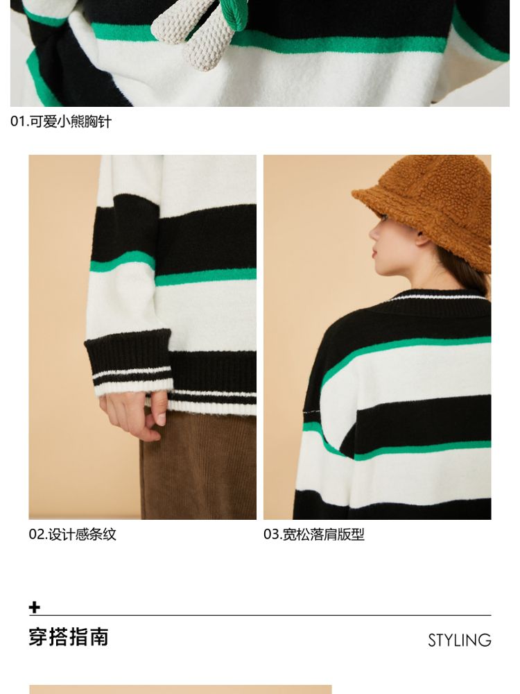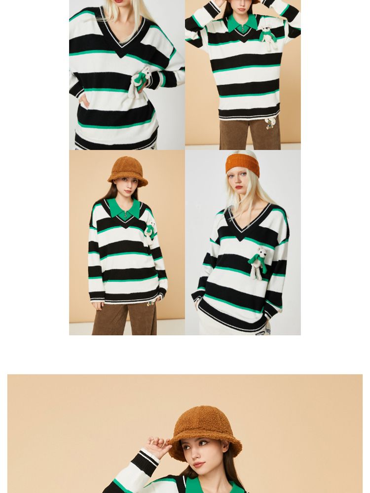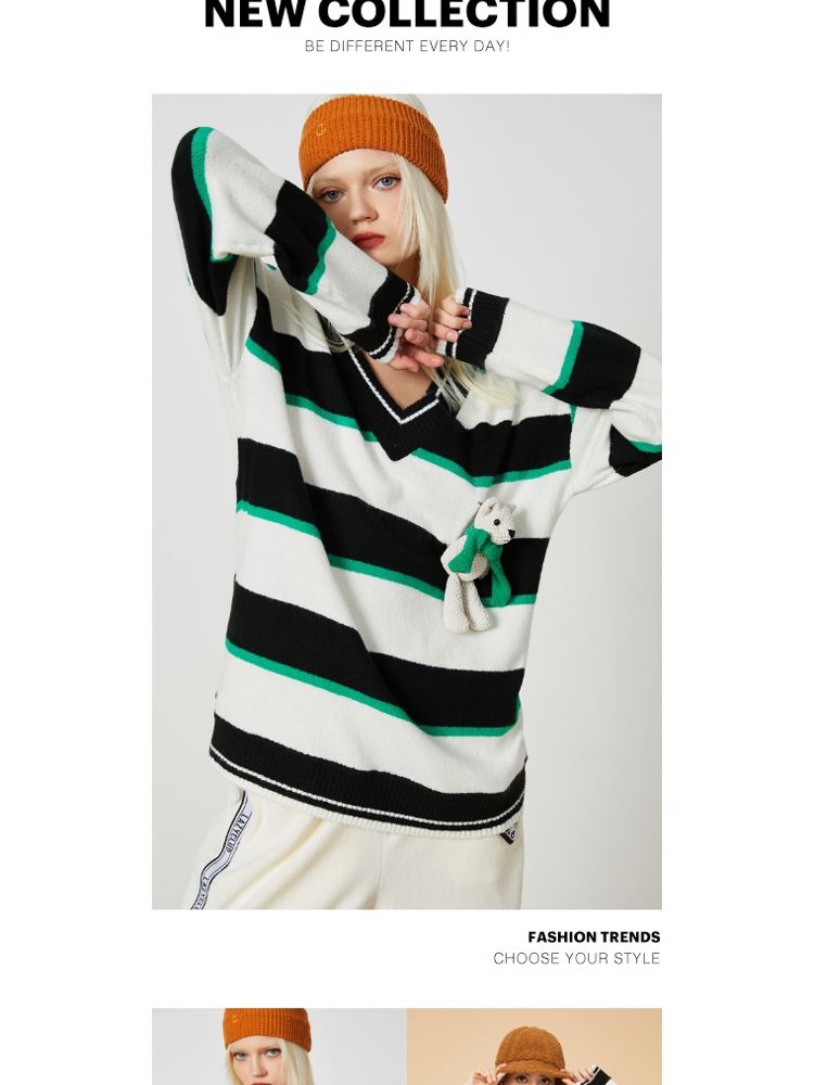 商品名称:【宽松落肩】夏季条纹设计V领宽松针织衫女 231642