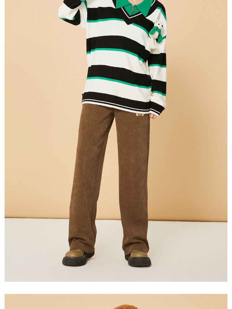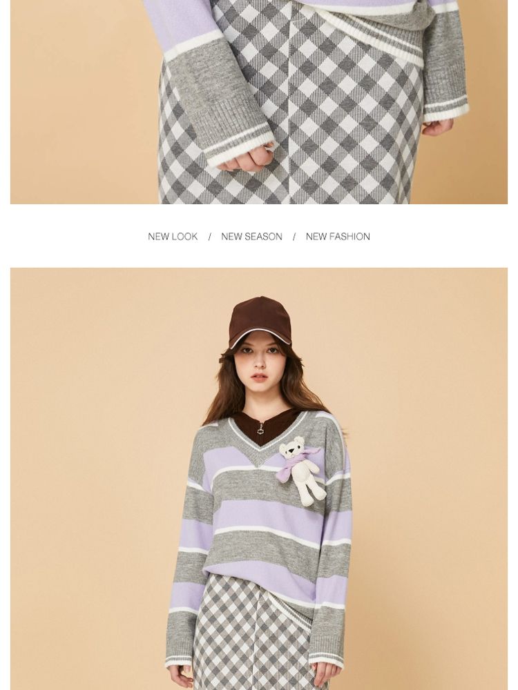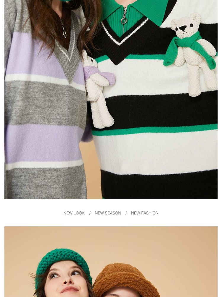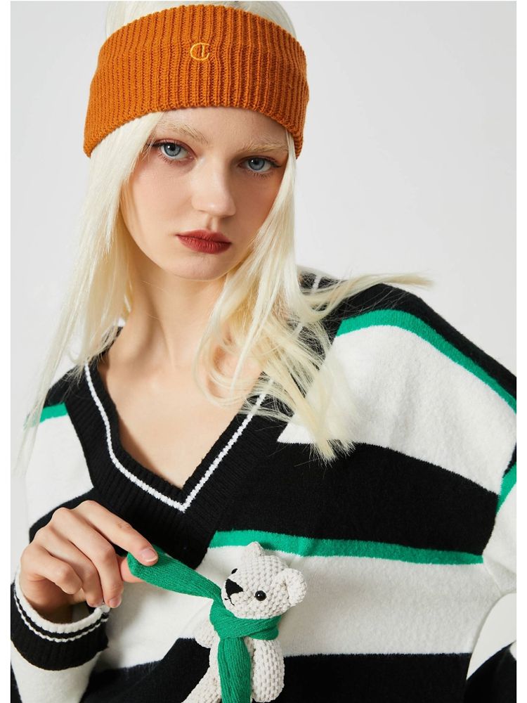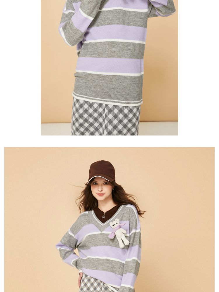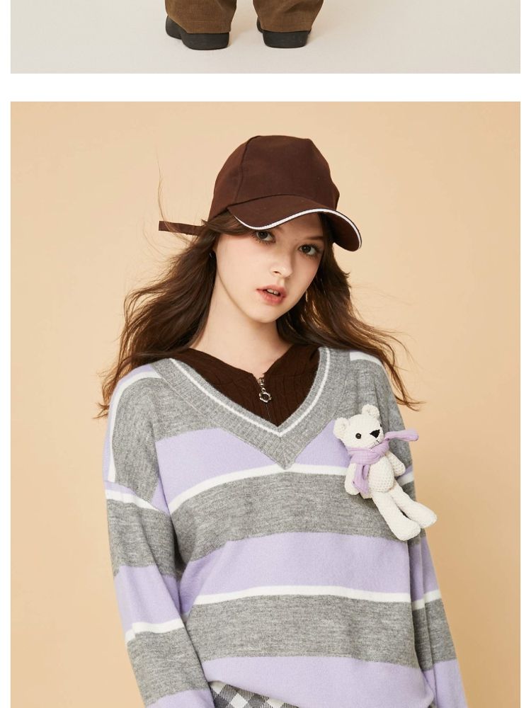 商品名称:【宽松落肩】夏季条纹设计V领宽松针织衫女 231642