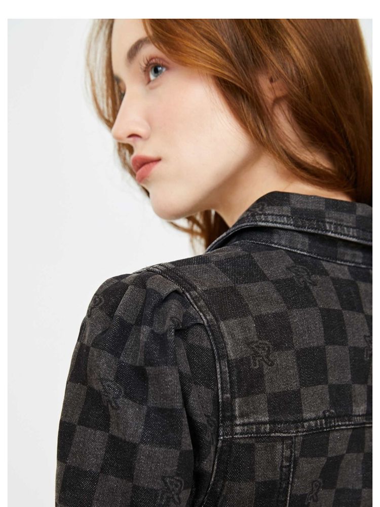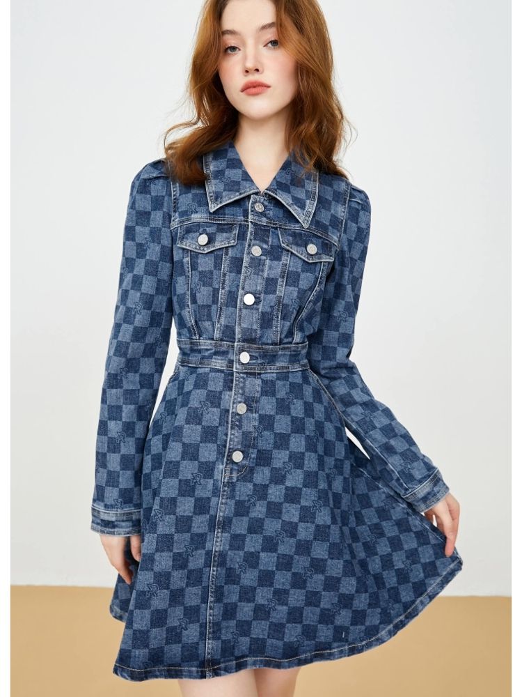 【福利款】夏季棋盘格泡泡袖莱卡牛仔短款连衣裙女 255066