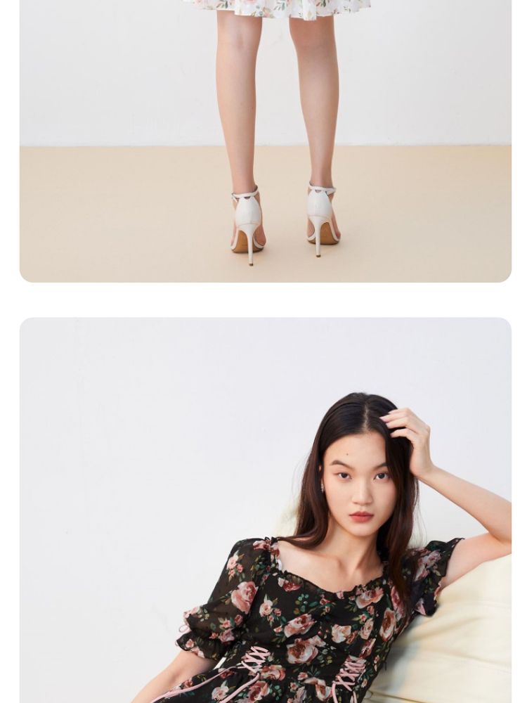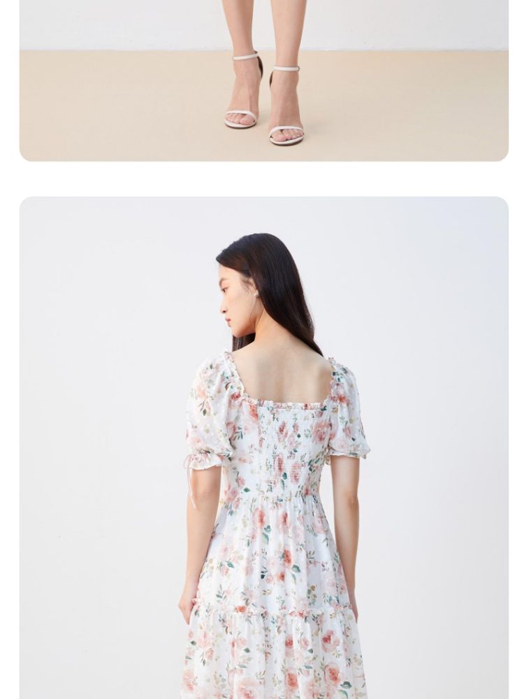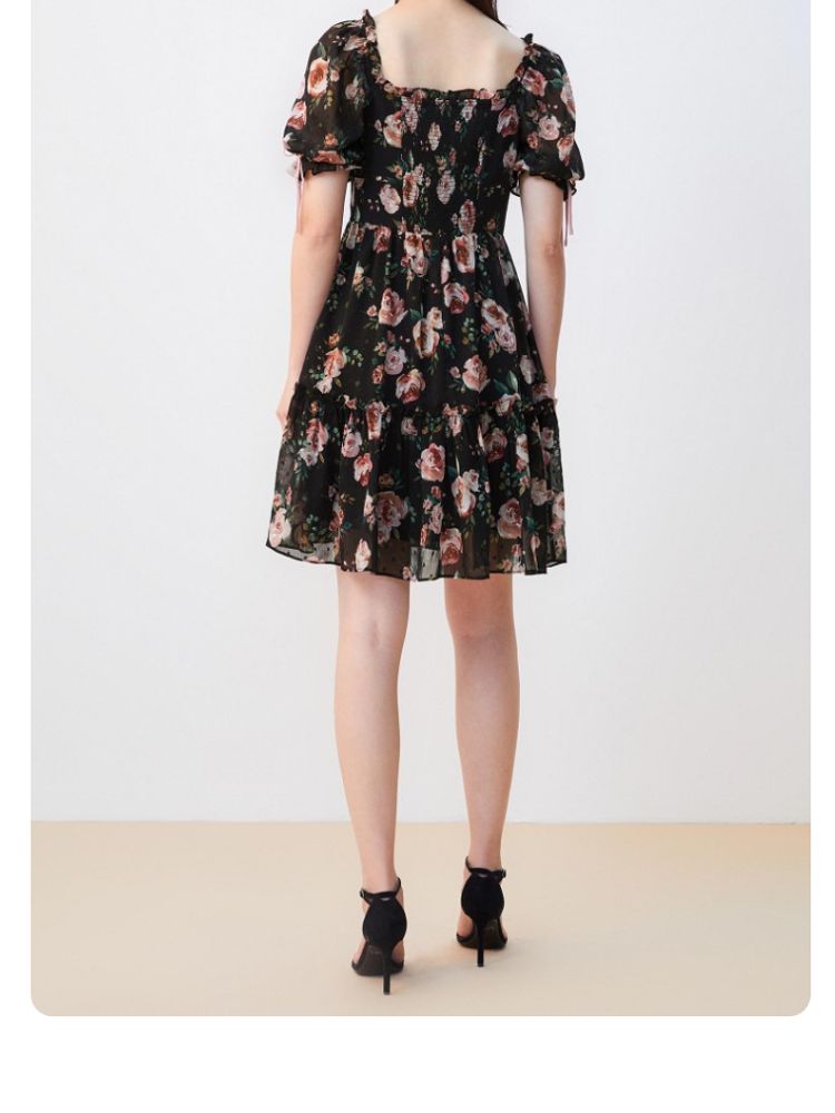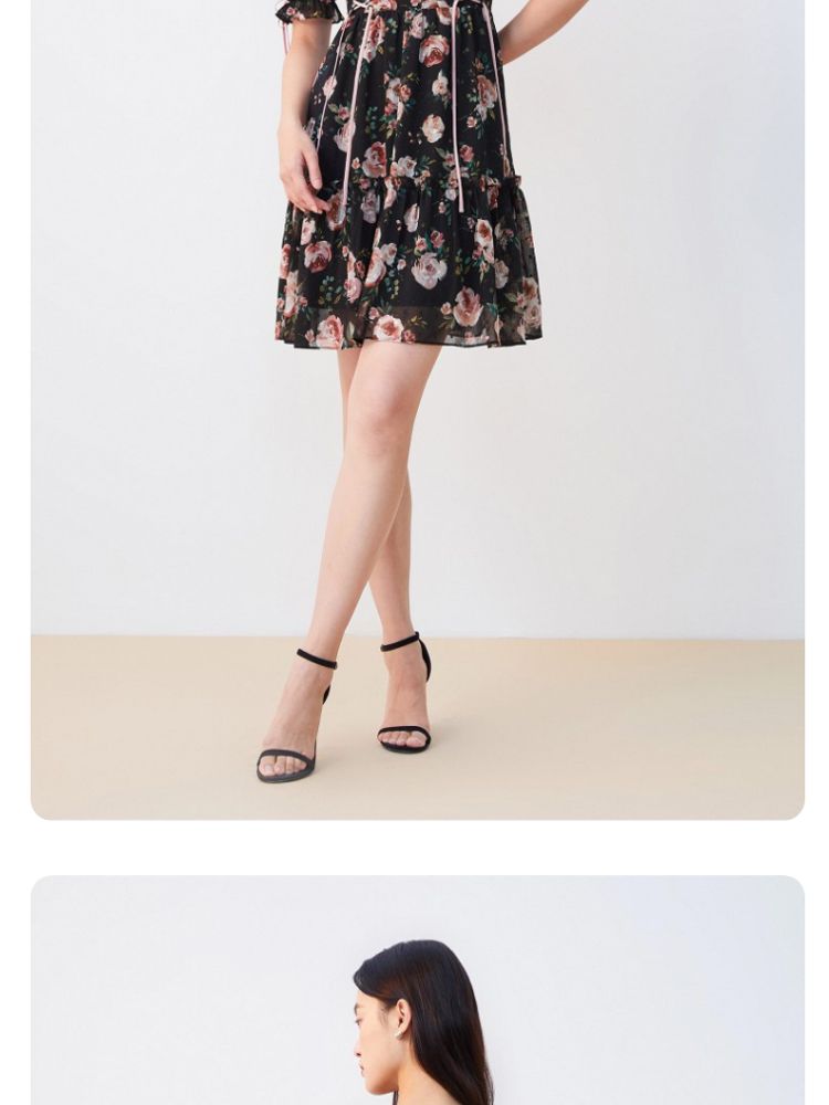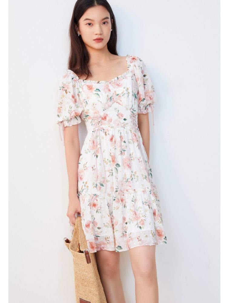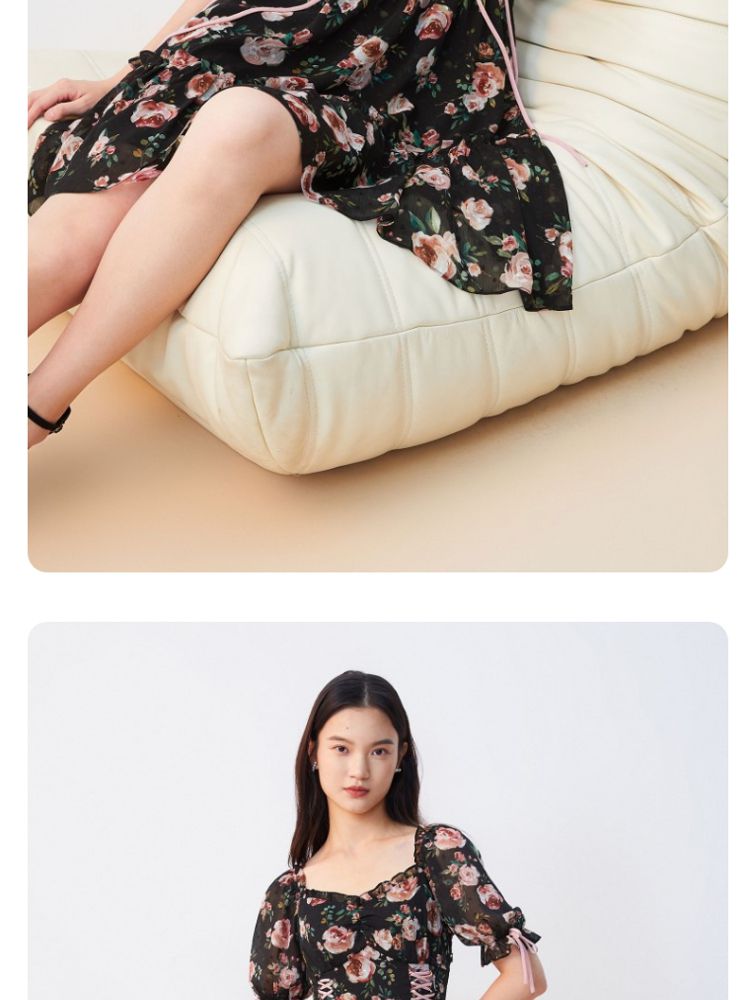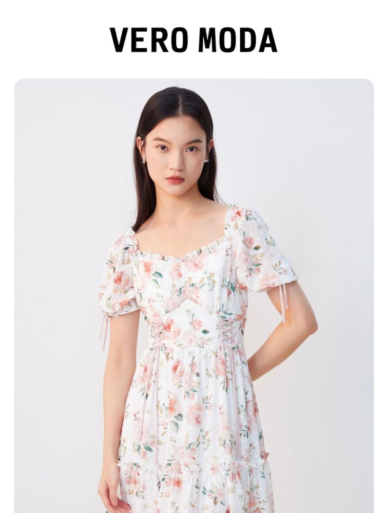 商品名称:【花朵波点】连衣裙夏植绒高级感绑带木耳边泡泡袖甜美度假减龄 287185