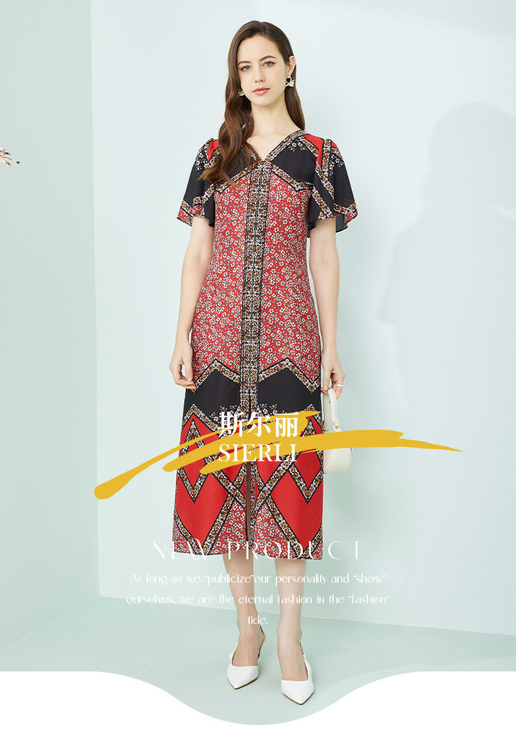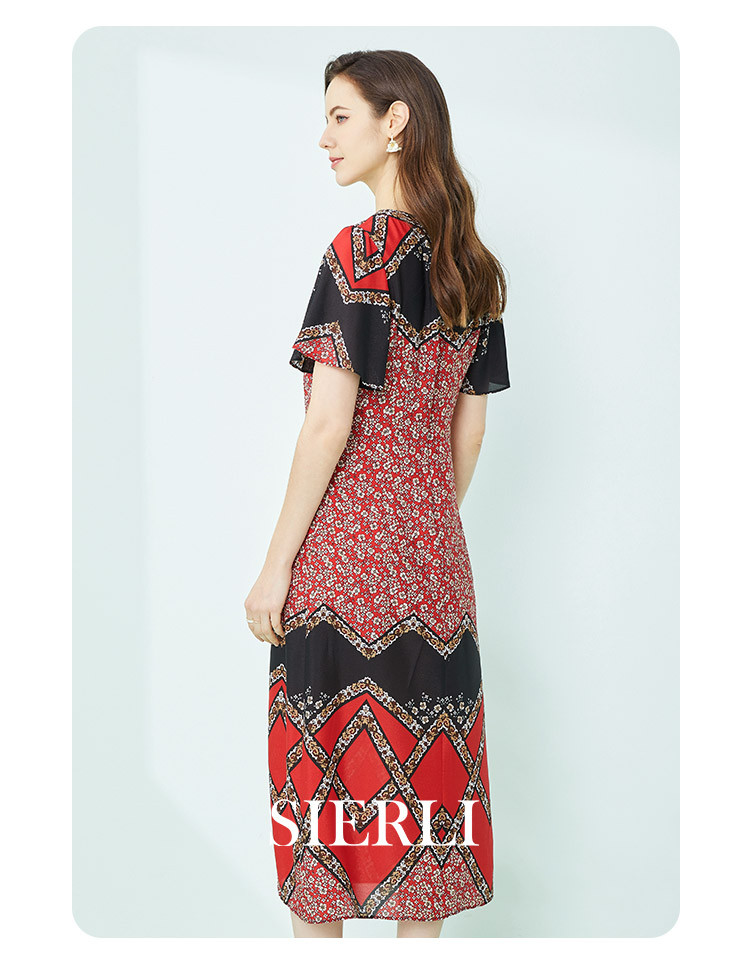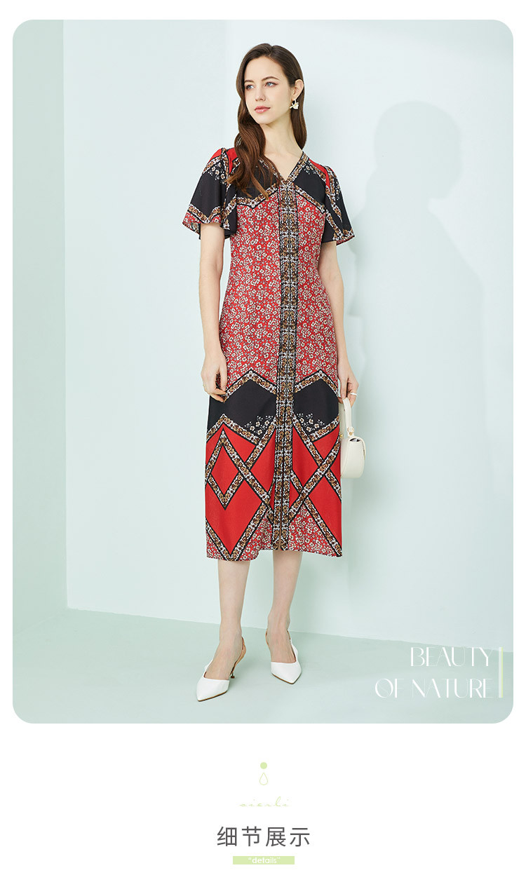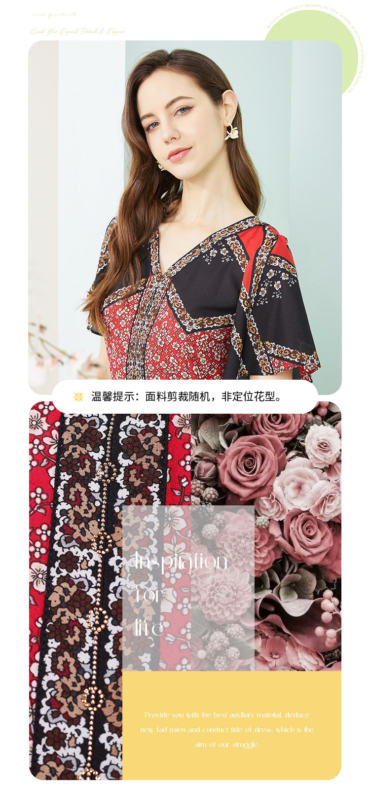 商品名称:商场同款秋季古烂漫小碎花印花V领拼接色显瘦短袖连衣裙 040095