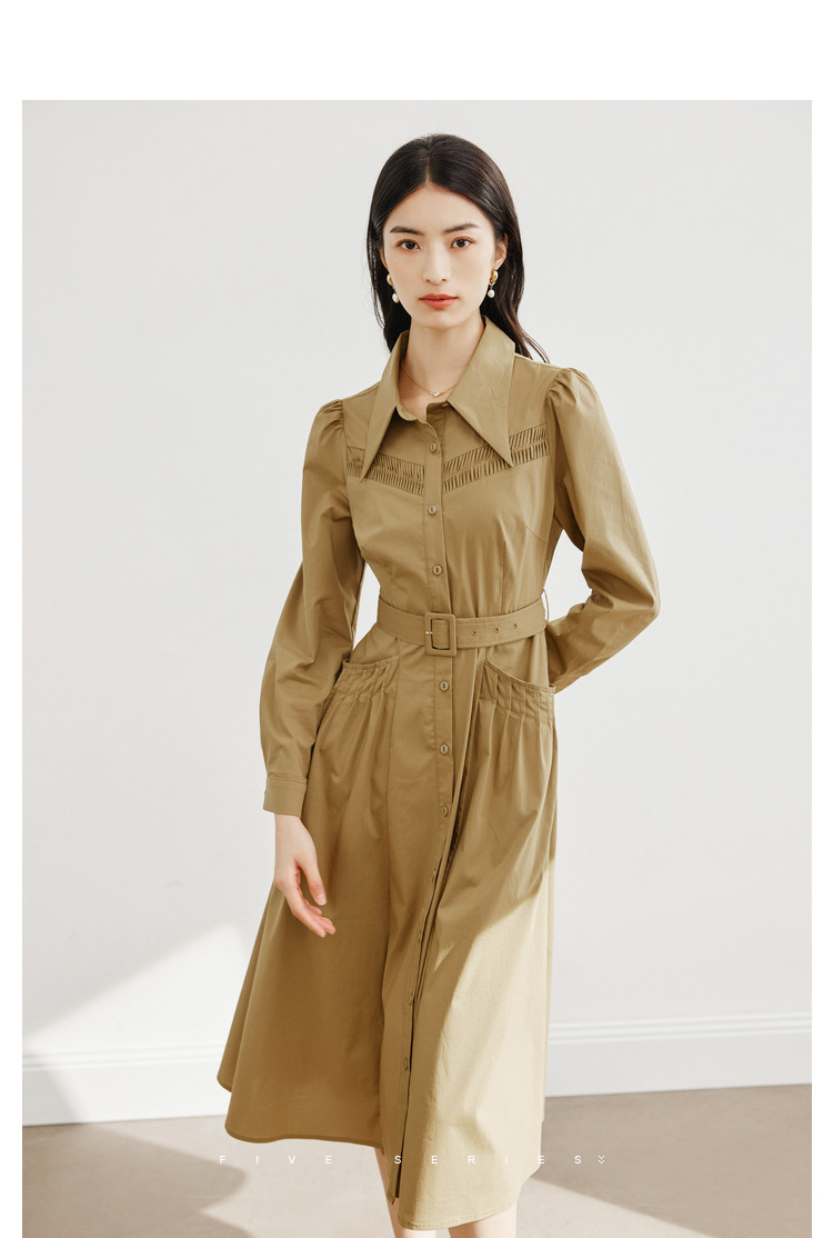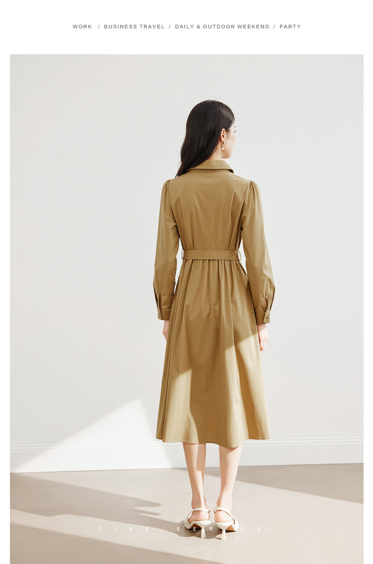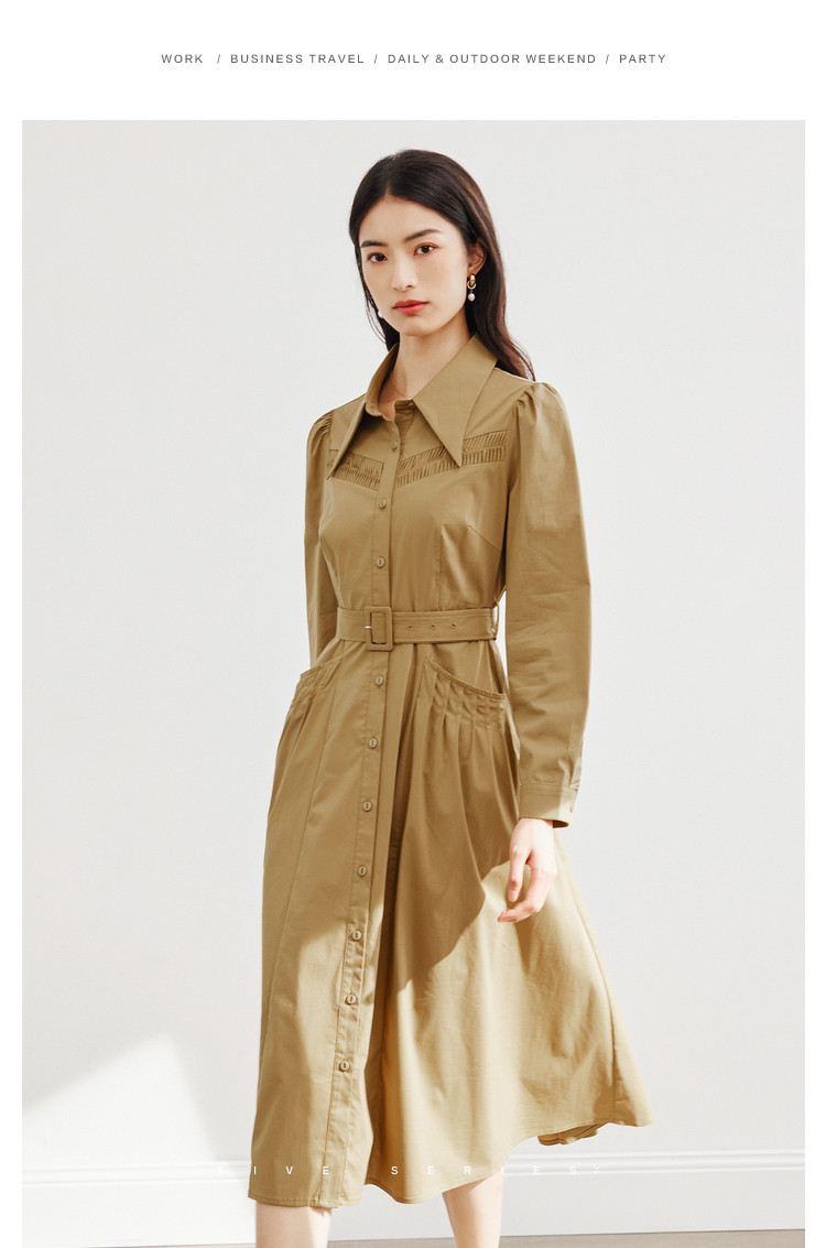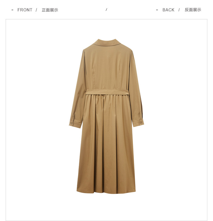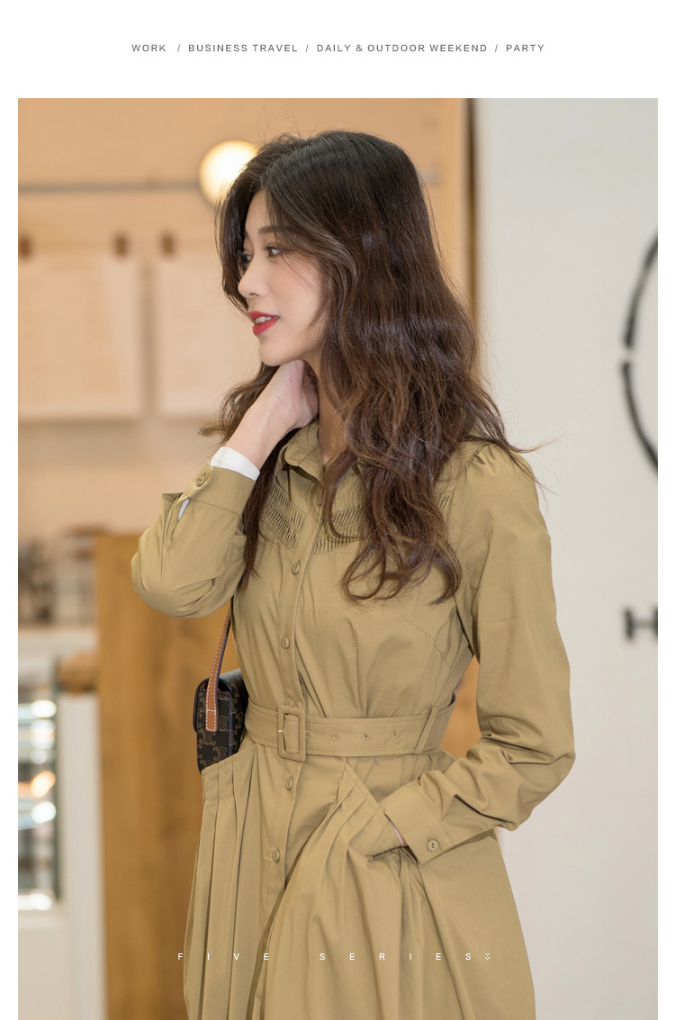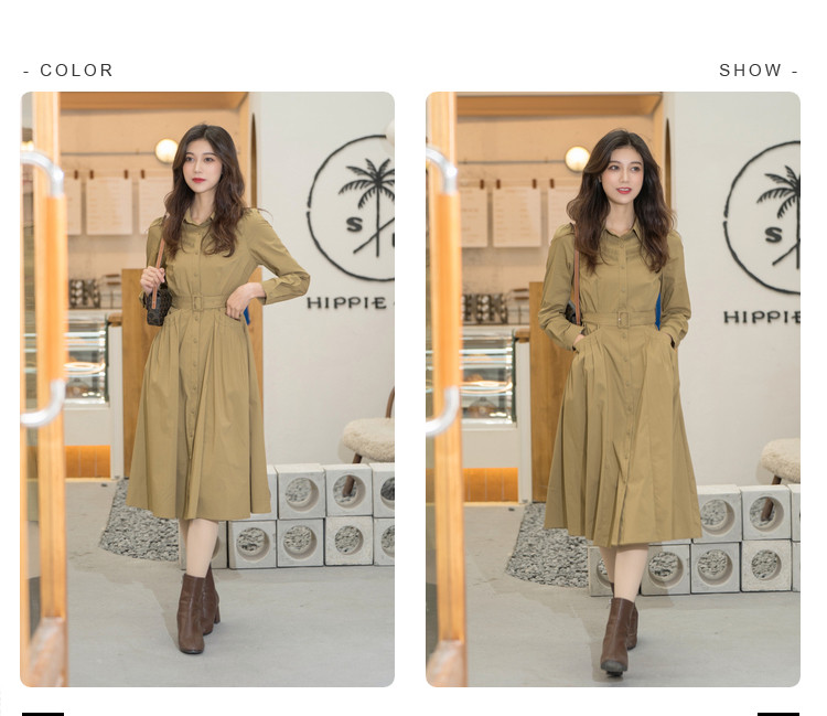 商品名称:polo领纯色连衣裙女春秋长袖中长款显瘦收腰气质衬衫裙子女 275331