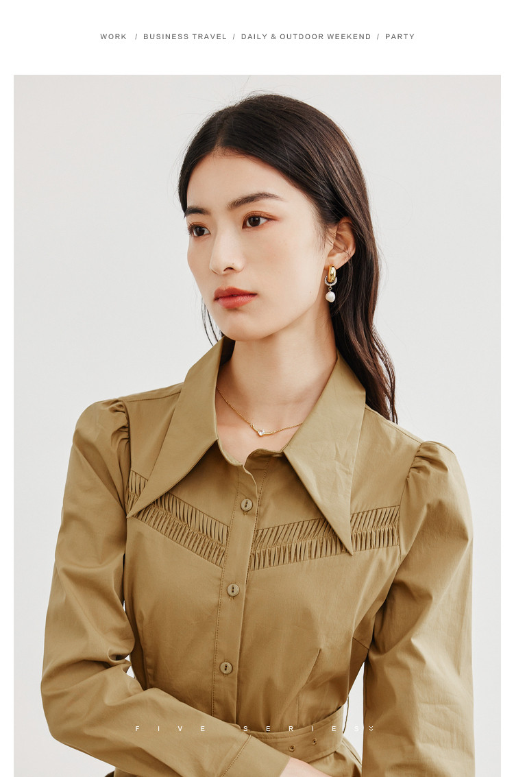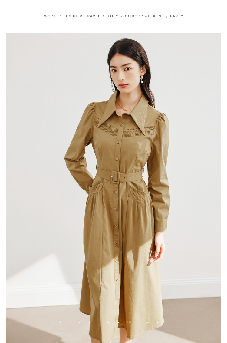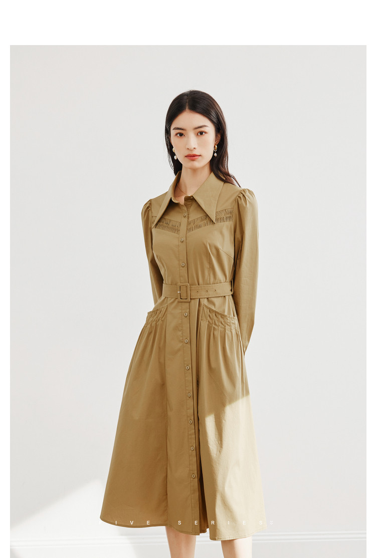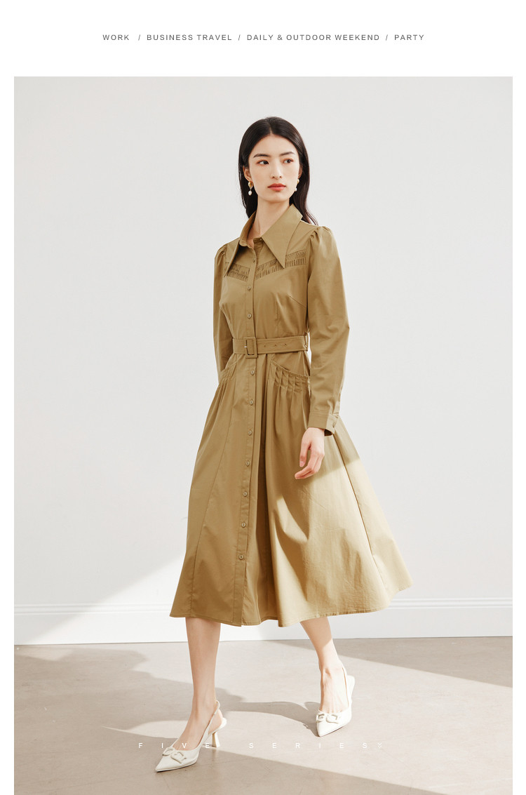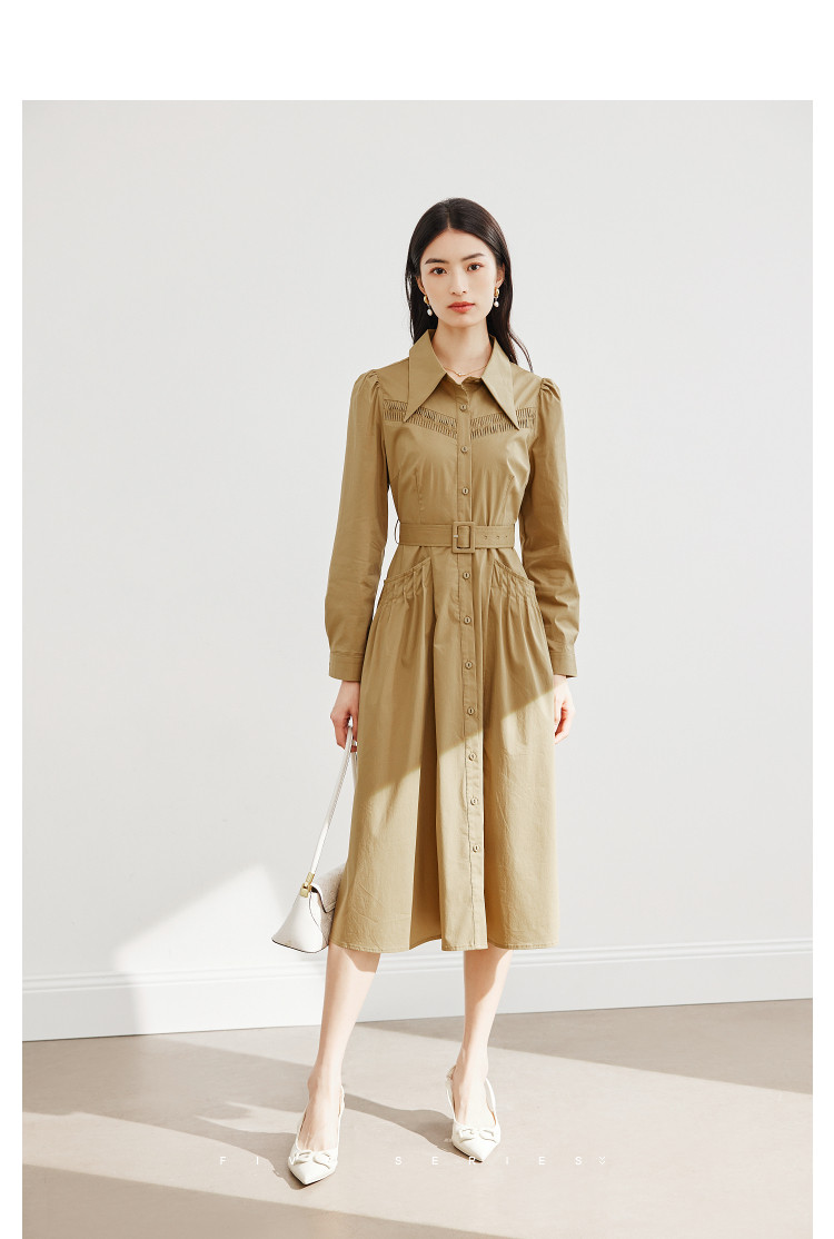 商品名称:polo领纯色连衣裙女春秋长袖中长款显瘦收腰气质衬衫裙子女 275331