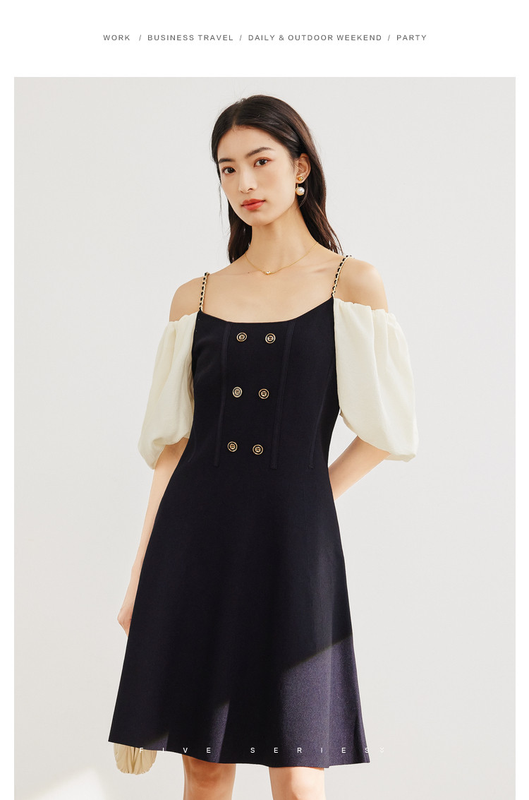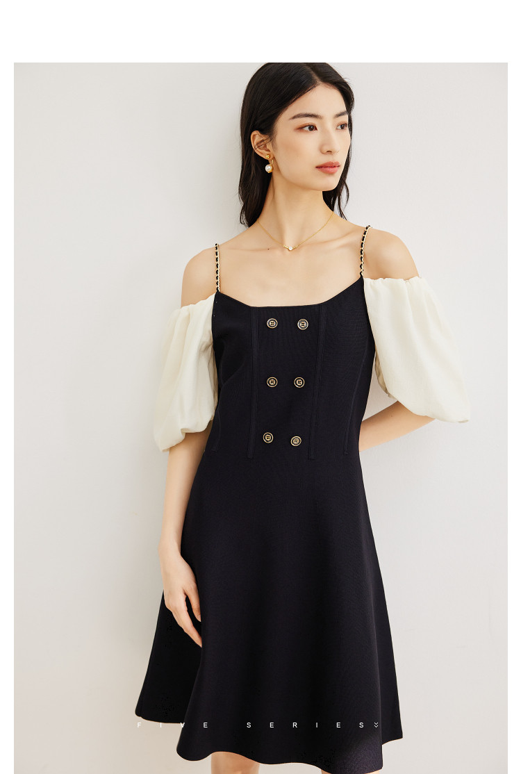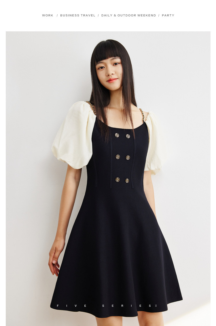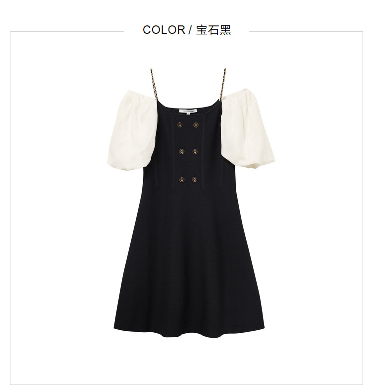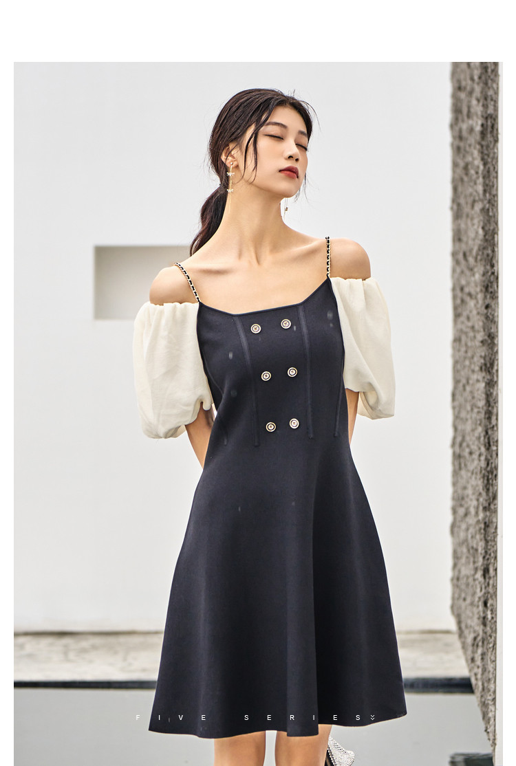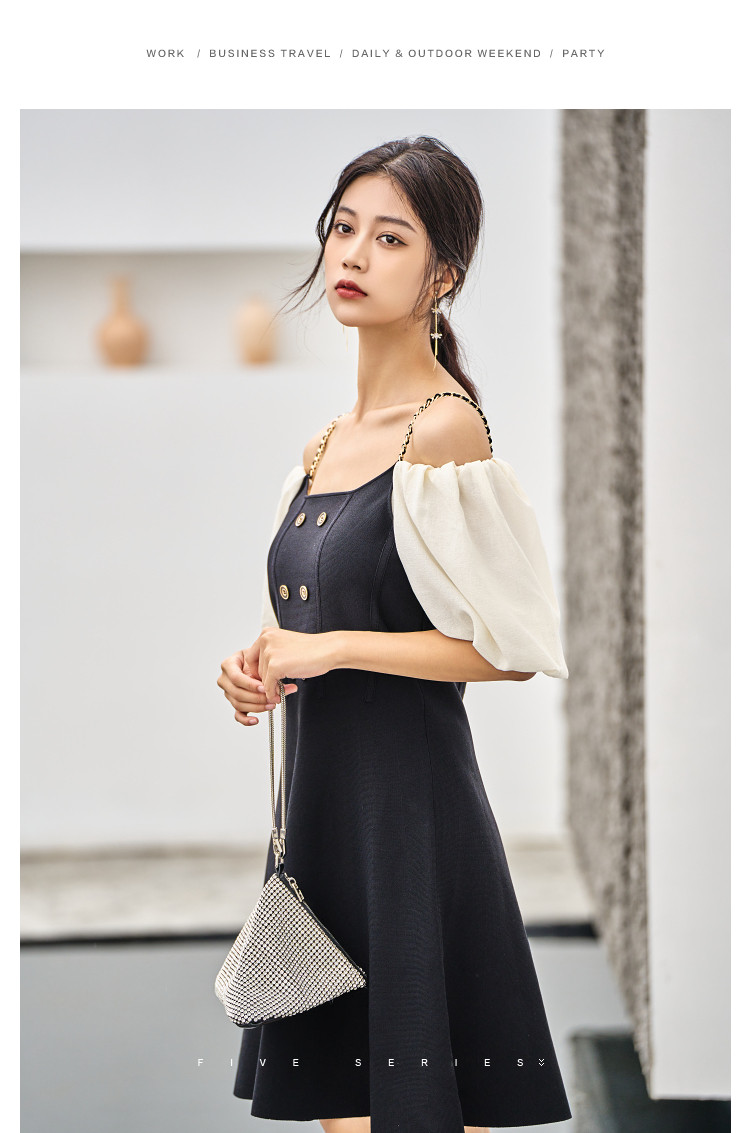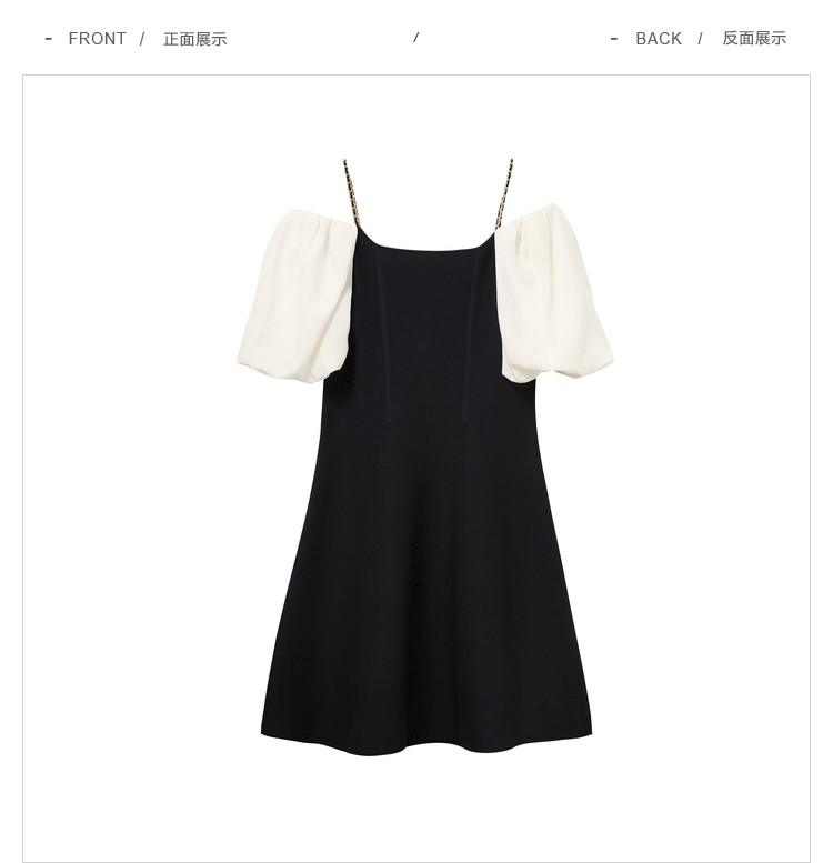商品名称:泡泡袖连衣裙女撞色拼接气质收腰显瘦露背小礼服a字连衣裙 307203