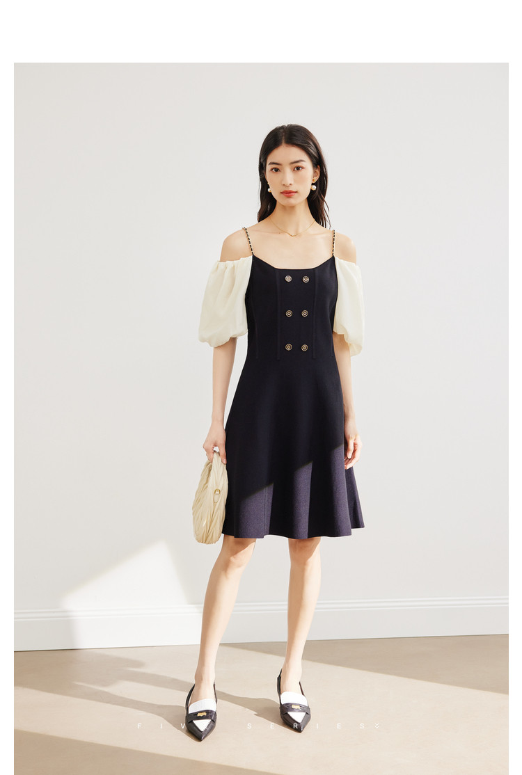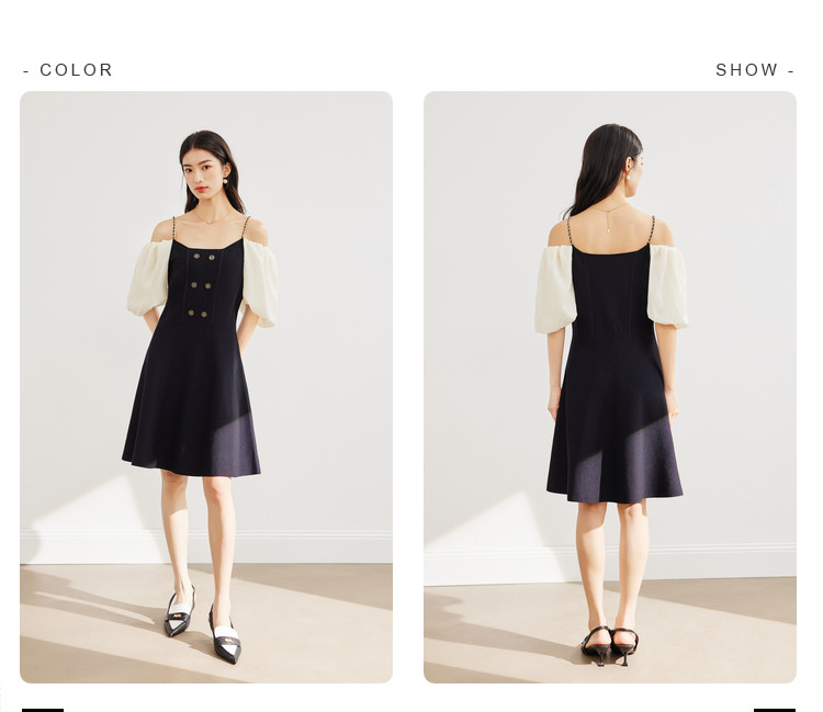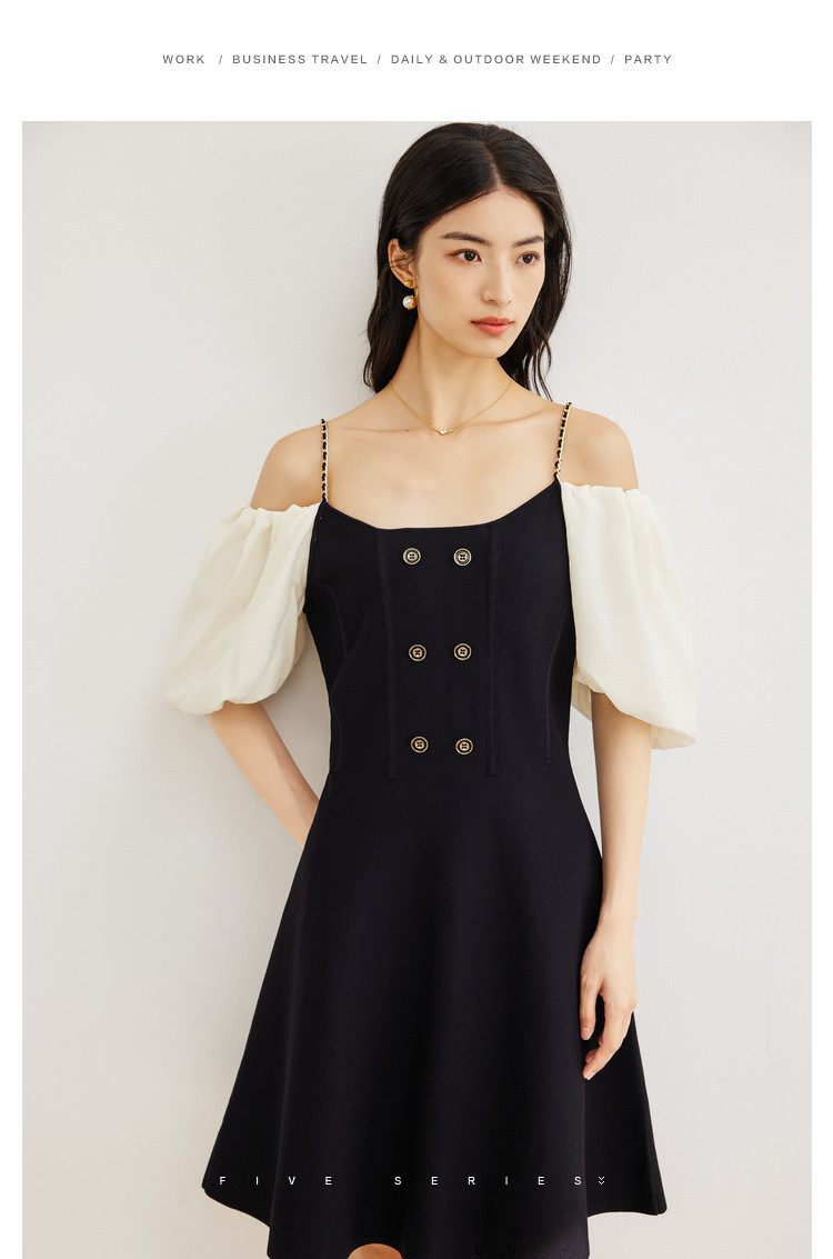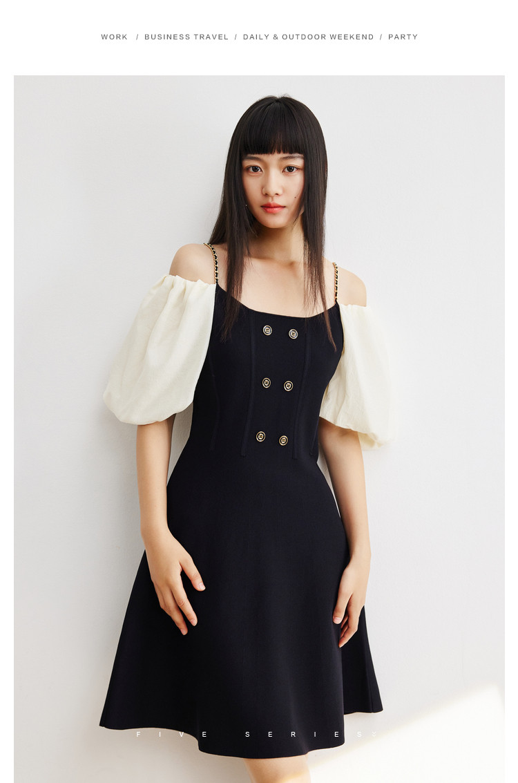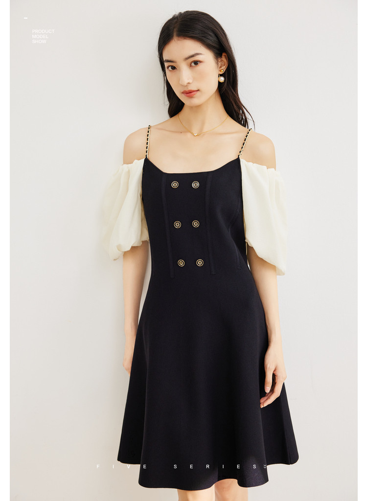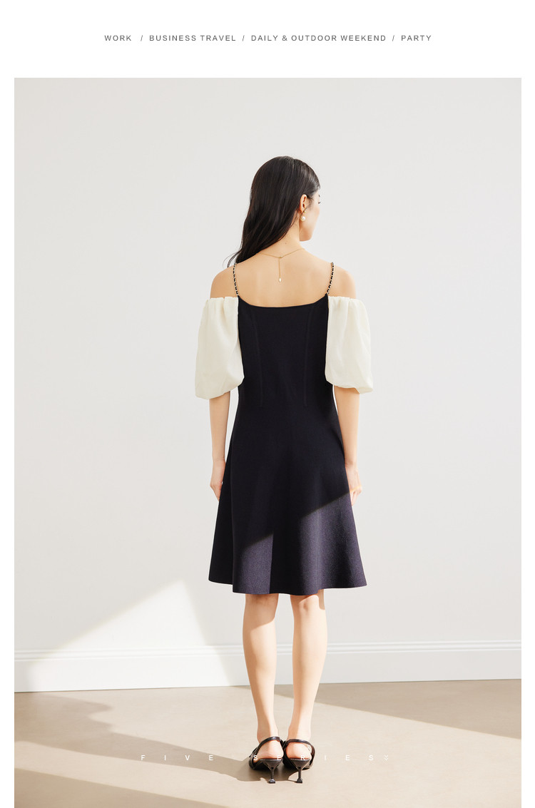 商品名称:泡泡袖连衣裙女撞色拼接气质收腰显瘦露背小礼服a字连衣裙 307203