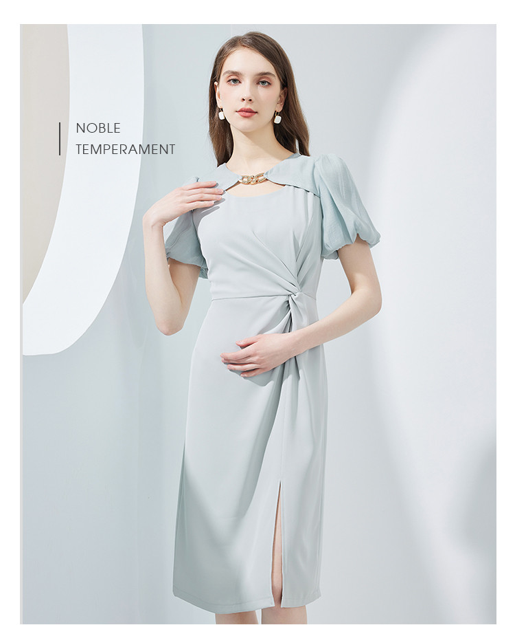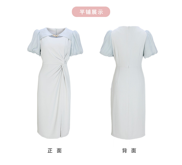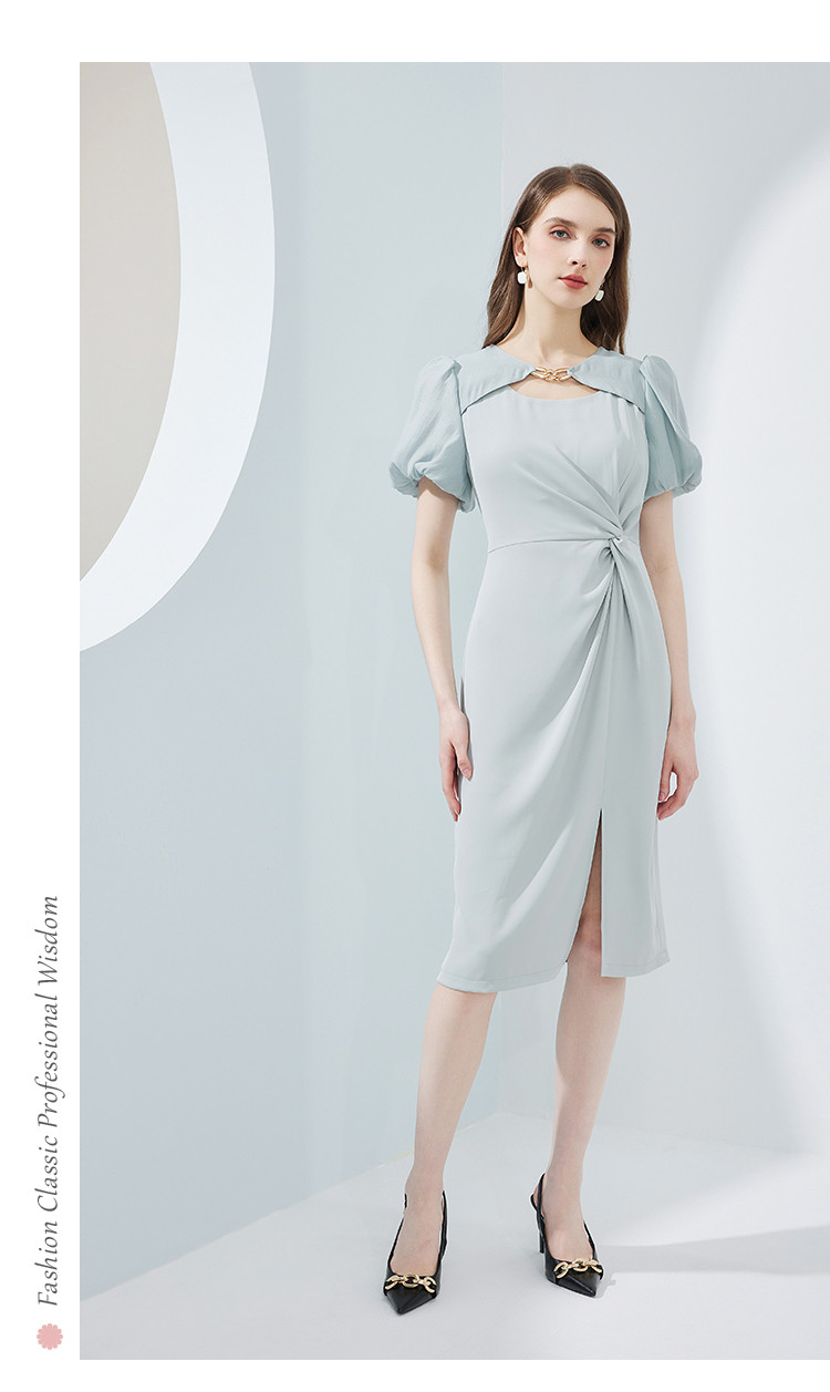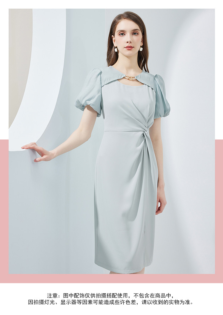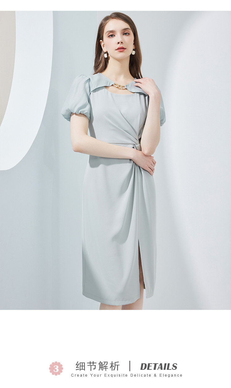 商品名称:夏季腰间收褶合体显瘦前开叉装饰链条OL气质通勤连衣裙 647007