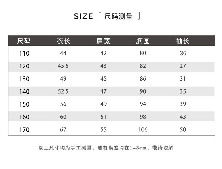 | 尺码 | 衣长(cm) | 肩宽(cm) | 身高(cm) | 袖长(cm) | 适合年龄 | 胸围(cm) | 号型 |