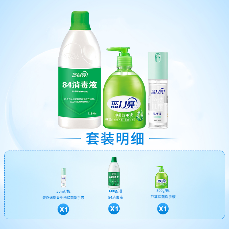 蓝月亮84消毒液600g+芦荟洗手液300g+免洗抑菌洗手液50ml