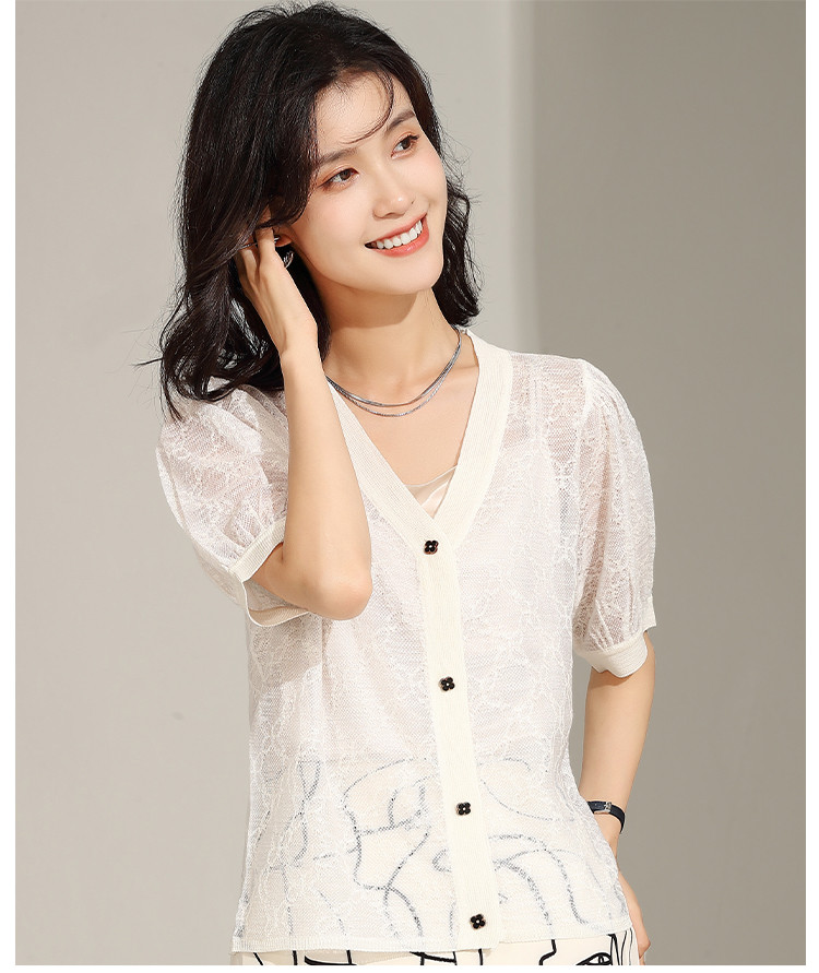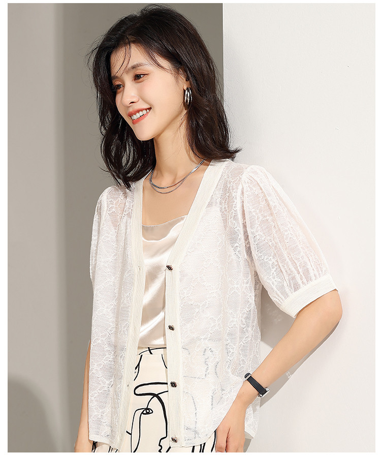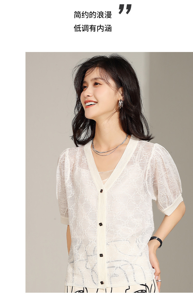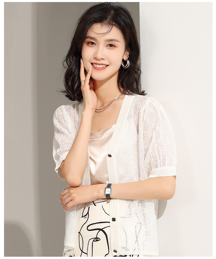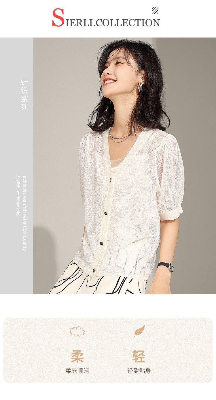 商品名称:外套女夏季薄款镂空花纹透肤防风衣纯色小香风舒适针织开衫外套女 458335