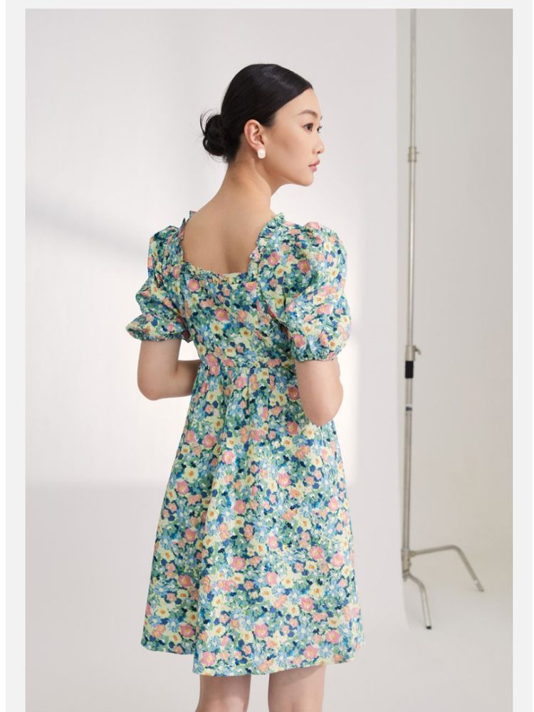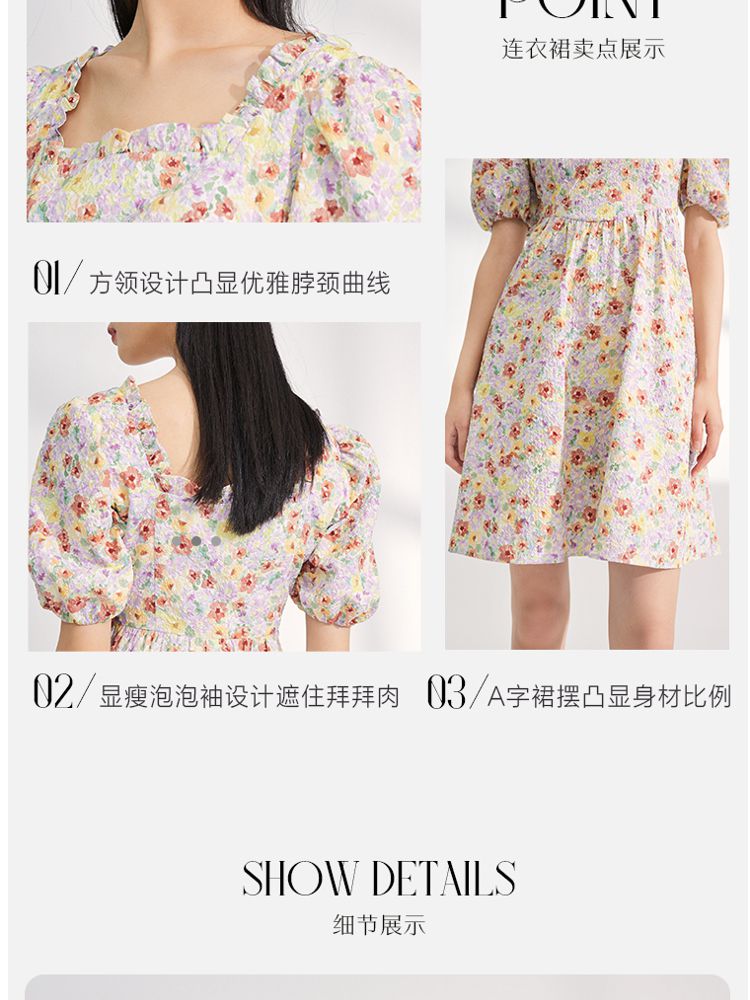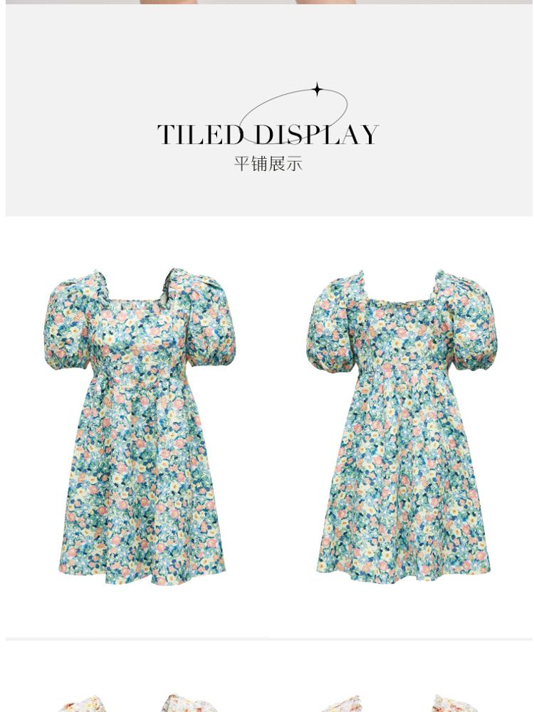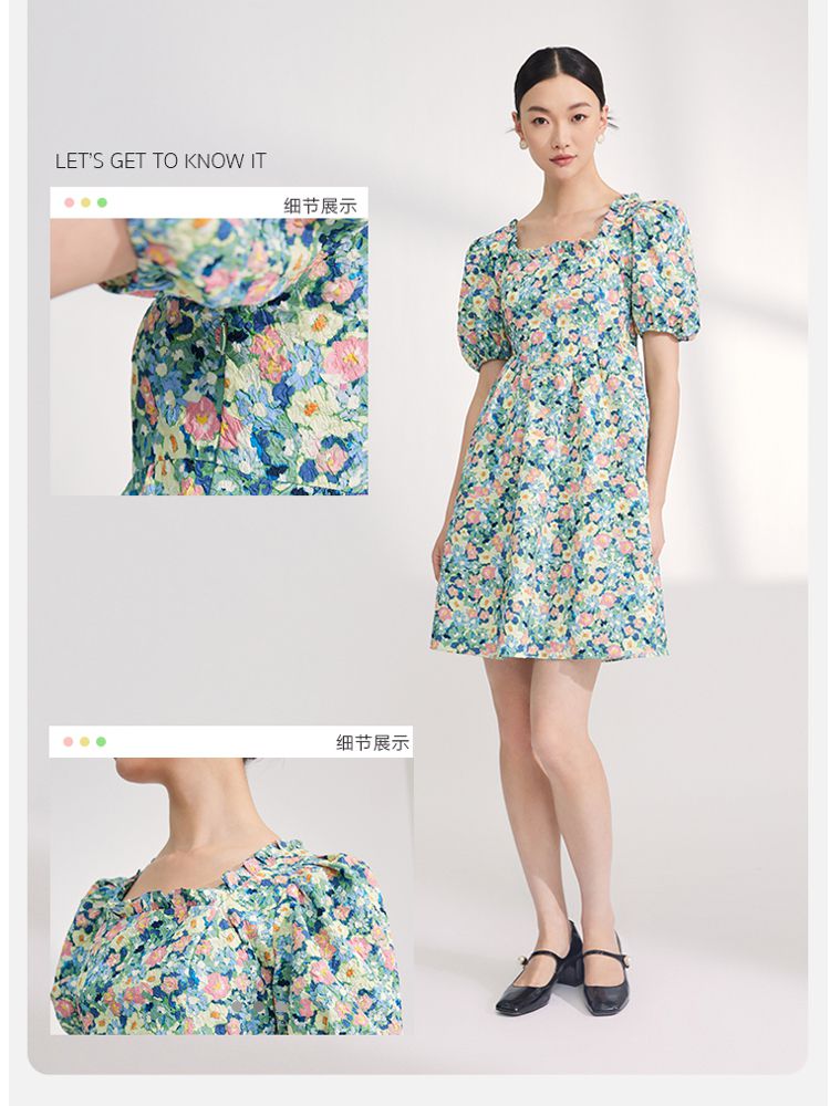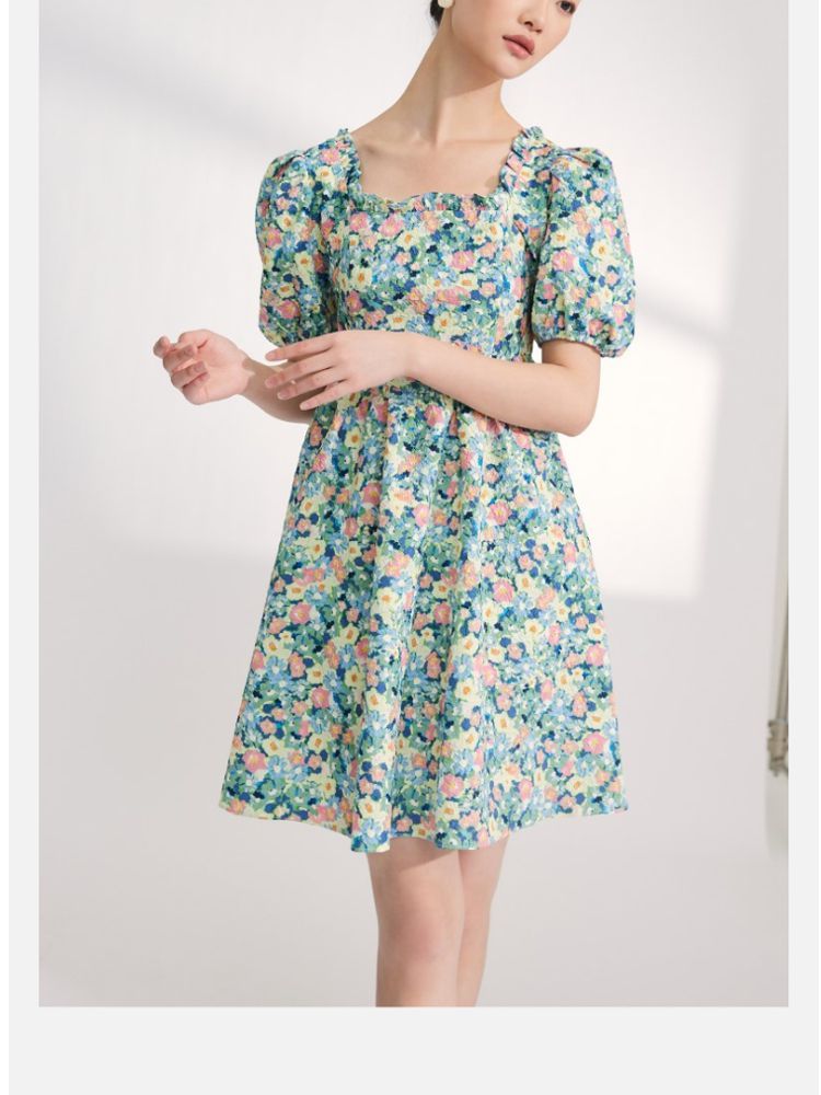 商品名称:【油画碎花】方领泡泡袖修身连衣裙 874577