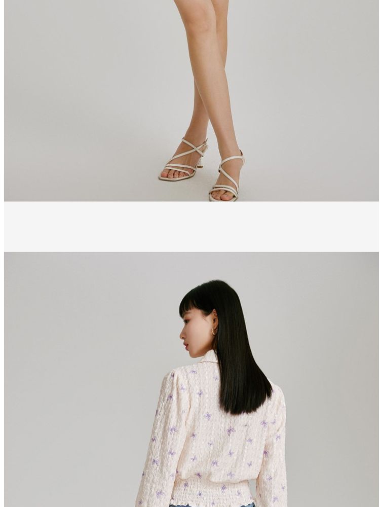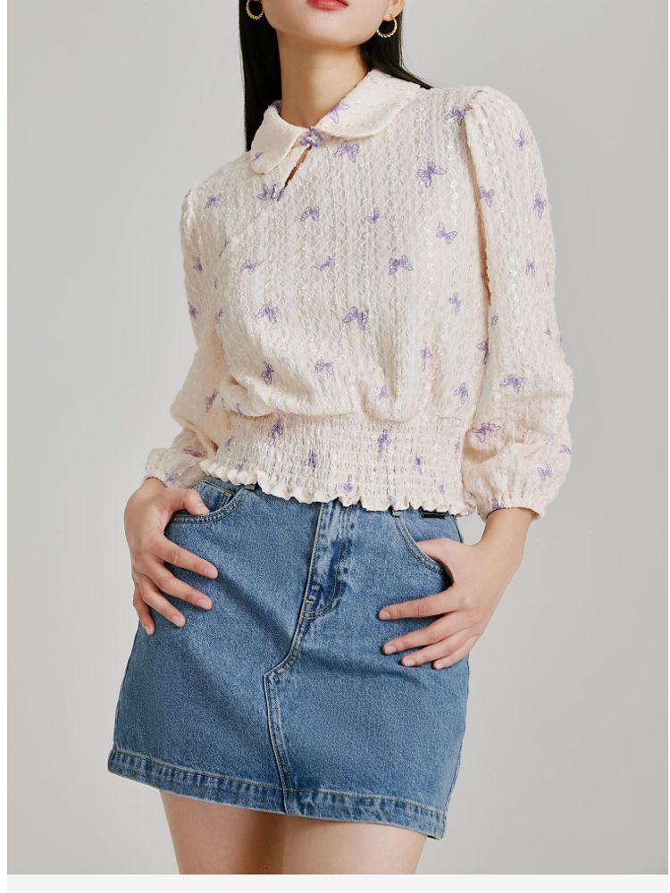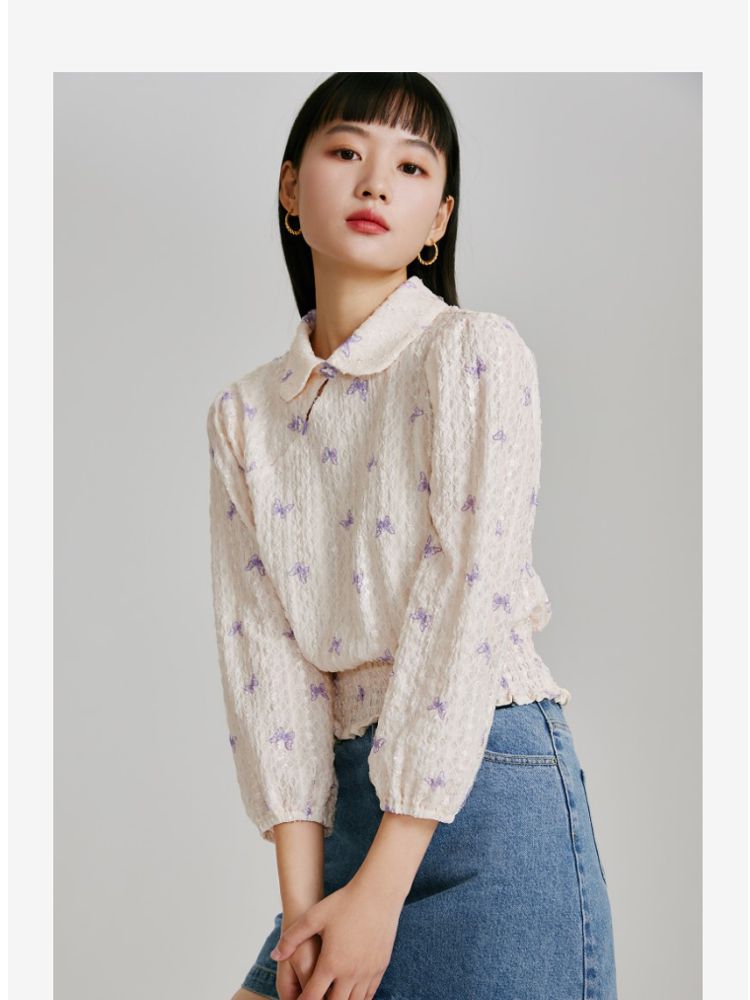 【精美立体蝴蝶装饰】专柜同款七分泡泡袖气质翻领印花上衣 118481