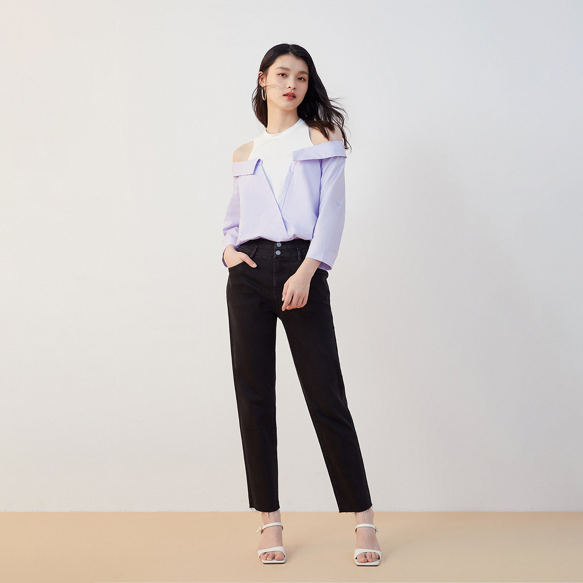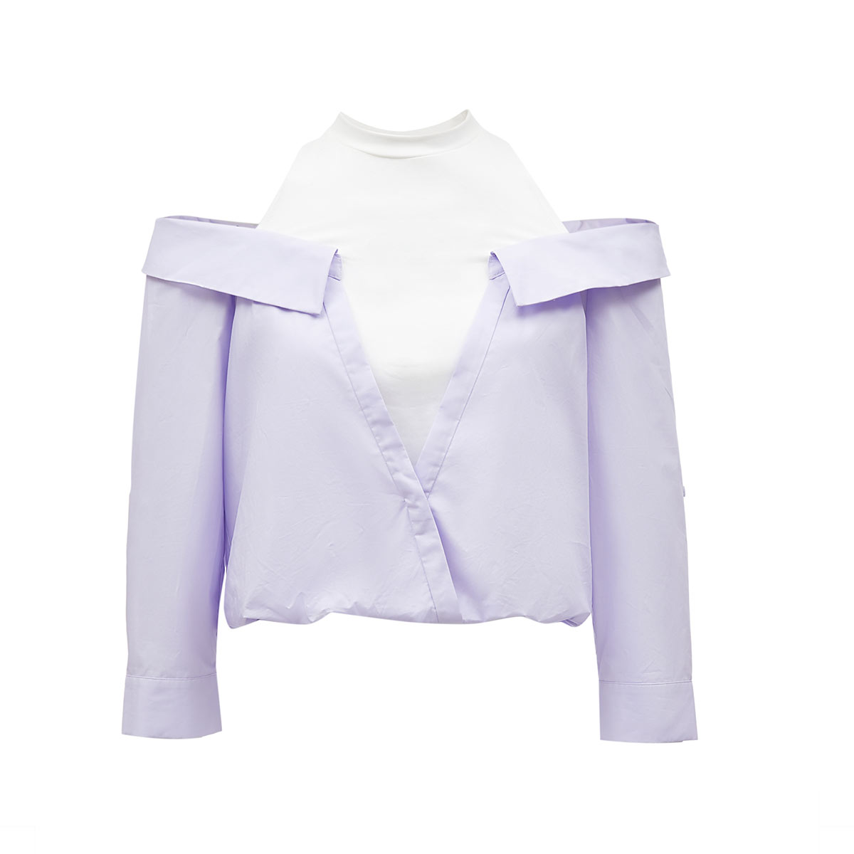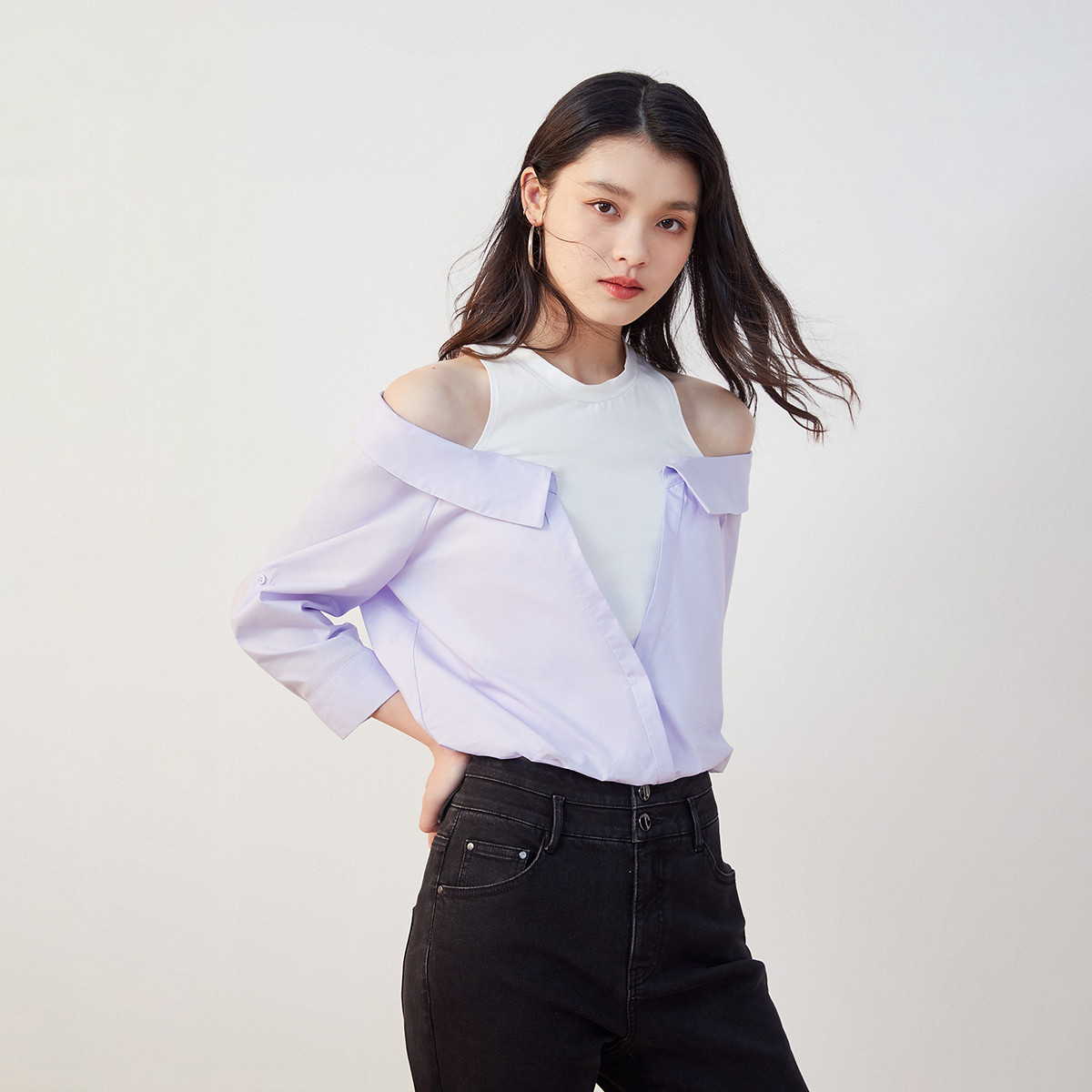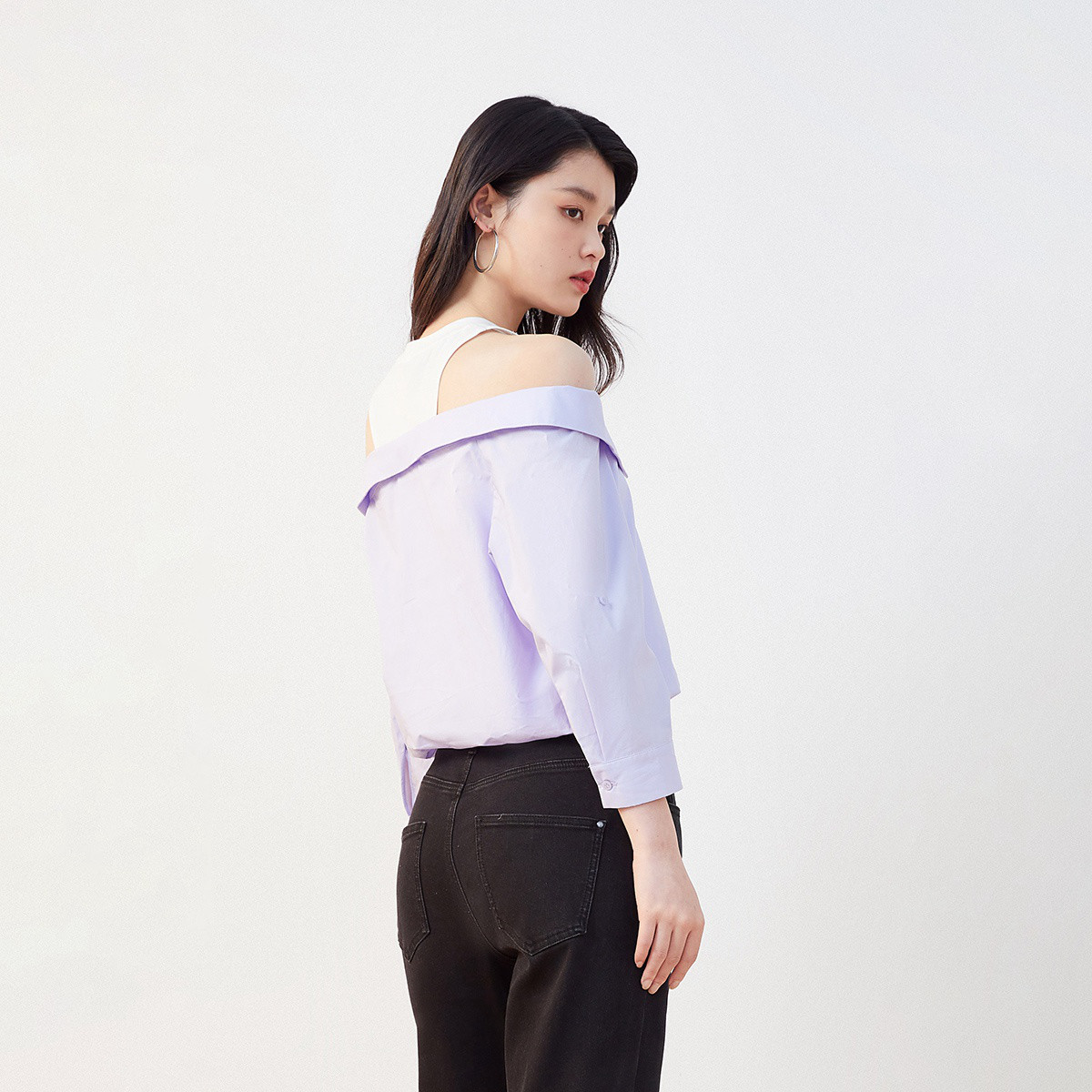 一字肩字母衬衫女春秋露肩印花宽松长袖衬衣 676115