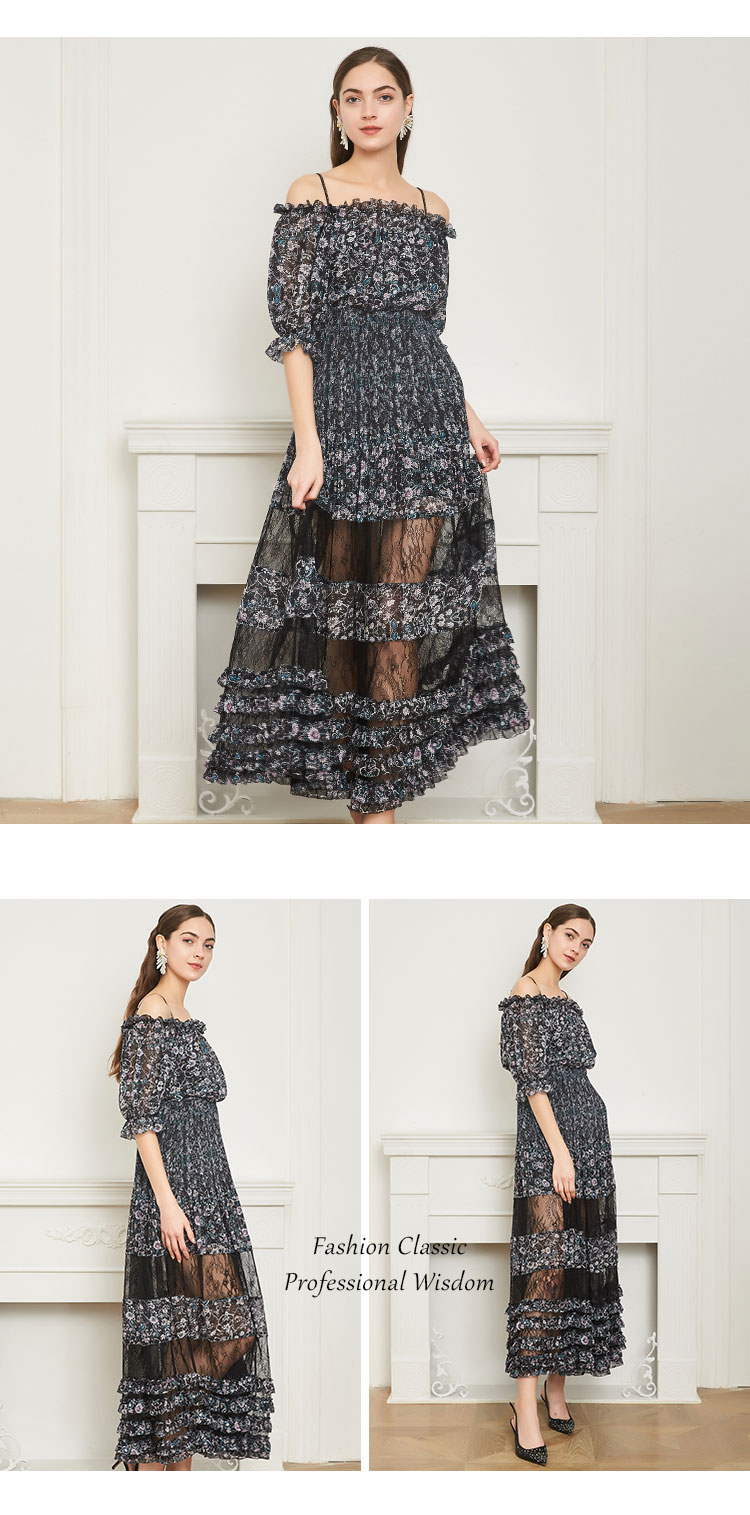 商场同款一字肩碎花长款松紧腰短袖连衣裙 219615
