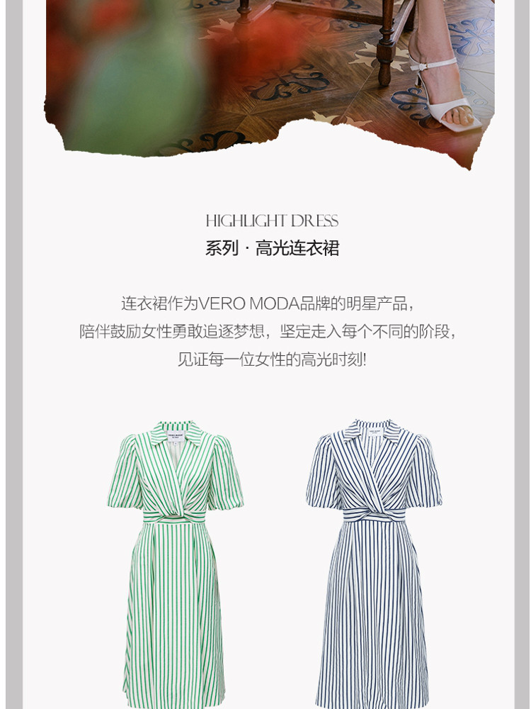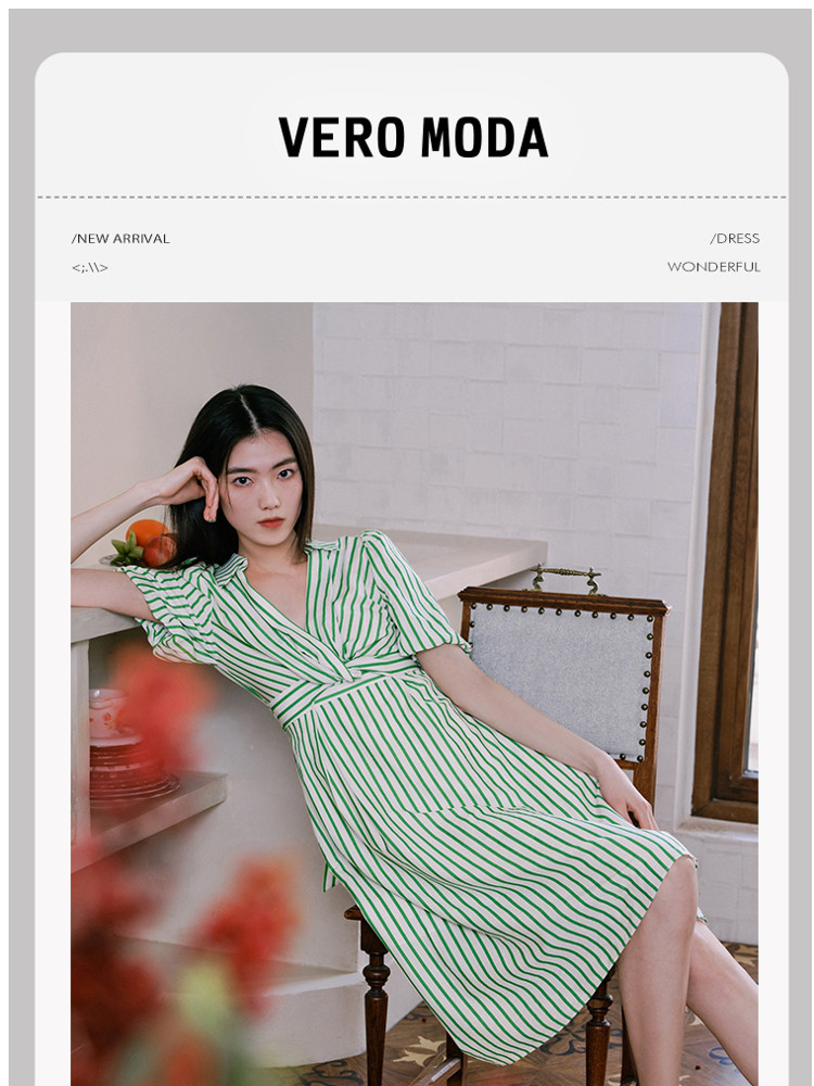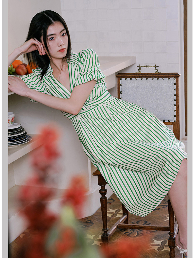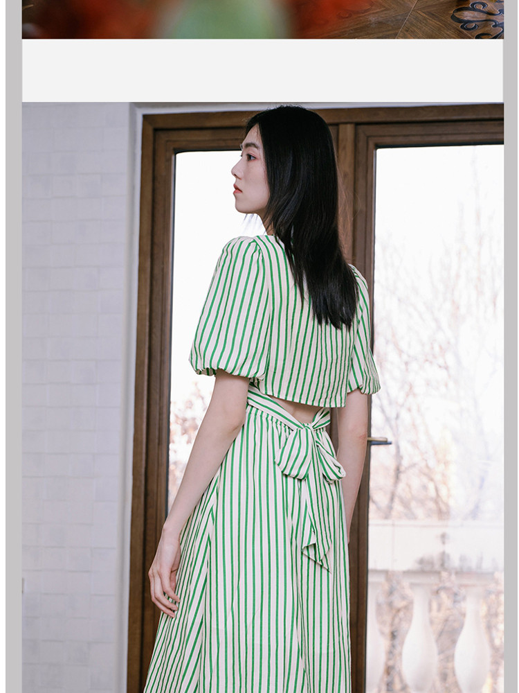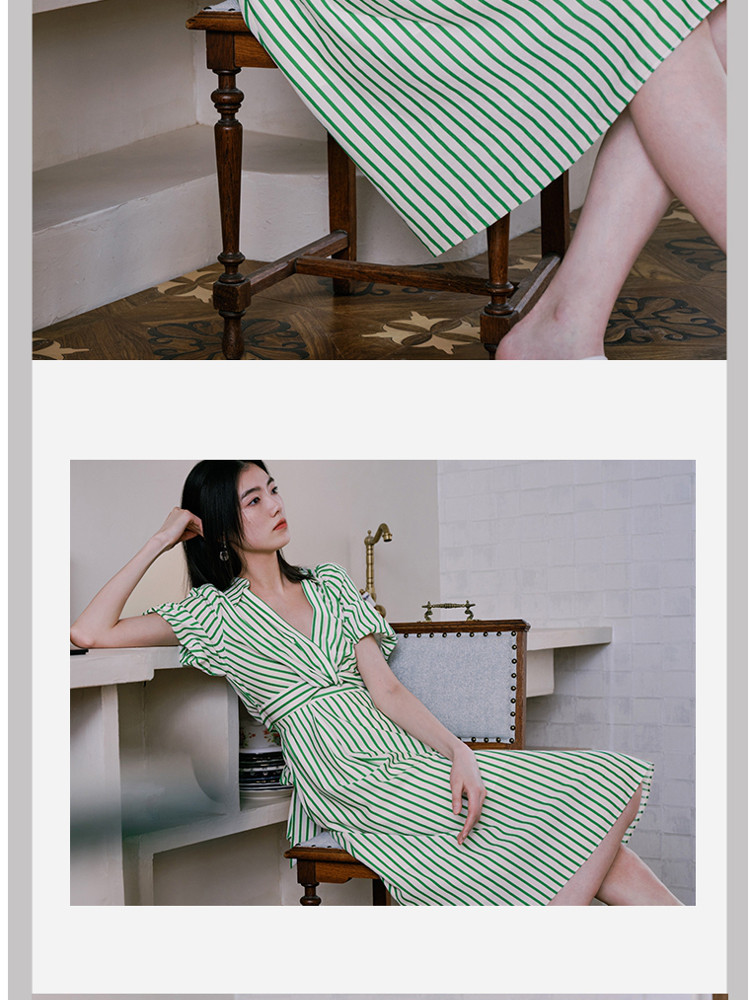 商品名称:【条纹长裙】A字灯笼袖V领收腰度假通勤连衣裙 275281