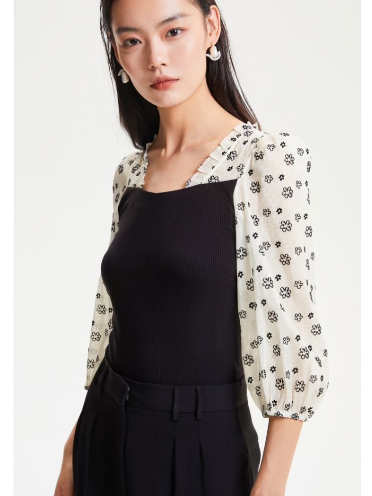 【拼接花朵植绒】春夏高级感优雅甜美专柜款泡泡袖修身上衣百搭 135377