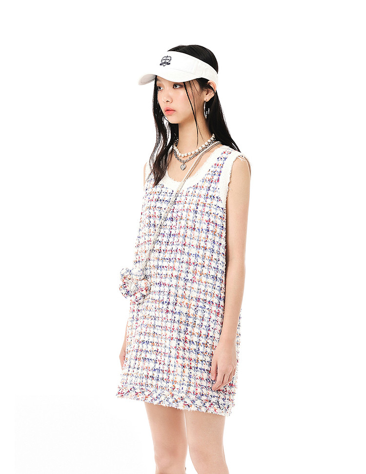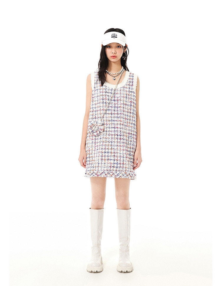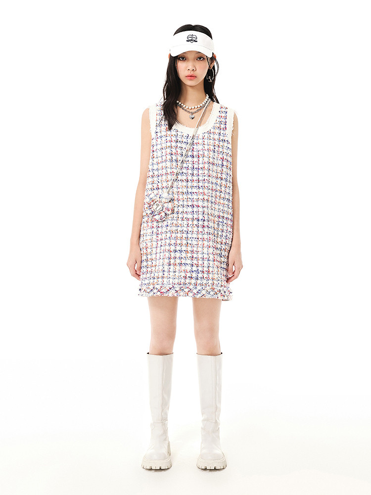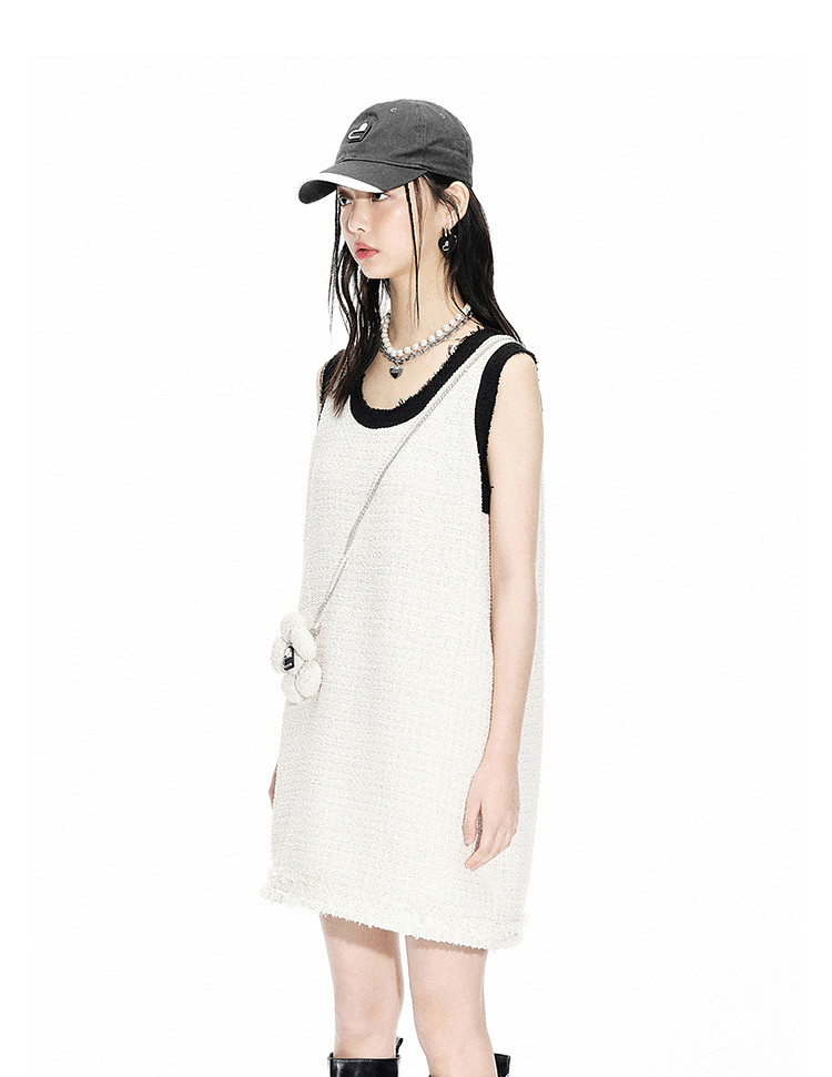 地素夏秋小香风粗花呢斜跨双链条花朵装饰连衣裙女 107275