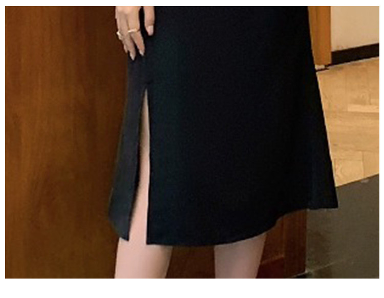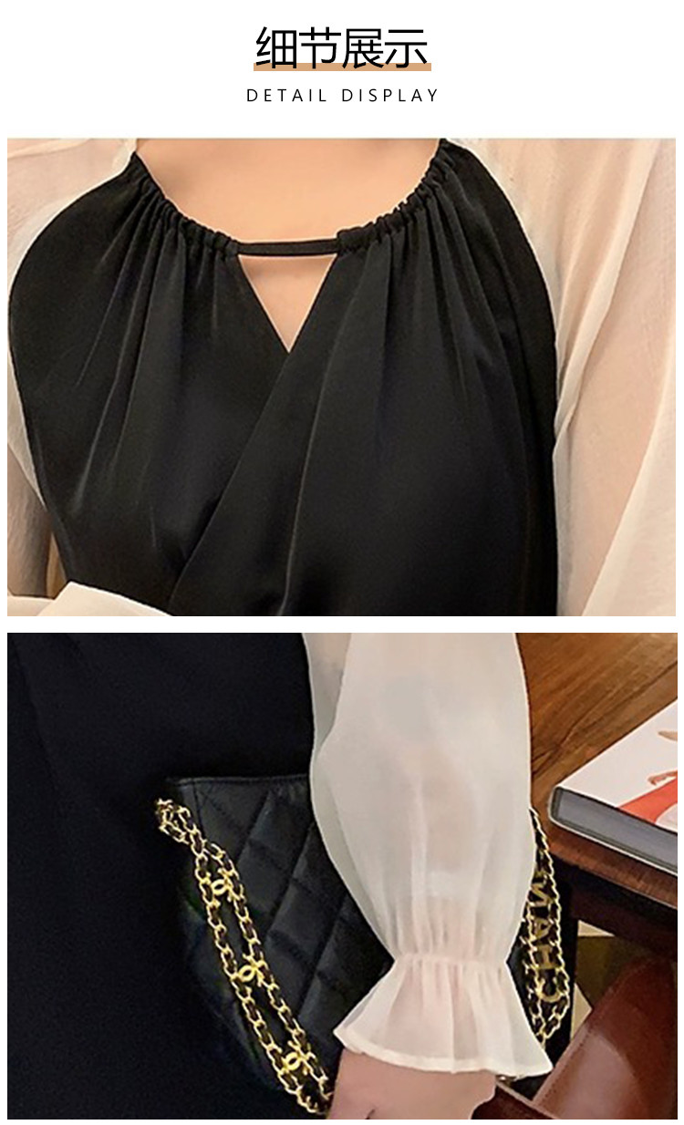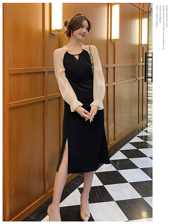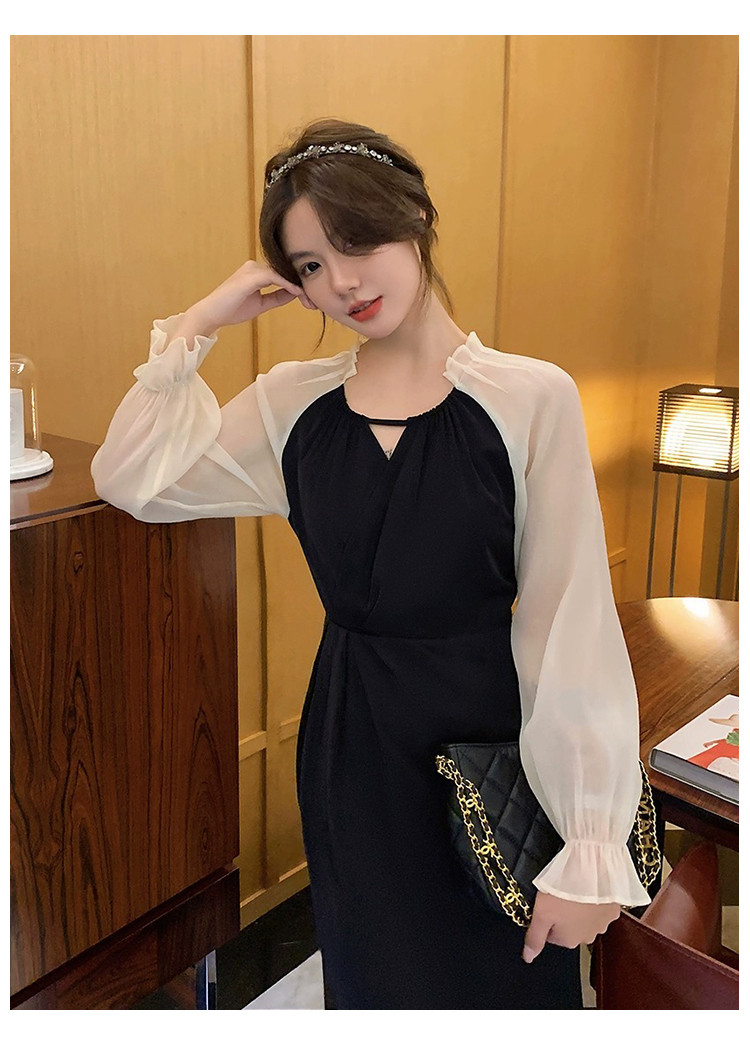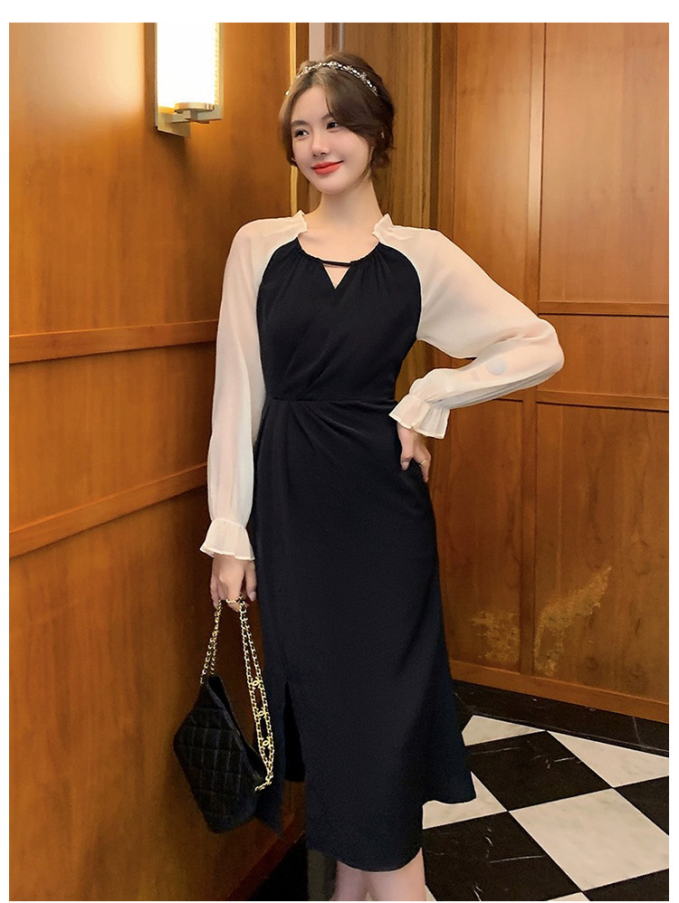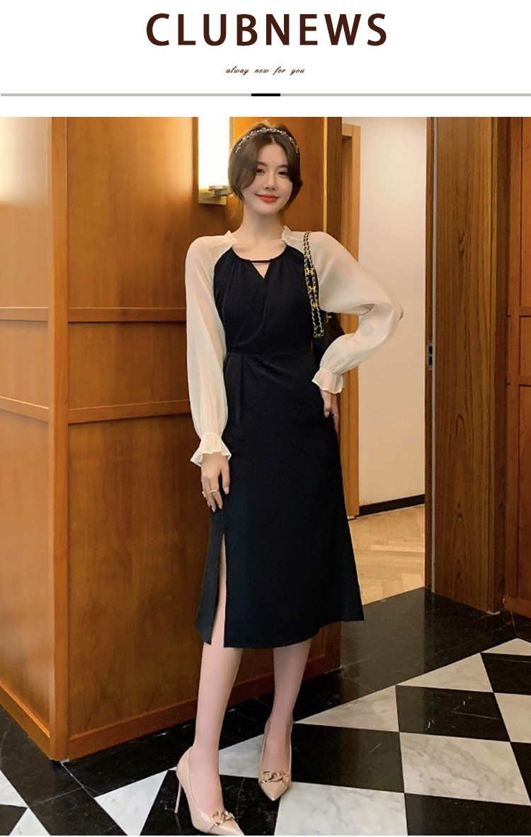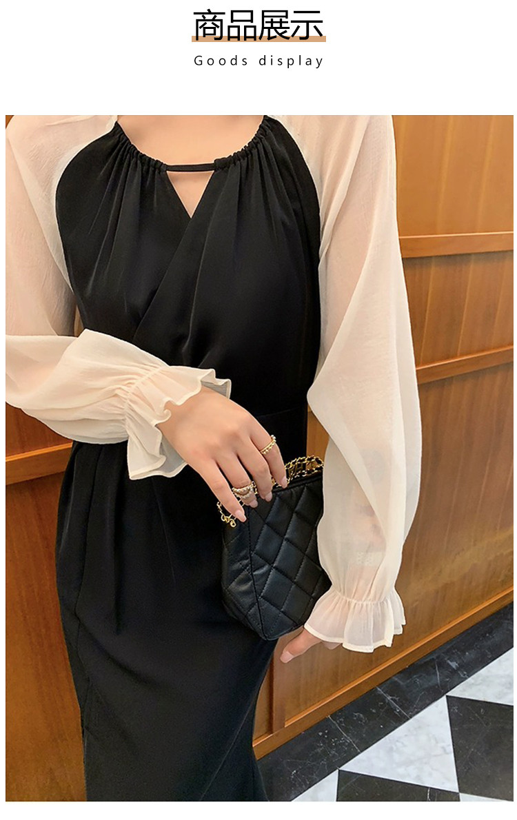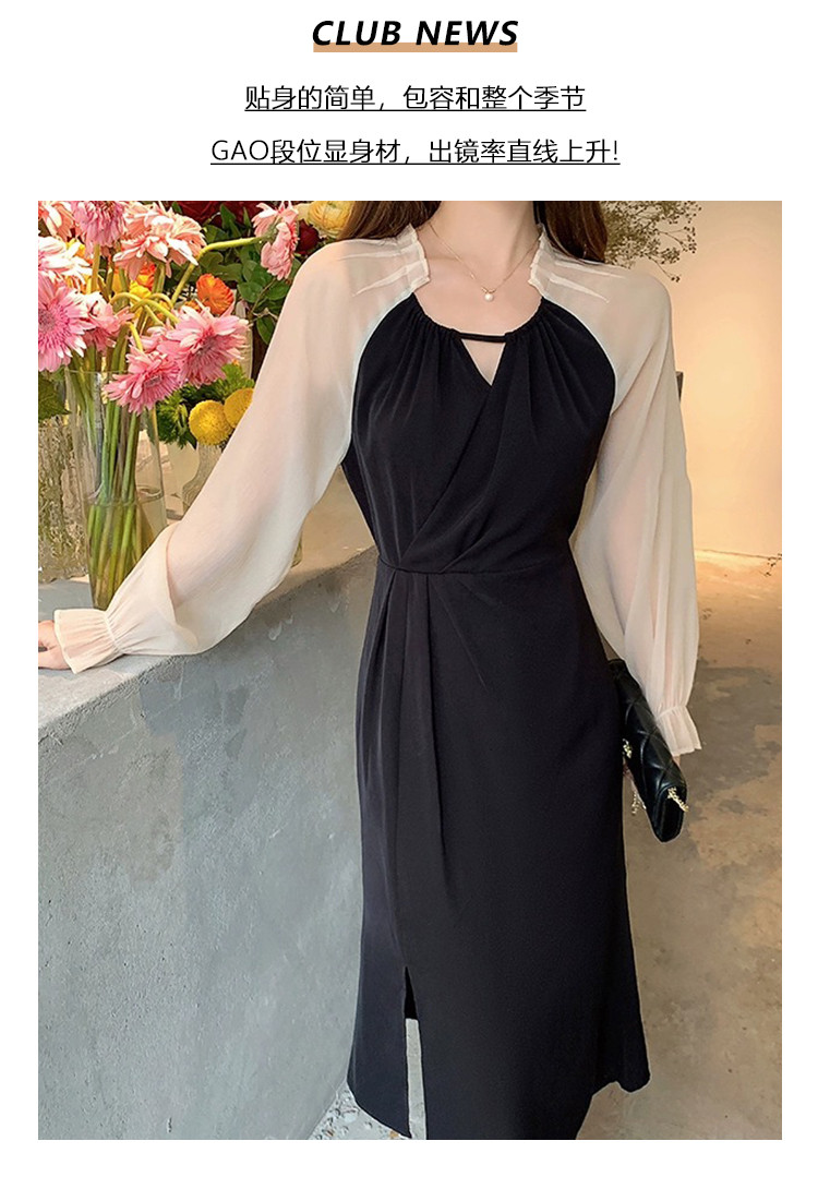 商品名称:春秋优雅气质圆领收腰拼色裙子女显瘦中长款长袖a字裙 355843