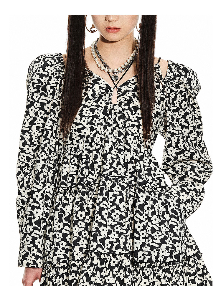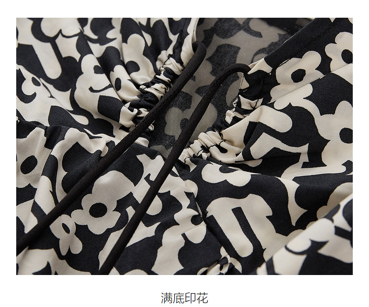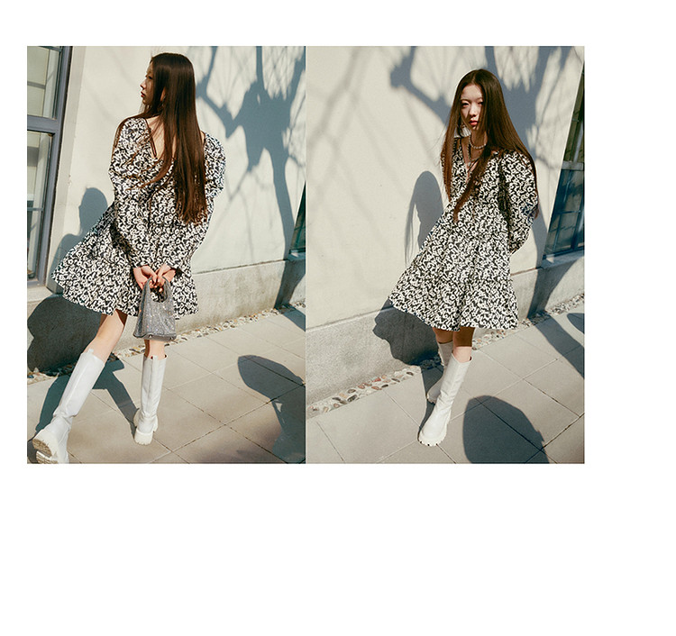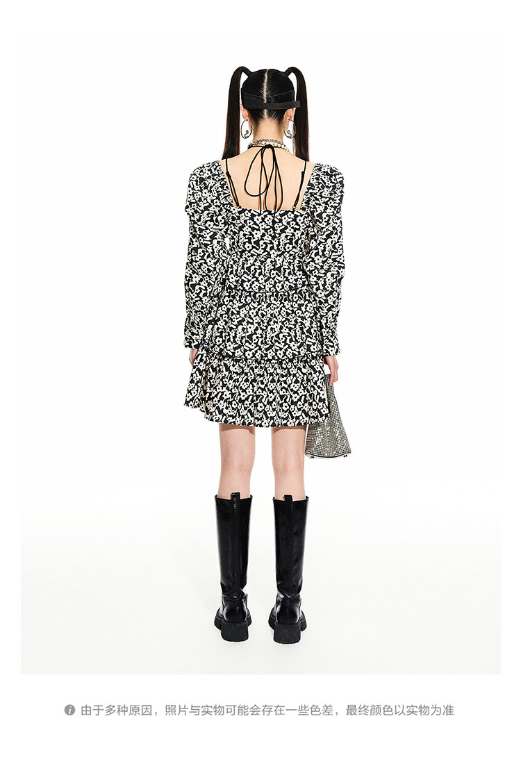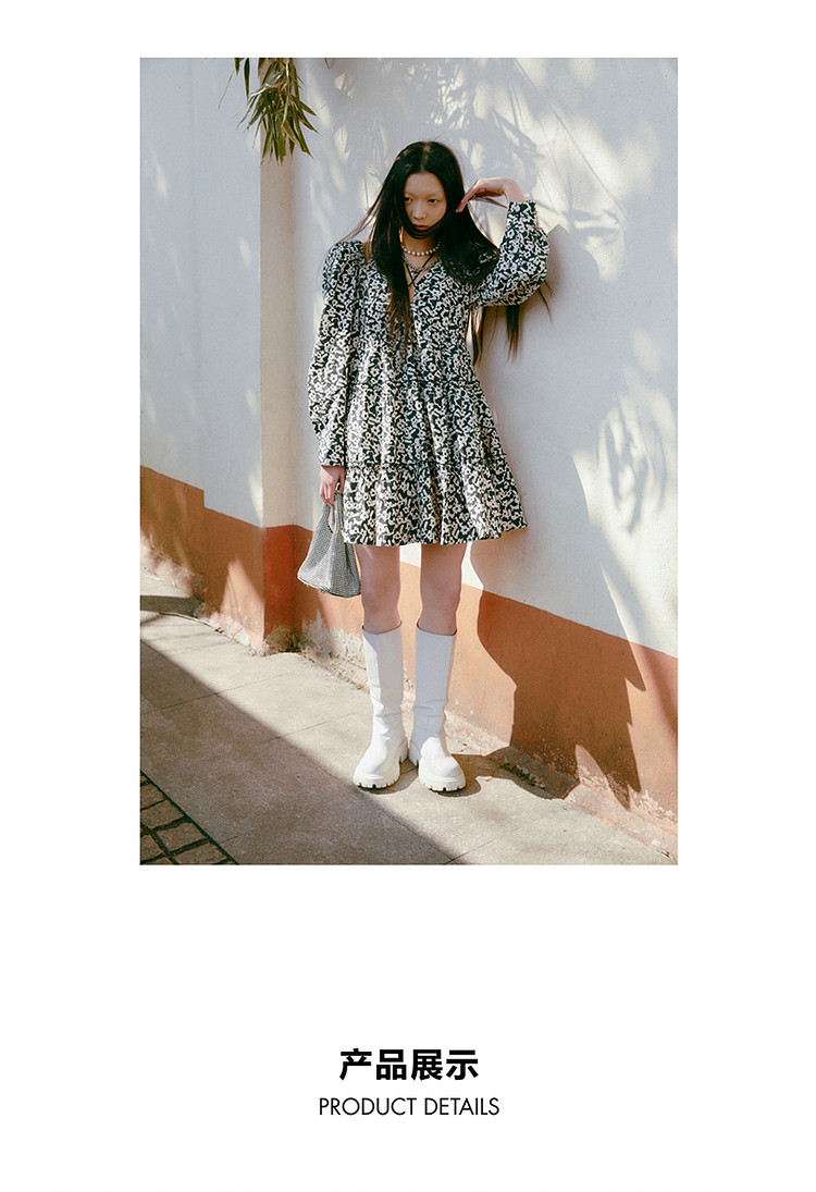 地素春秋专柜羊腿袖满底花卉印花连衣裙女 634635