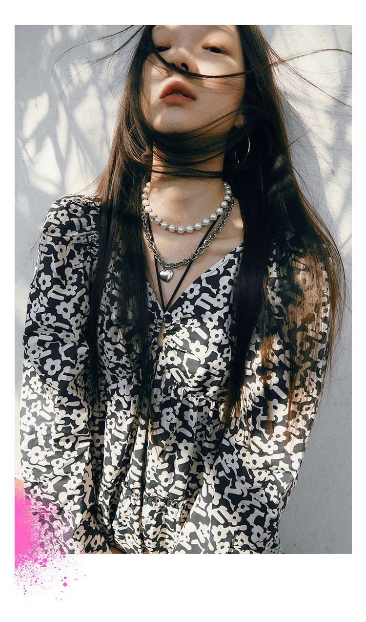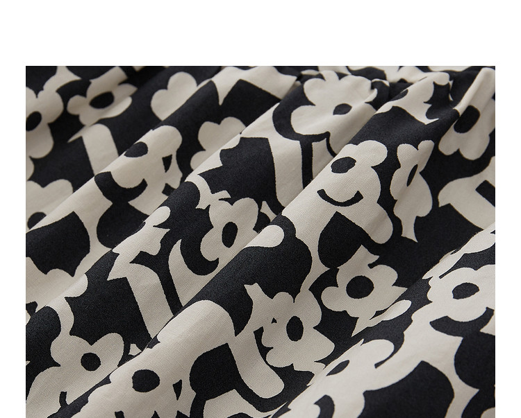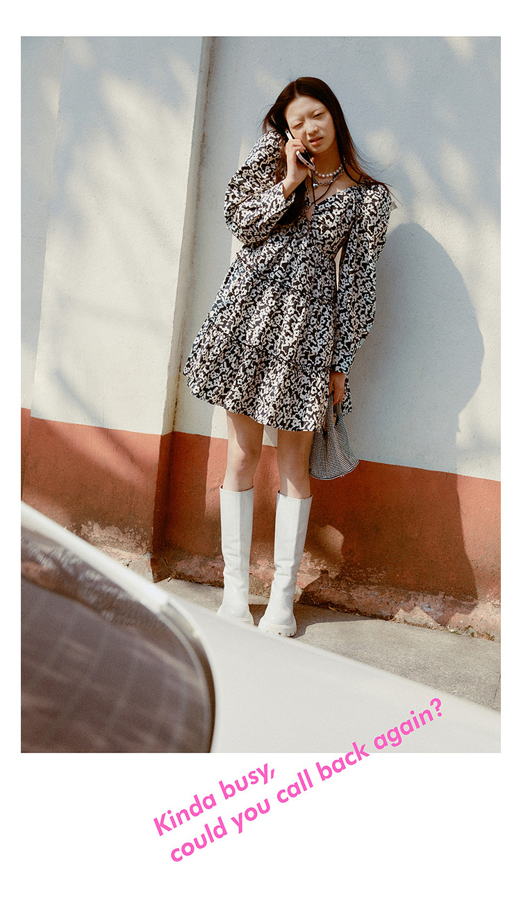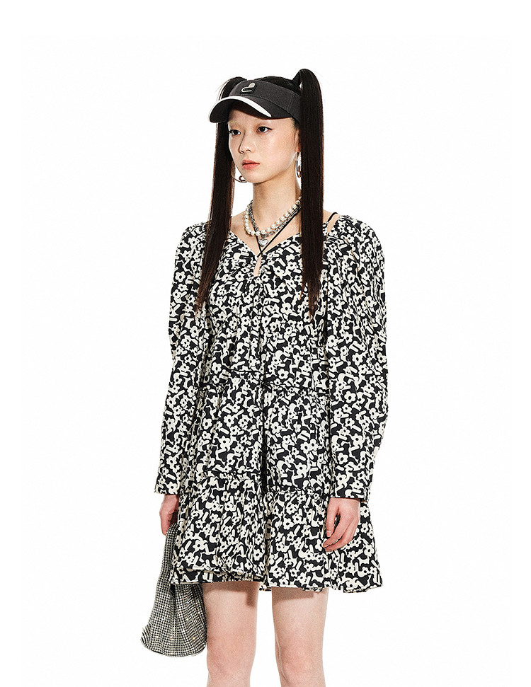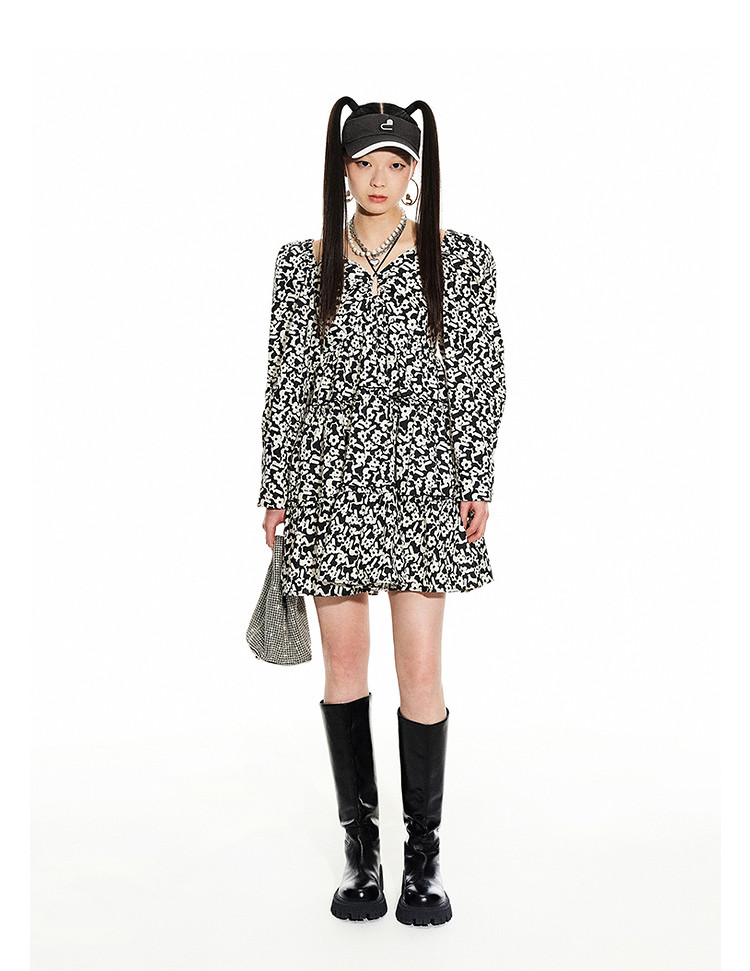 地素春秋专柜羊腿袖满底花卉印花连衣裙女 634635
