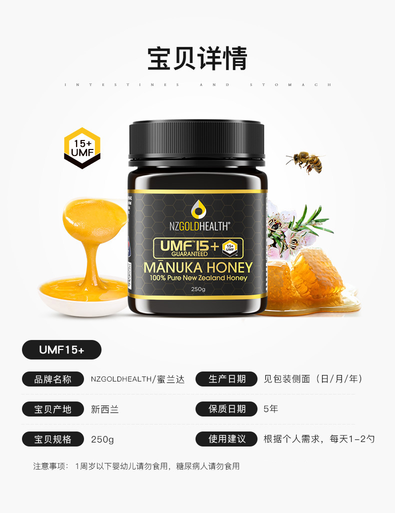 商品名称:蜜兰达 新西兰原装进口麦卢卡蜂蜜UMF15+ 250g纯正天然护胃manuka正品