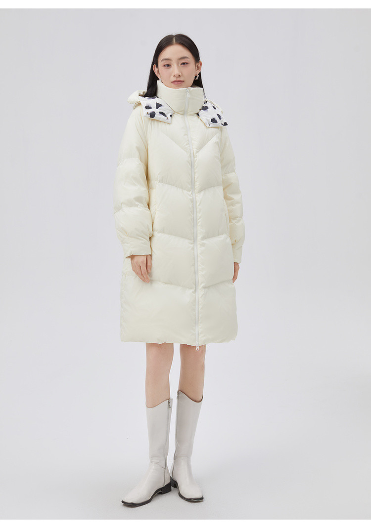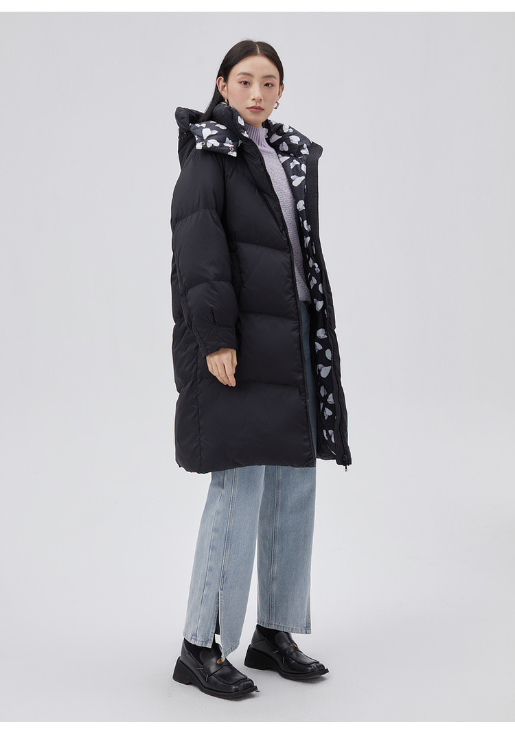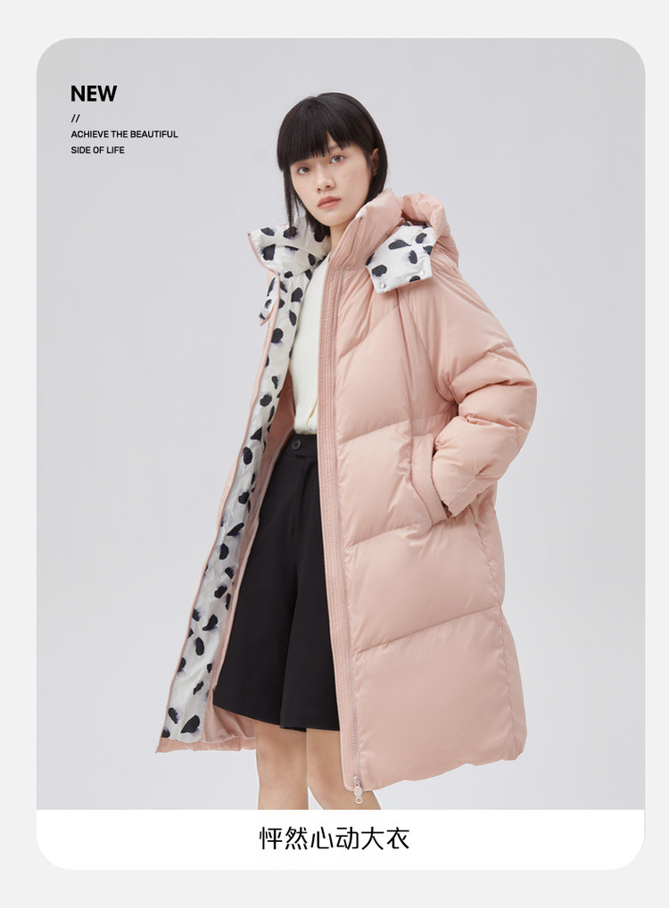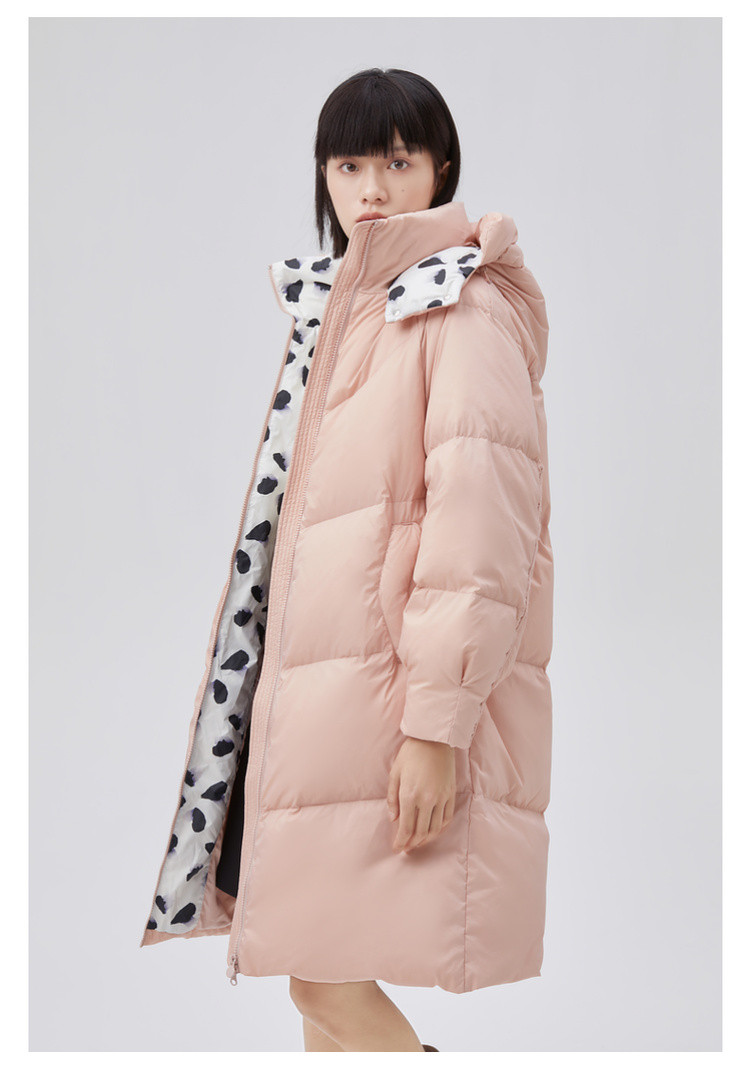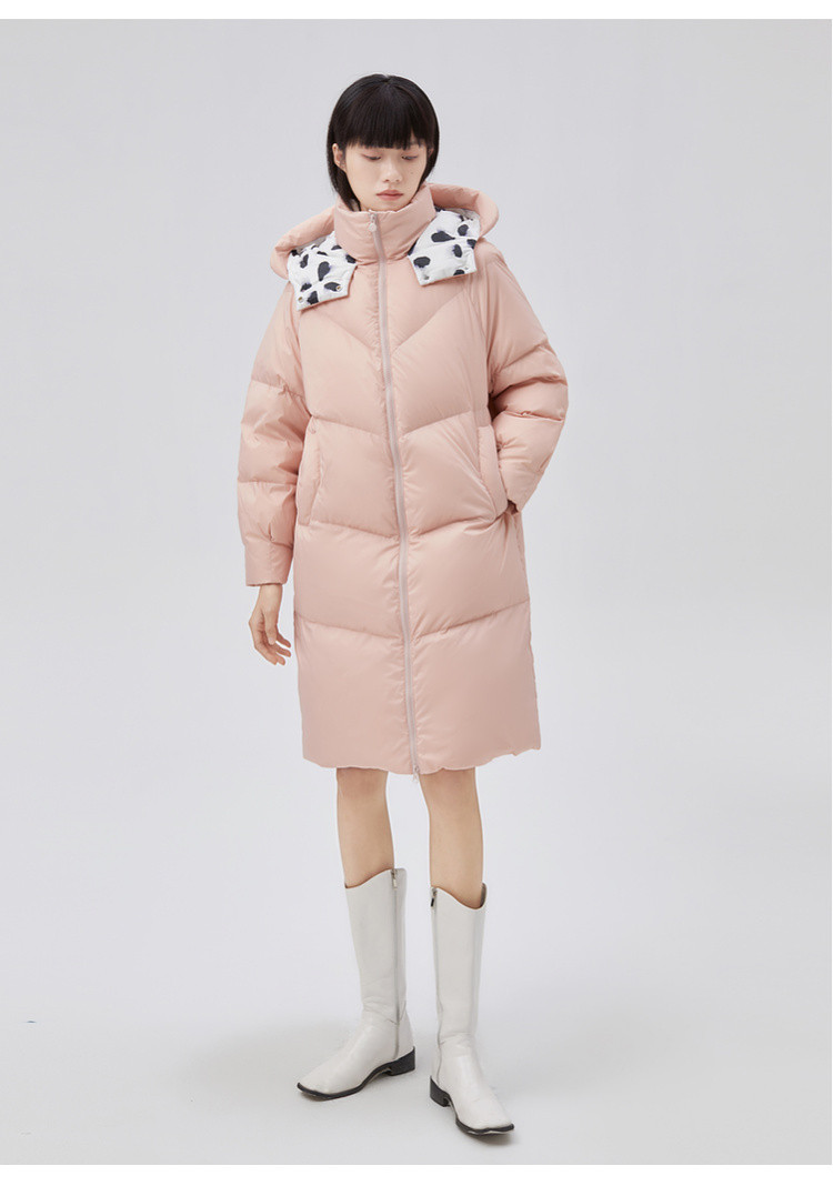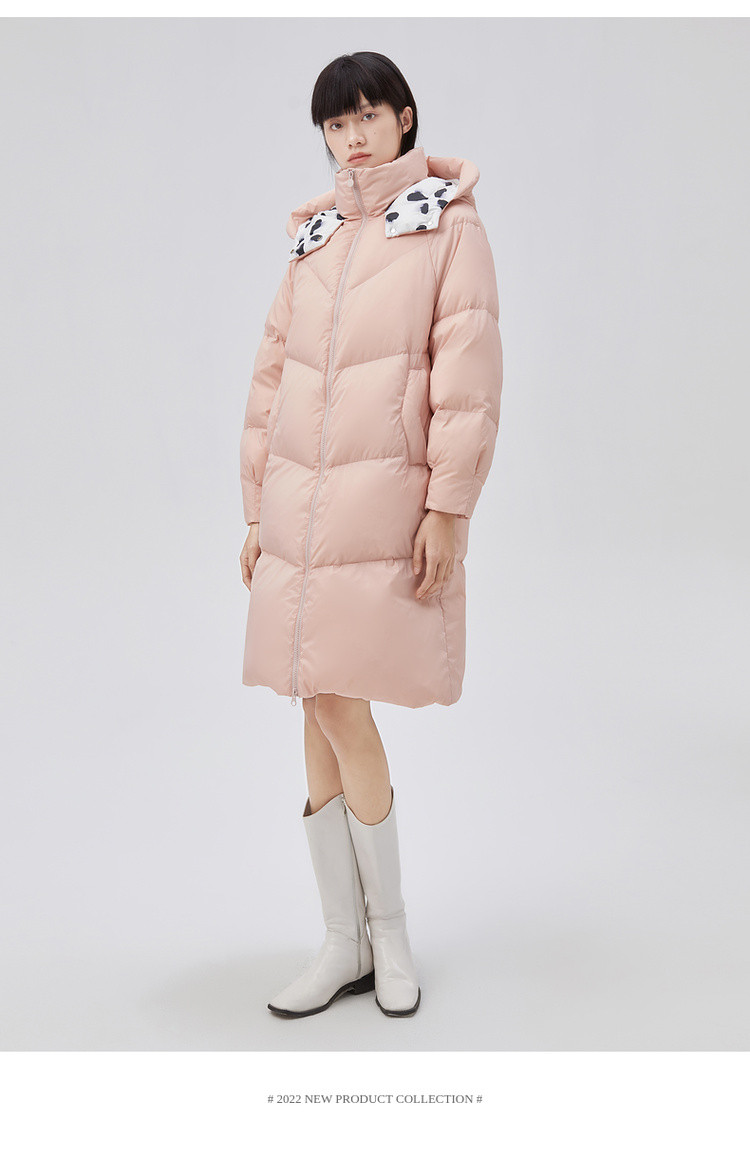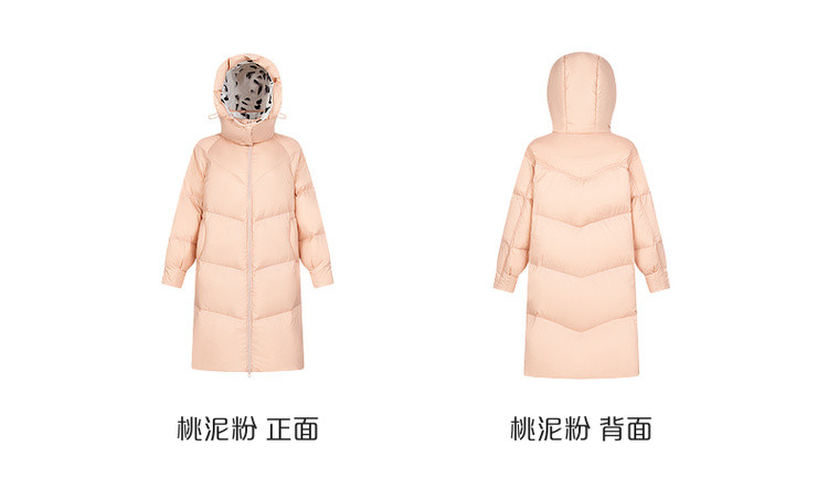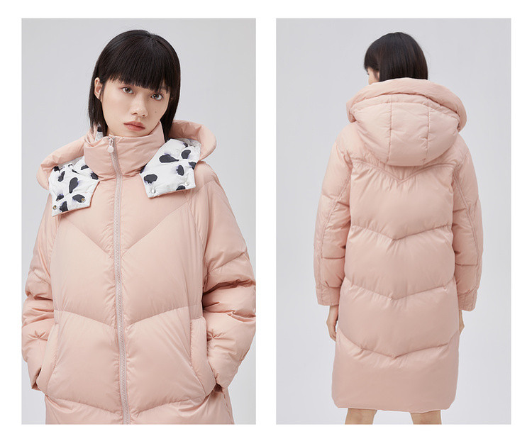 商品名称:【专柜同款】小清新印花保暖防风连帽鸭绒羽绒服女中长款 088342