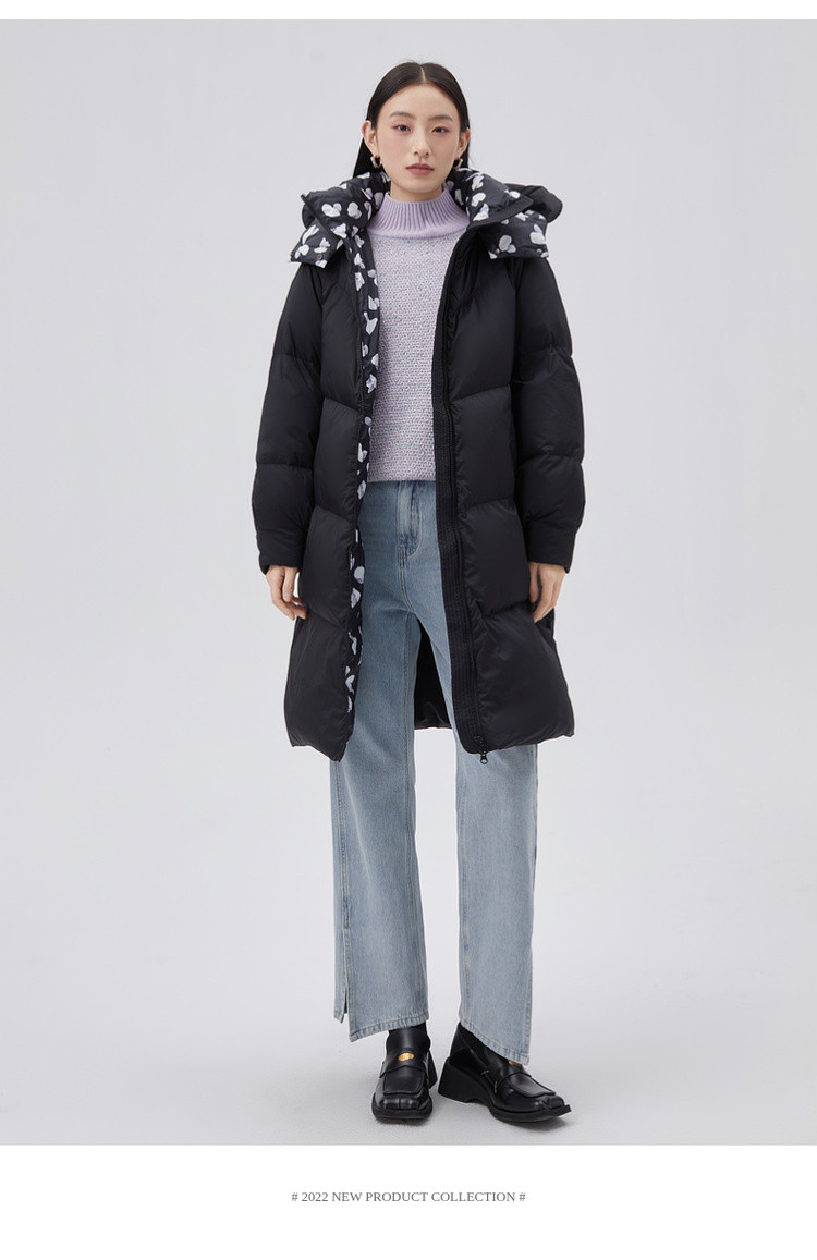 【专柜同款】小清新印花保暖防风连帽鸭绒羽绒服女中长款 088342