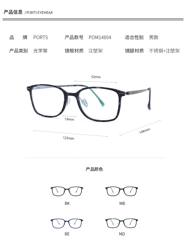 商品名称:PORTS眼镜男款时尚男款日常眼镜架光学架POM14804 305098