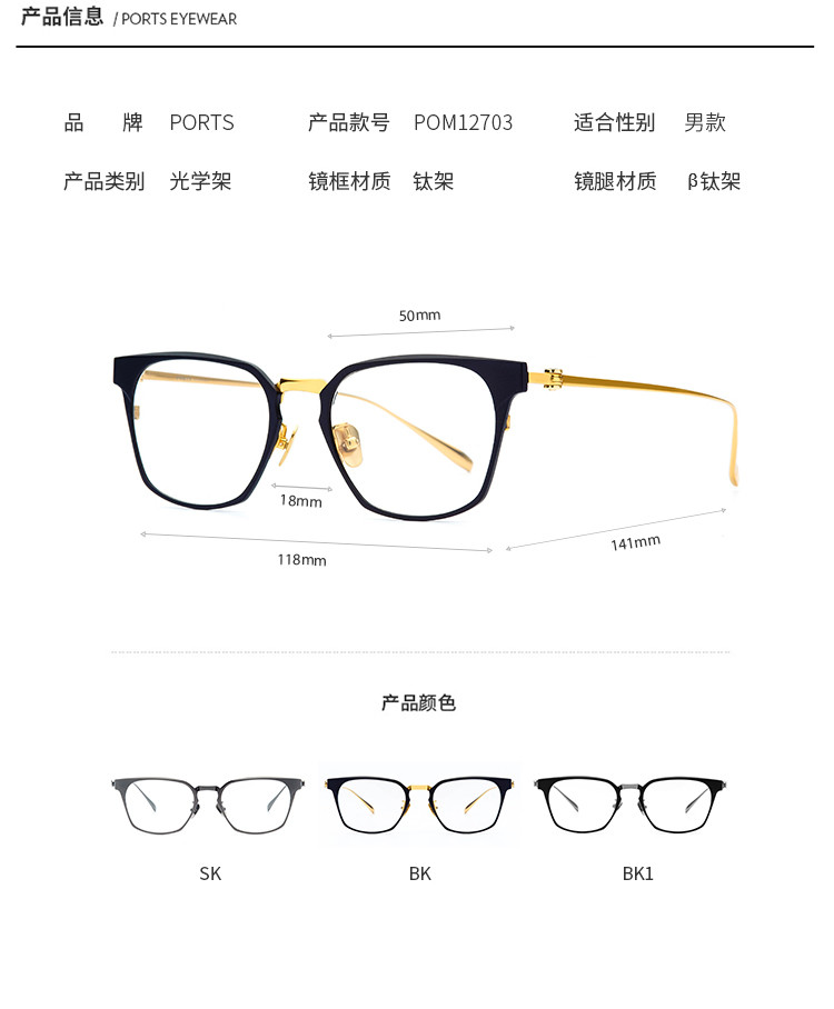 商品名称:PORTS眼镜男款板材纯钛时尚眼镜架光学架POM12703 487690