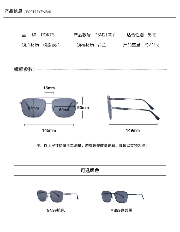 商品名称:Ports眼镜男款经典双梁商务方框太阳镜PSM21007 643850