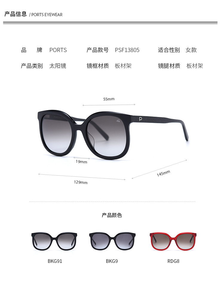 商品名称:Ports板材时尚百搭优雅女款太阳镜PSF13805 948938
