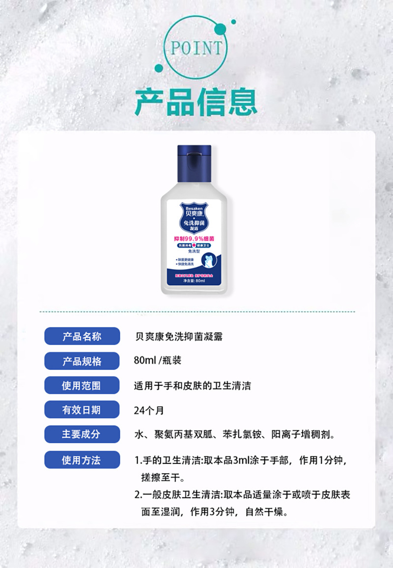 商品名称:贝爽康75%酒精防病菌免洗手凝胶皮肤家用便携室内抗菌洗手液