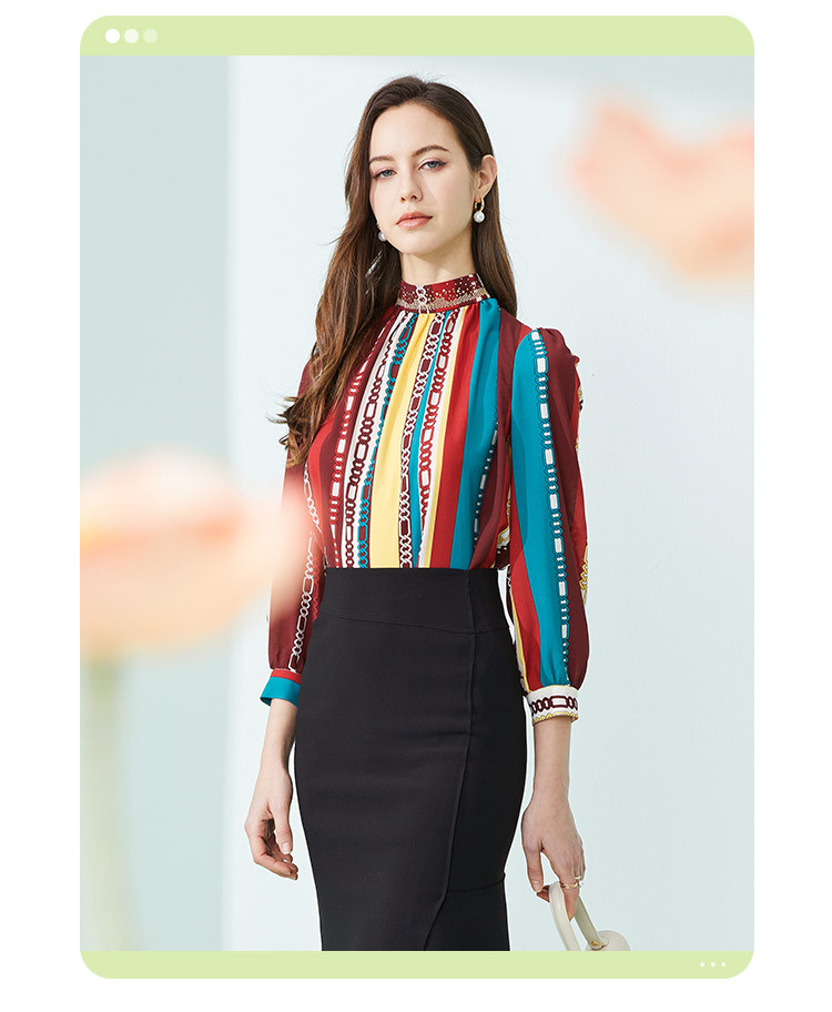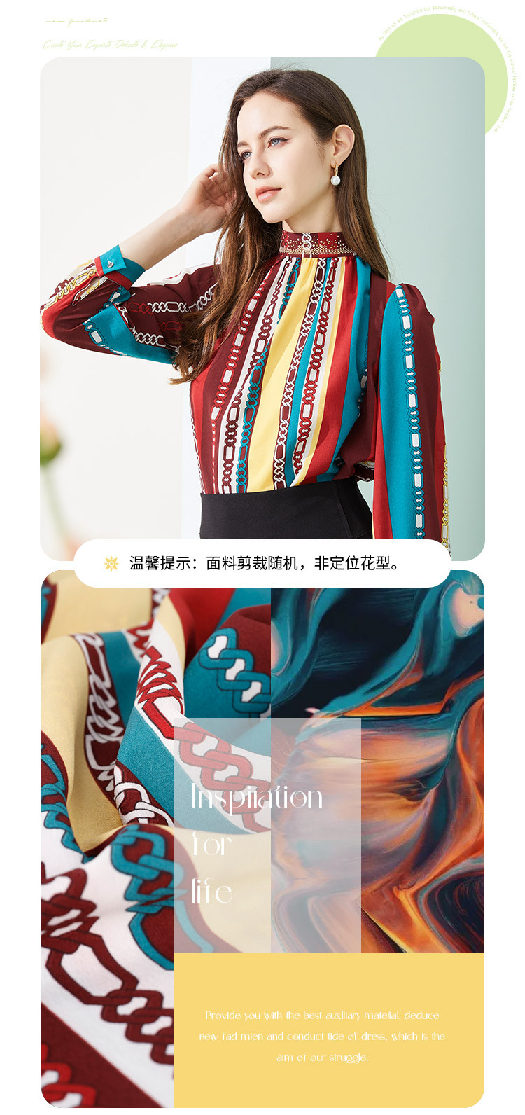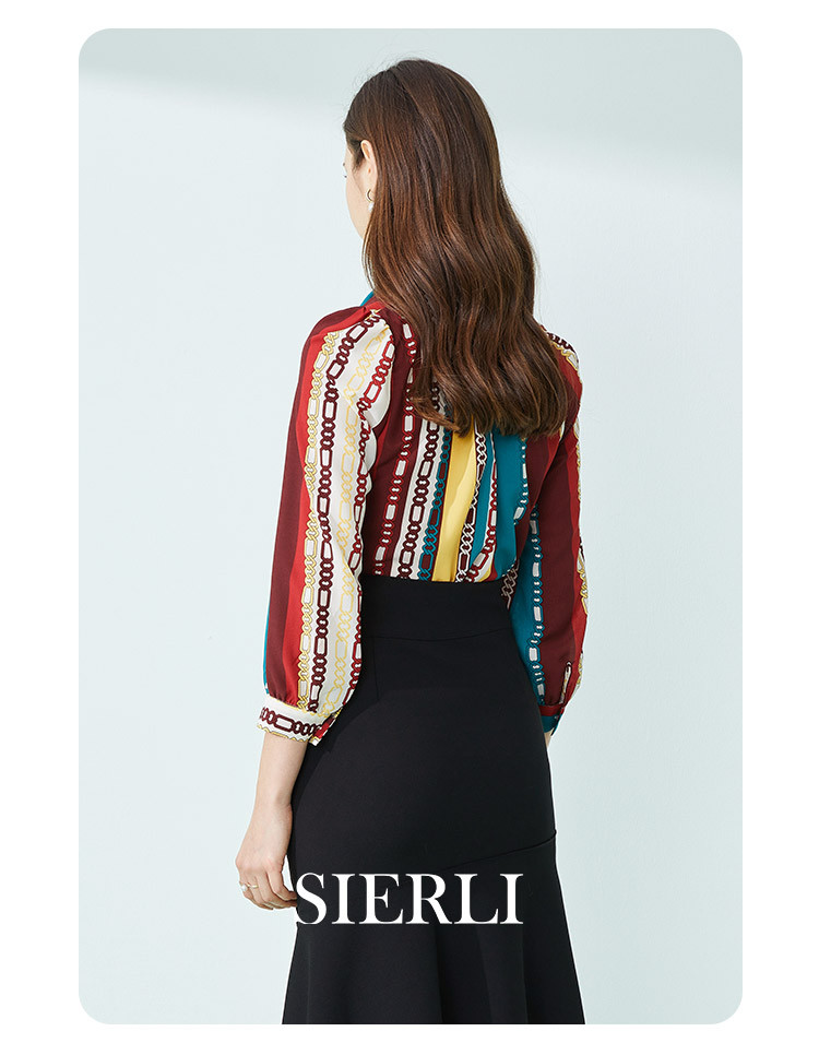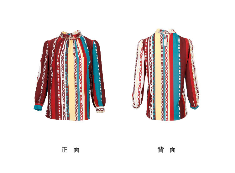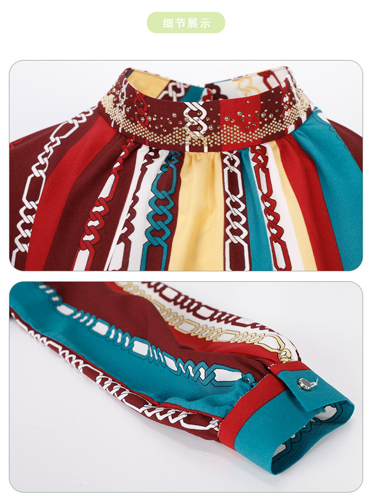 商品名称:商场同款春季气质彩色条纹链条印花优雅立领长袖衬衣 896735