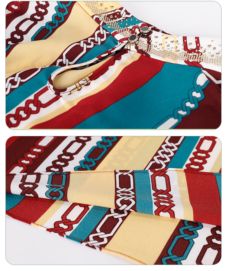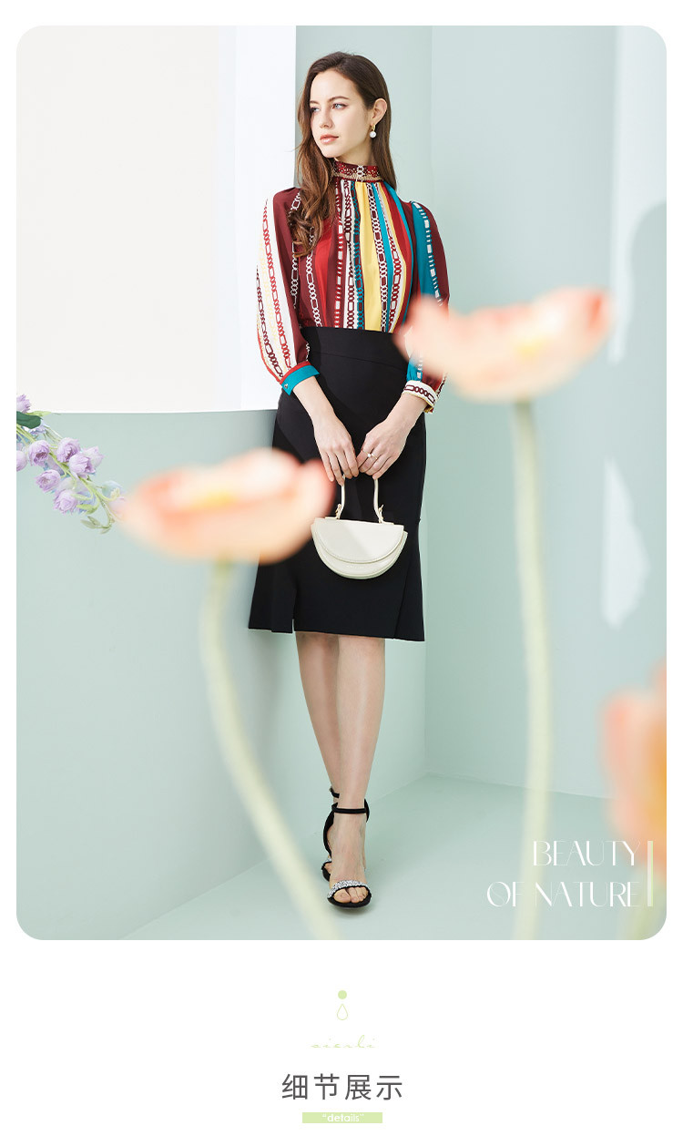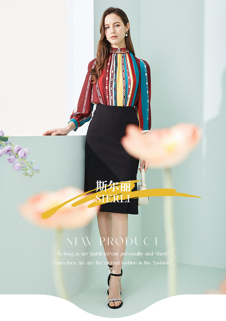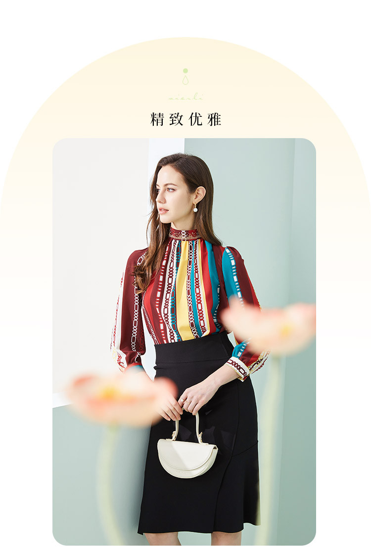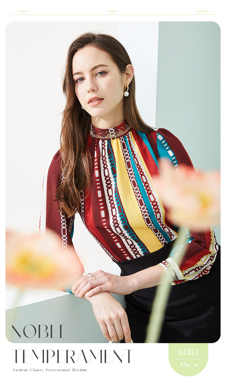 商品名称:商场同款春季气质彩色条纹链条印花优雅立领长袖衬衣 896735