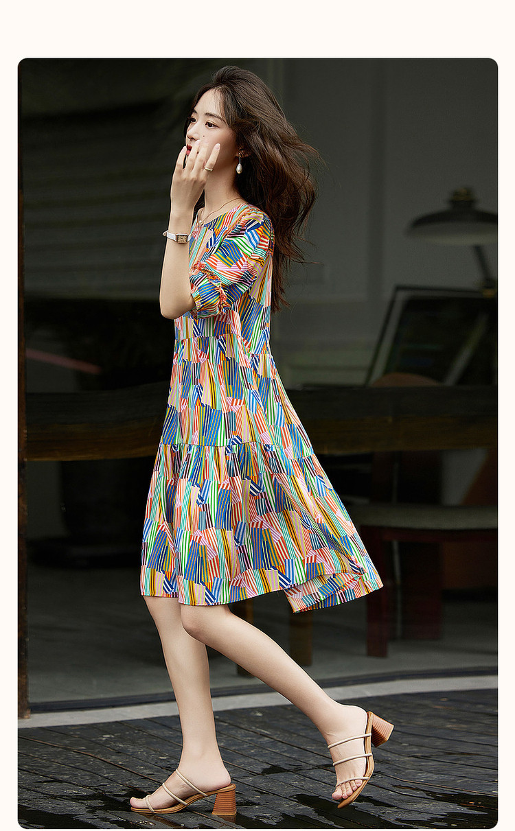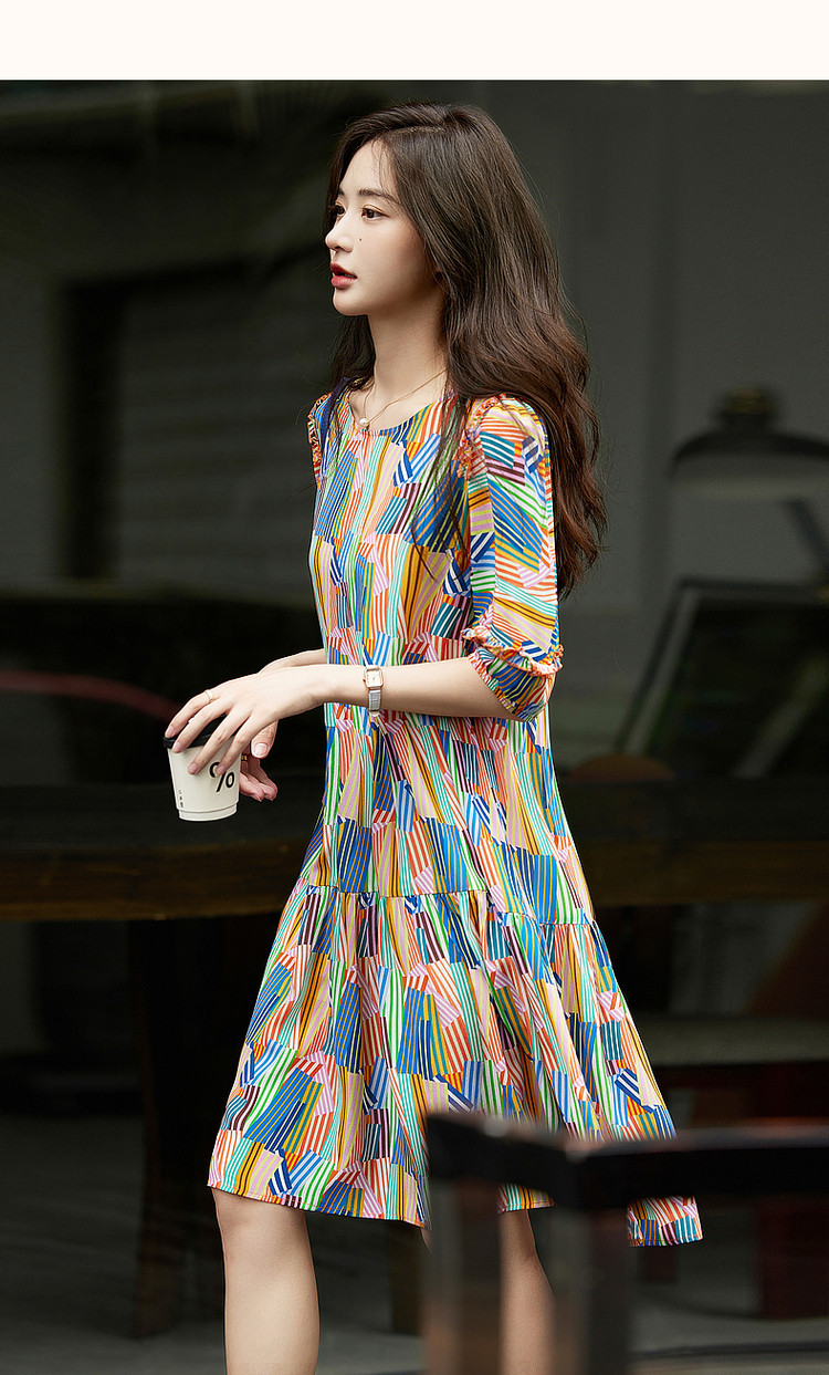【雅奢桑蚕丝蛋糕裙】春秋圆领印花a字连衣裙女中长款 372097
