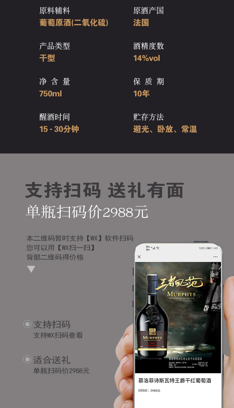 商品名称:法国进口慕洛菲诗瓦特王爵整箱750ml*6瓶装(送海马刀