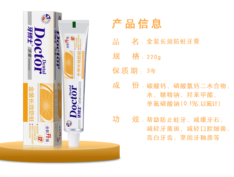 商品名称:牙博士金装长效防蛀牙膏家庭装220g