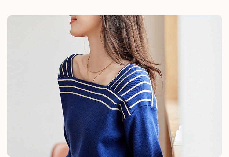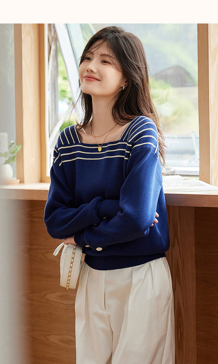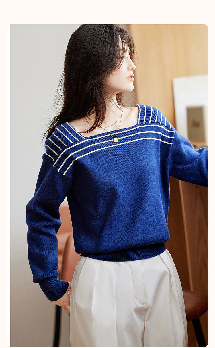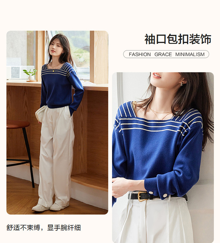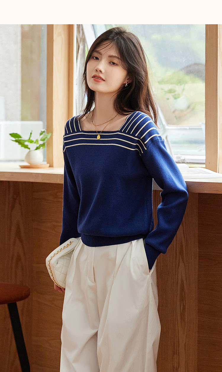 商品名称:【法式拼色复古】春秋季方领线衫长袖落肩针织衫女上衣 868481