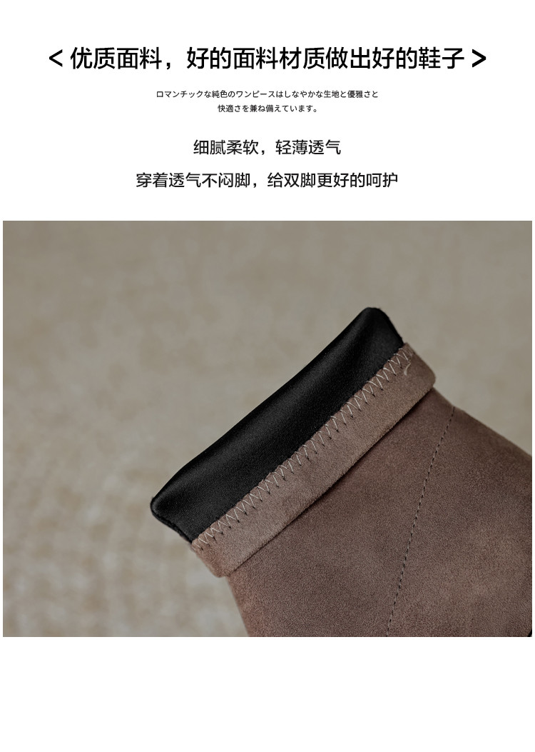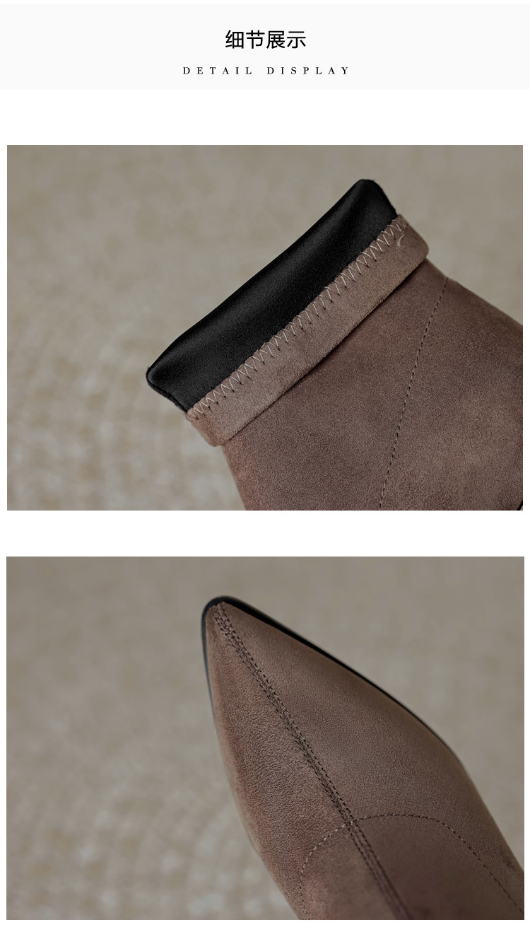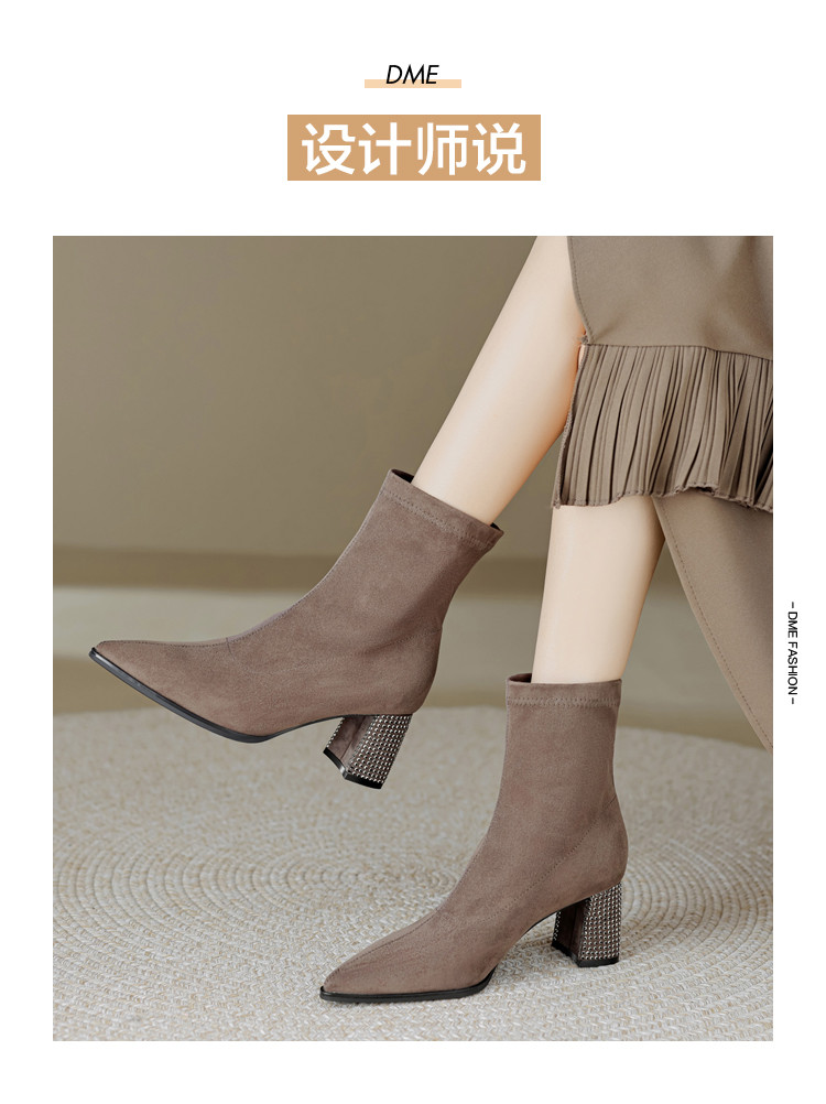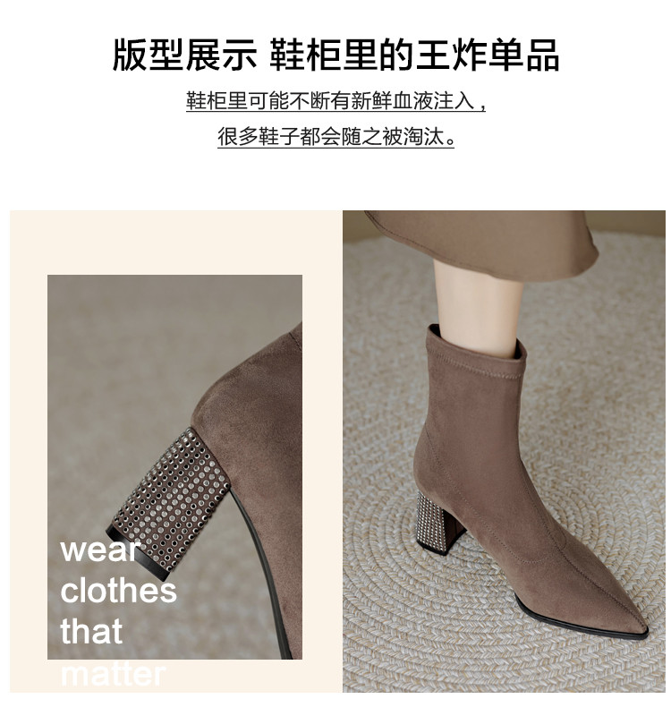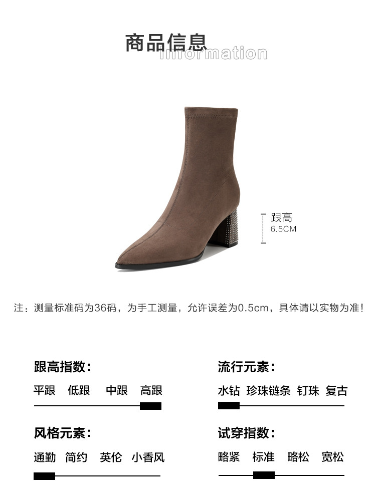 商品名称:春美拉德色系通勤百搭日常绒面水钻粗跟尖头女靴弹力靴 188865