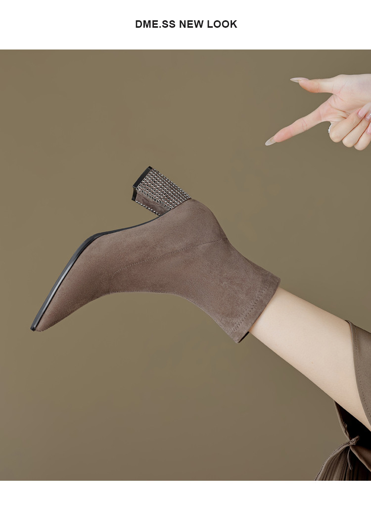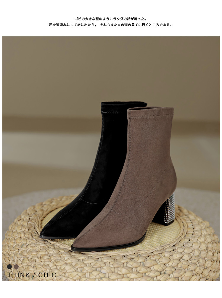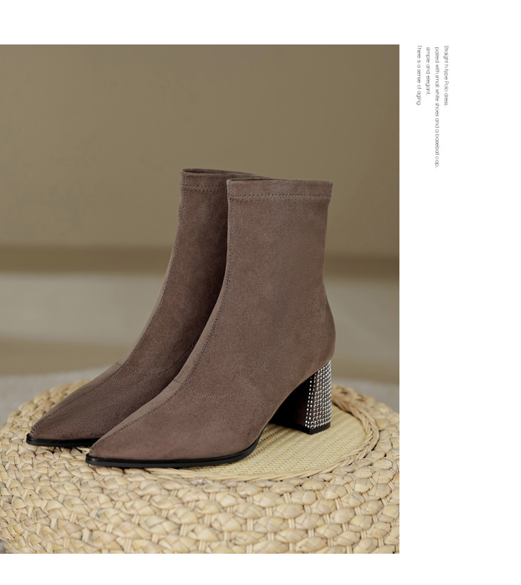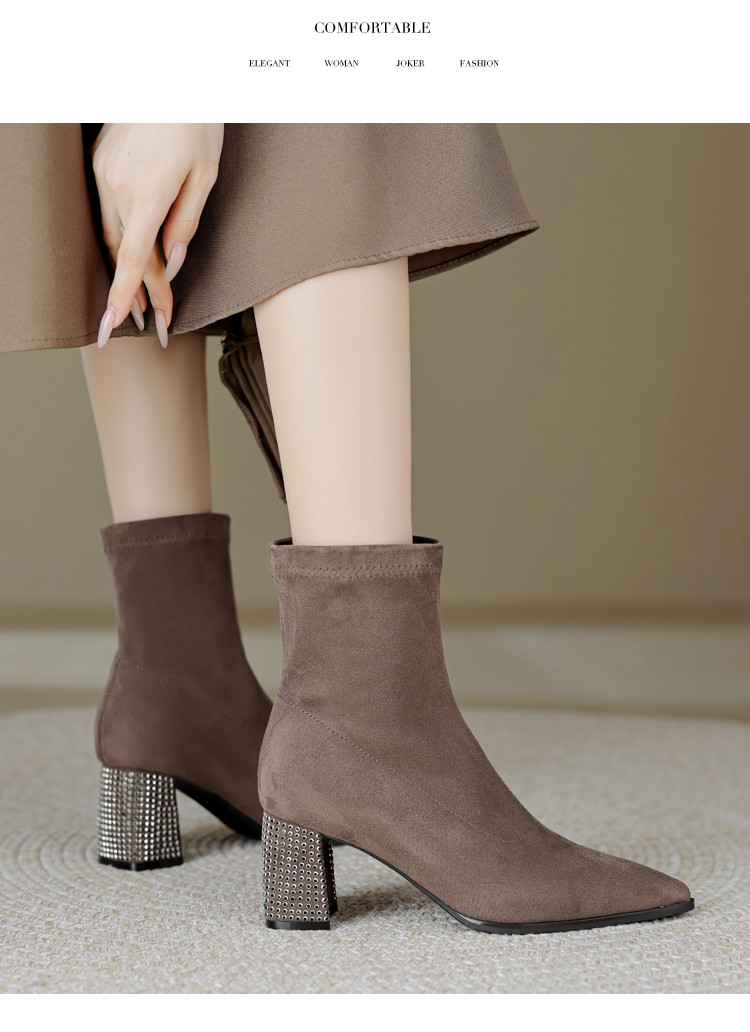 春美拉德色系通勤百搭日常绒面水钻粗跟尖头女靴弹力靴 188865